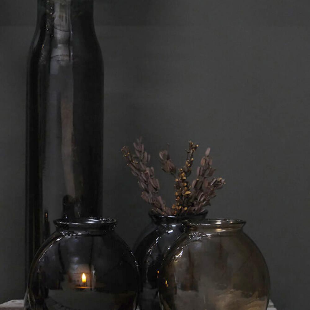 Tilføj lidt ekstra stemning med denne vase af genanvendt glas. Vasens buttede form og grå nuance, gør den til et charmerende lille indretningssupplement. Glasvasen kan også bruges til små LED-lys eller blomster, hvis du ønsker at skrue op for hyggen.