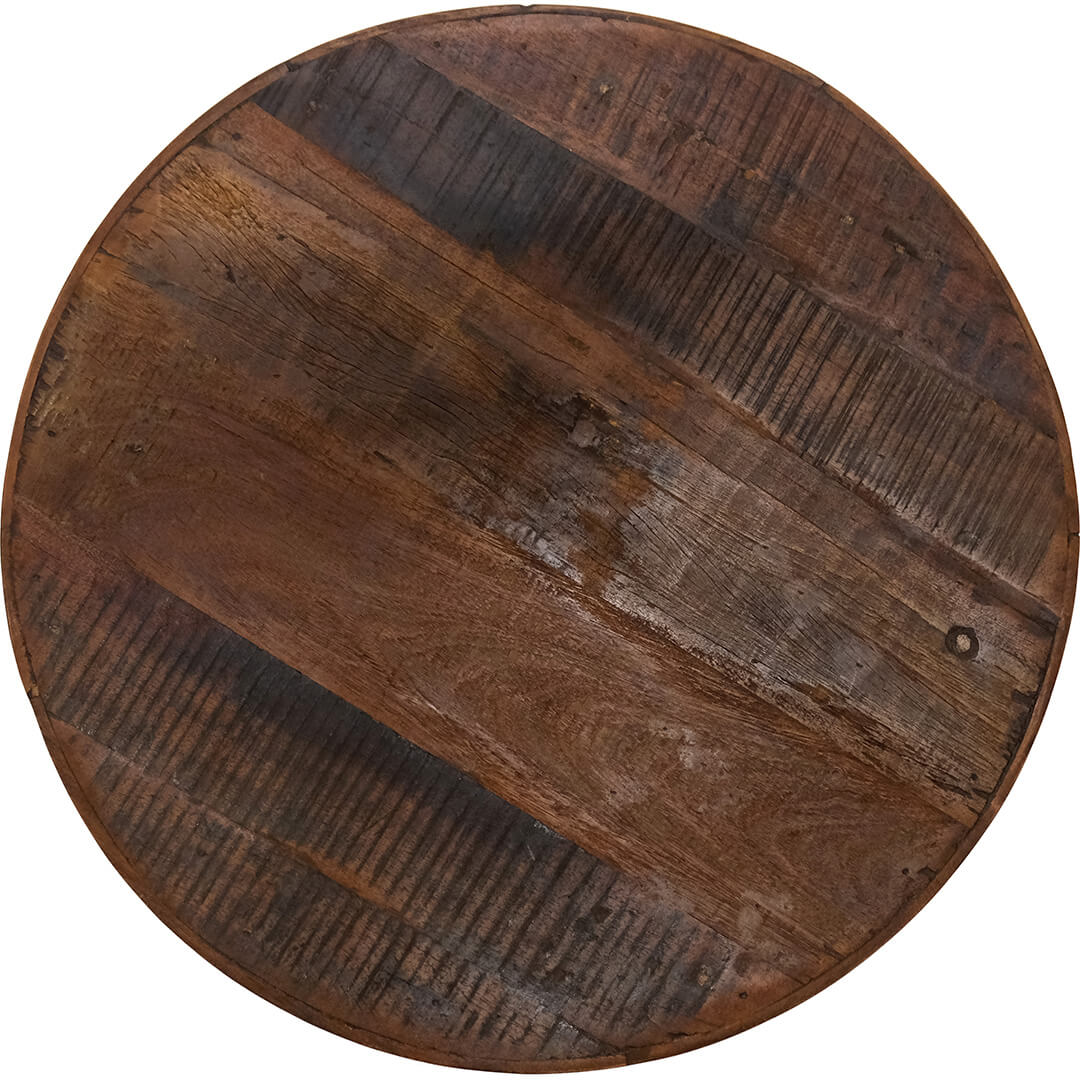 Smuk, rund bordplade i mørkt genanvendt træ. Denne smukke bordplade er perfekt til et intimt lille cafébord. Bordpladen kan også fås i en lidt større udgave med en omkreds på 70 cm. Bordpladen passer til de fleste af vores stel.