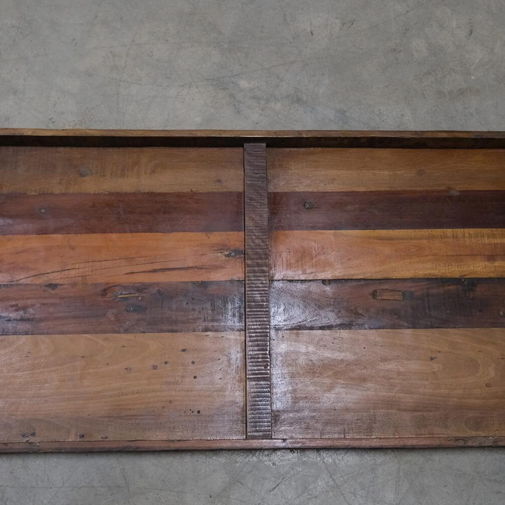 Denne bordplade på 80 x 150 cm er skabt af genanvendt træ og emmer af rustik charme. De skønne patinerede træplanker fortæller en historie gennem deres naturlige slid og farvespil, mens de dekorative jernbeslag tilfører et råt, industrielt touch. Bordpladen har en sarg, der giver ekstra karakter og understøtter det autentiske look. Perfekt til dig, der ønsker en bordplade med sjæl og kant, og som naturligvis passer til vores understel.