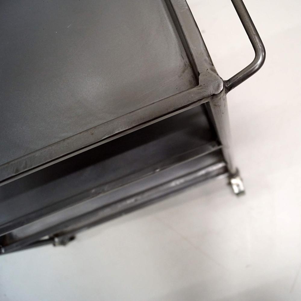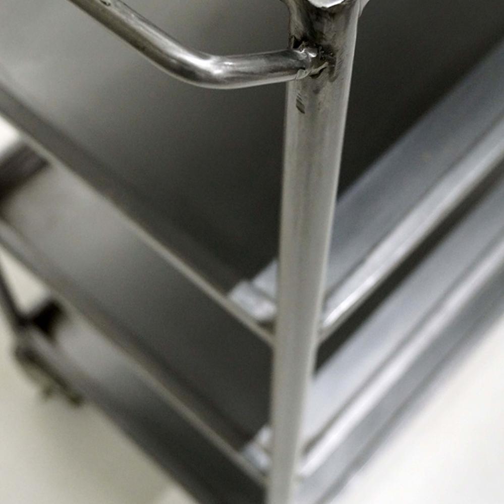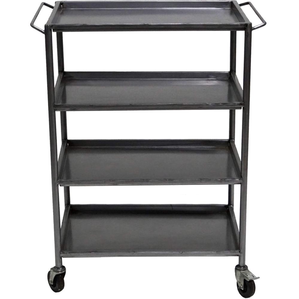 Dette rå og praktiske rullebord er fremstillet i solidt jern og udstyret med fire rummelige hylder, der giver masser af plads til opbevaring eller udstilling. De to håndtag i siderne gør det let at flytte rundt, mens de fire drejelige hjul giver fuld fleksibilitet. Perfekt både i køkken, stue, butik eller værksted. Den industrielle stil med den mørke metaloverflade gør bordet nemt at kombinere med både moderne og rustikke indretninger. Brug det som barvogn, plantebord, kreativ arbejdsstation eller som et mobilt udstillingsmøbel. Et robust og funktionelt møbel, der er lige så anvendeligt, som det er dekorativt.