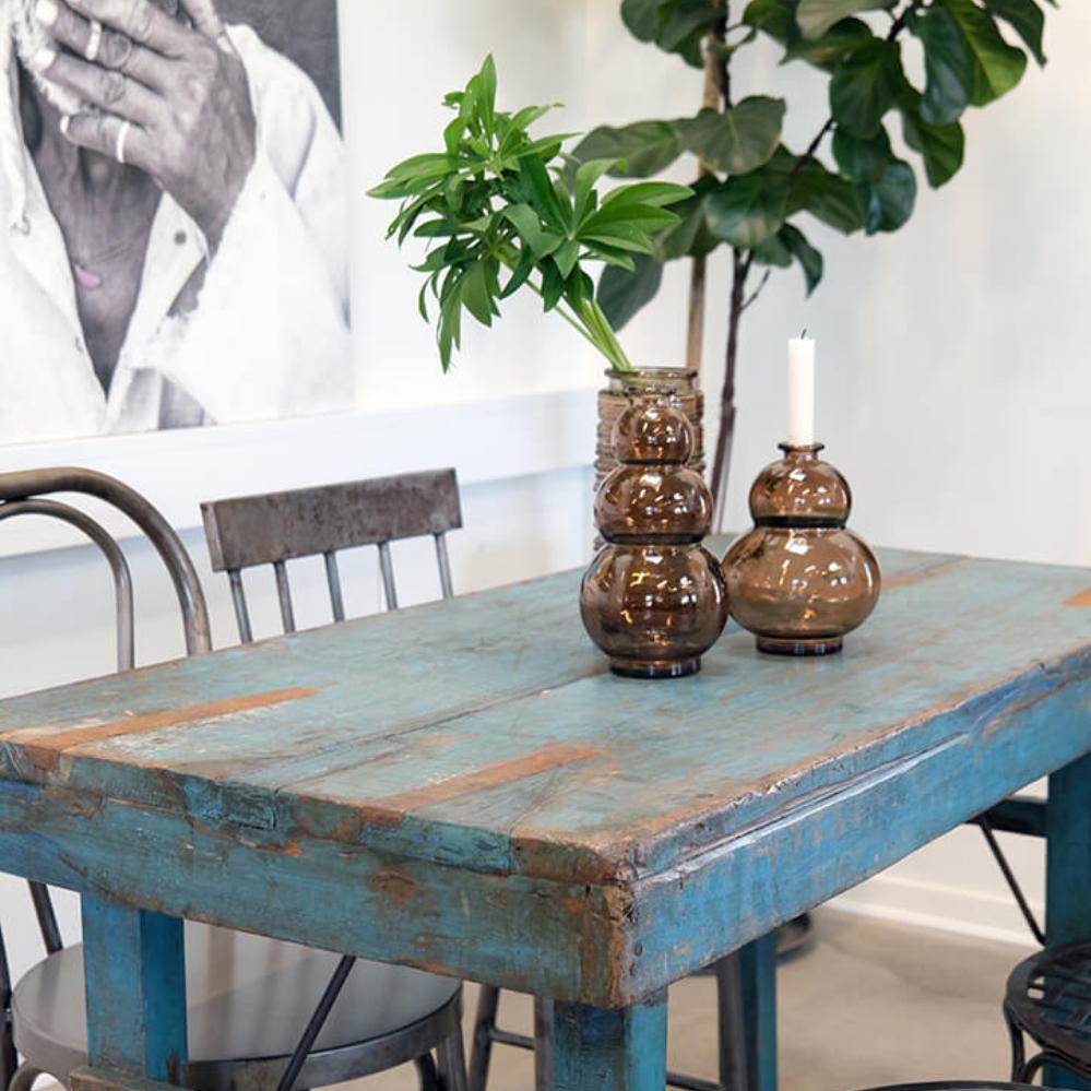 Dette lille spisebord er en sand perle til dem, der sætter pris på genbrug og rustikt håndværk. Bordet er fremstillet af genanvendt træ, der bringer sin helt egen historie med sig, og dets blå nuance giver det et karakteristisk udtryk. Det rå look fra det genanvendte træ og den robuste konstruktion gør det perfekt til mindre spiseområder, hvor pladsen er begrænset, men hvor personlighed er i højsædet. Dette bord passer både til det moderne hjem og til dem, der søger et strejf af rå charme.