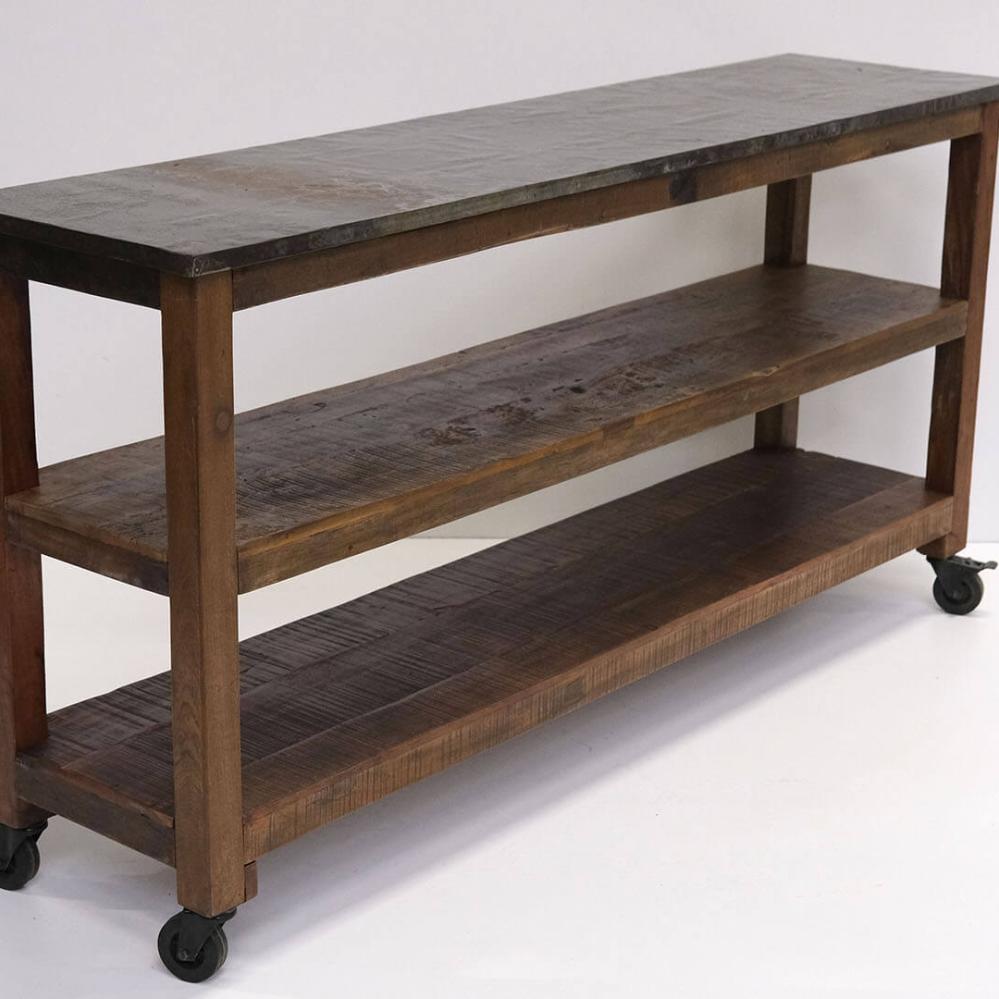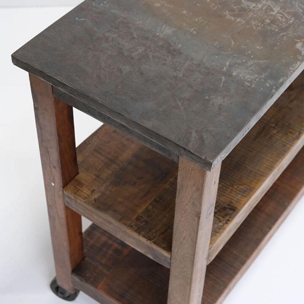Lækkert konsolbord i genanvendt træ med metaltop og hjul. Konsolbordet har 2 hylder, så der er rigeligt plads til opbevaring. Konsolbordet er meget velegnet som plantebord, men vil også være utrolig skønt på badeværelset, køkkenet eller som rumdeler i en restaurant.
