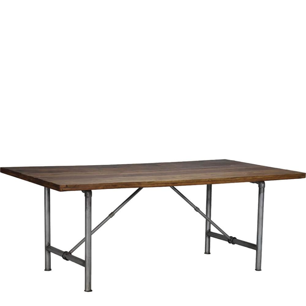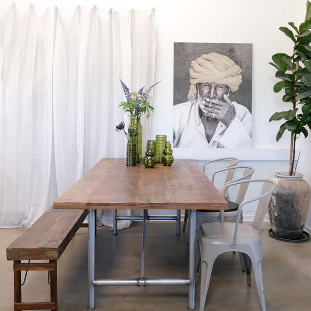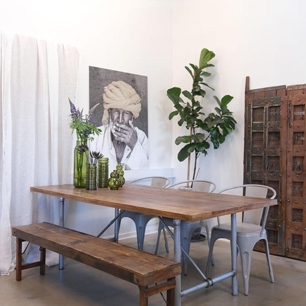 Dette spisebord er lavet af genanvendt træ og understøttet af robuste jernrør, hvilket giver det et råt og industrielt look. Træet har naturlige patineringer, der fremhæver bordets autentiske karakter og tilføjer charme til dit køkken eller din restaurant. De rustikke jernrør som bordben bidrager til bordets stabilitet og understreger dets rå og maskuline design. Perfekt til både moderne og vintageinspirerede indretninger, hvor det vil fungere som et rustikt og funktionelt midtpunkt.