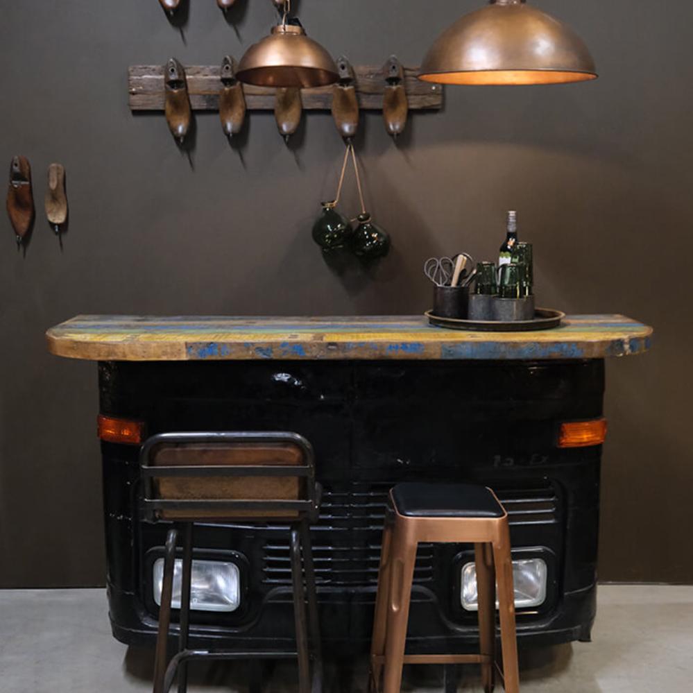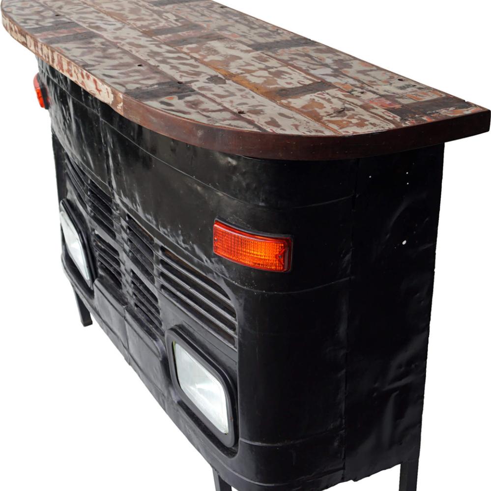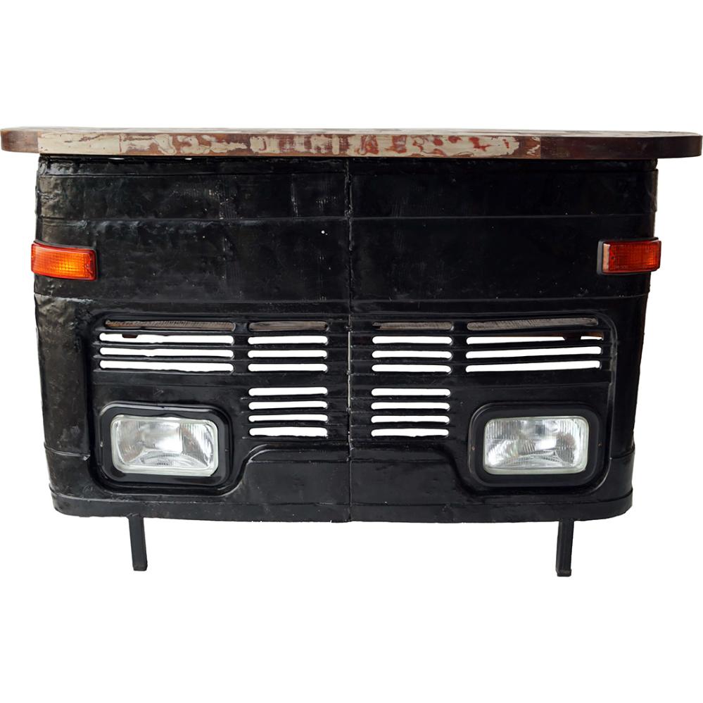 Sjov og anderledes bar med et maskulint udtryk. Baren er fremstillet af fronten fra en gammel lastbil af mærket TATA. Fronten er sortmalet og med bordplade fremstillet i genanvendt træ. Der er god plads til opbevaring, da der inde i baren er en lang hylde. Baren kan både bruges i herrerummet i din private bolig, men er også et godt blikfang i din business. Baren vil tilføre din indretning i din café, restaurant, kaffebar eller tøjforretning et sjovt og anderledes råt look. Til dig der ønsker at tilføre noget unikt til din indretning.