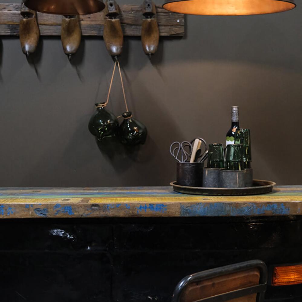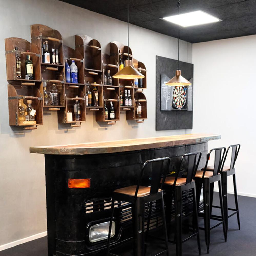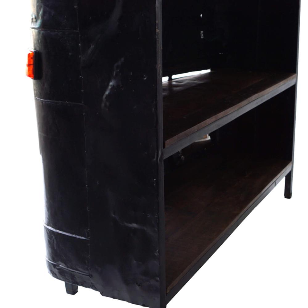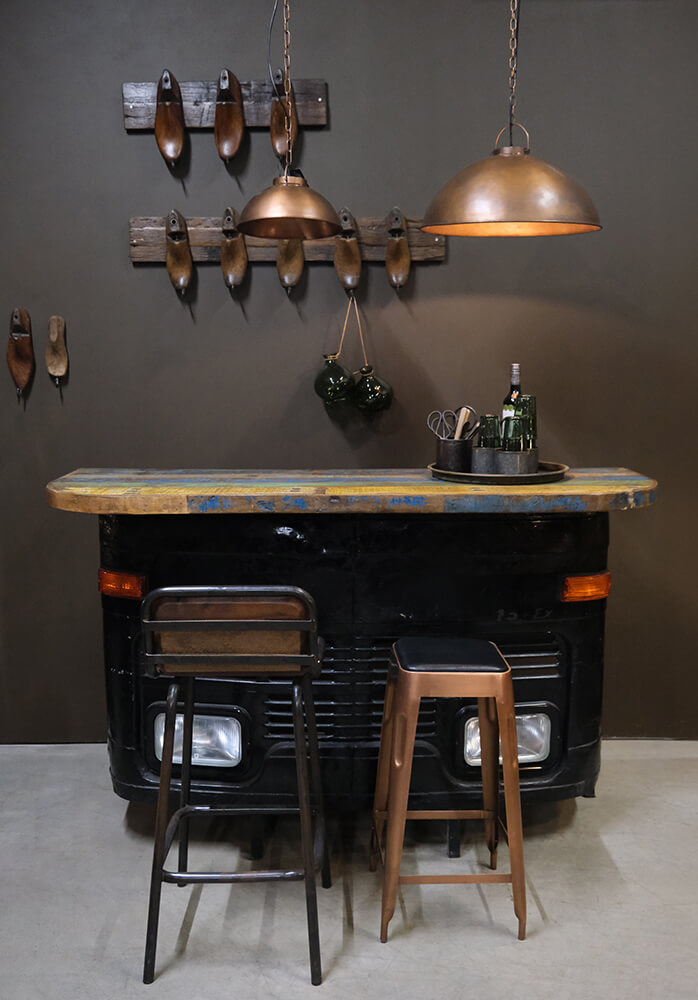 Sjov og anderledes bar med et maskulint udtryk. Baren er fremstillet af fronten fra en gammel lastbil af mærket TATA. Fronten er sortmalet og med bordplade fremstillet i genanvendt træ. Der er god plads til opbevaring, da der inde i baren er en lang hylde. Baren kan både bruges i herrerummet i din private bolig, men er også et godt blikfang i din business. Baren vil tilføre din indretning i din café, restaurant, kaffebar eller tøjforretning et sjovt og anderledes råt look. Til dig der ønsker at tilføre noget unikt til din indretning.