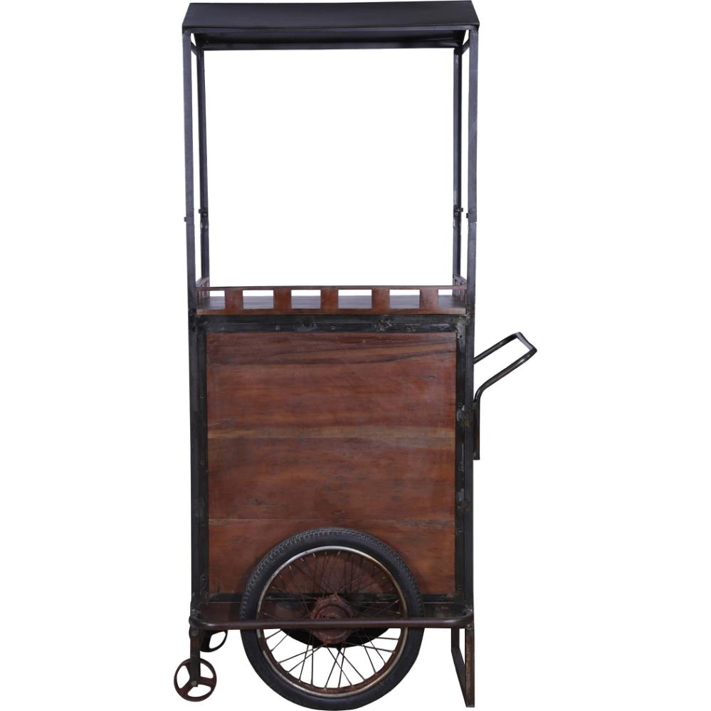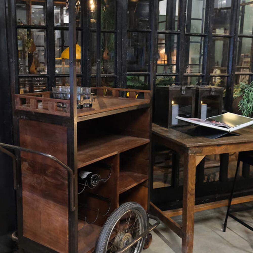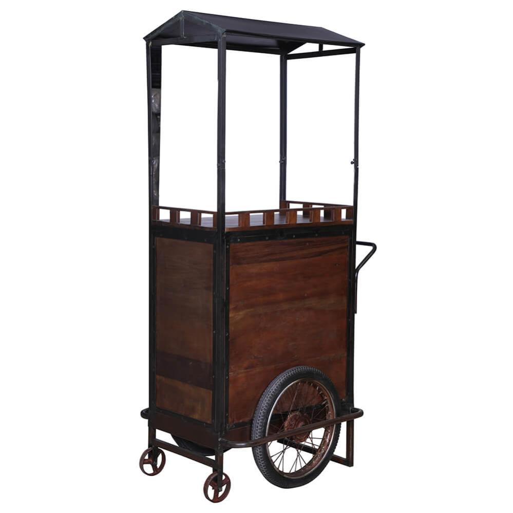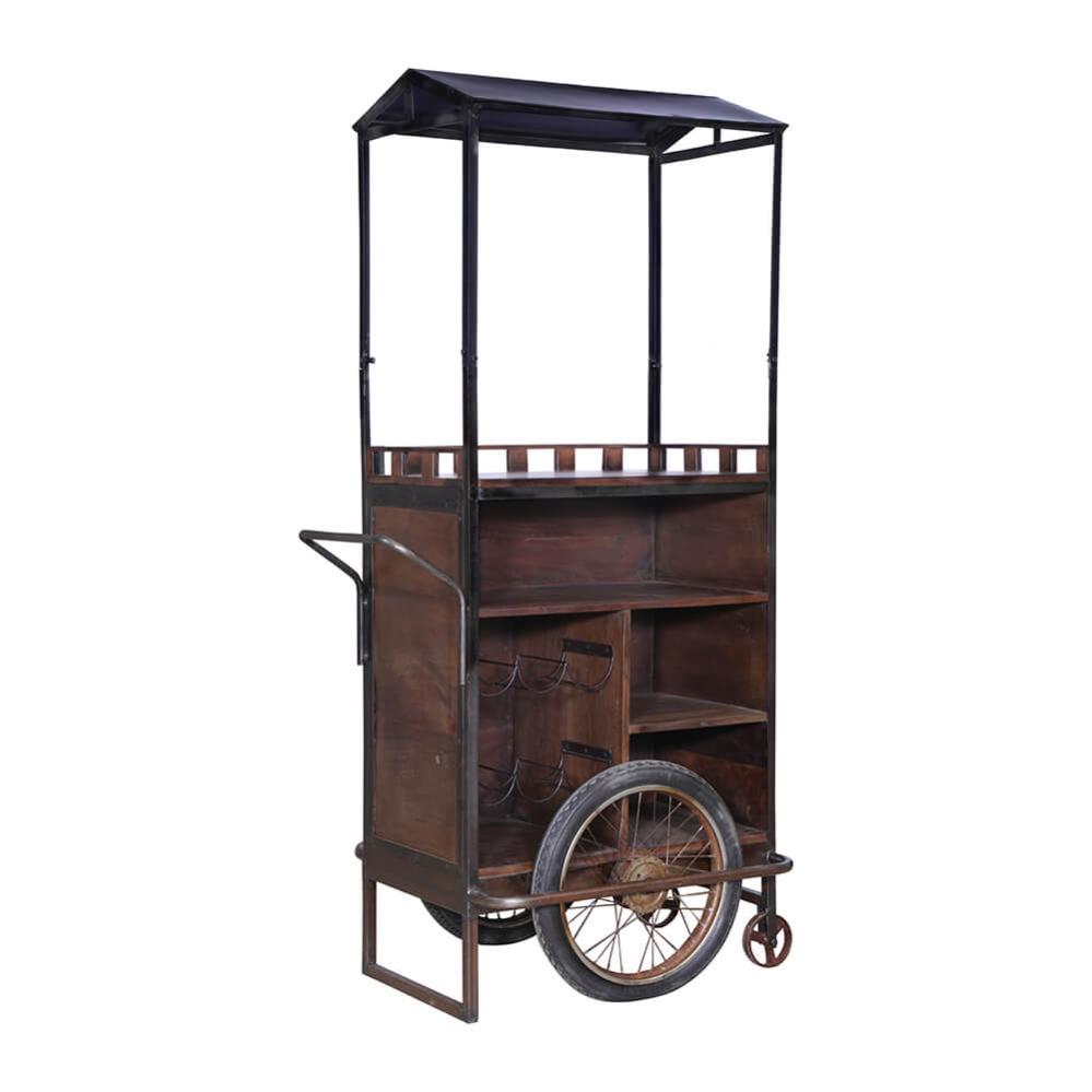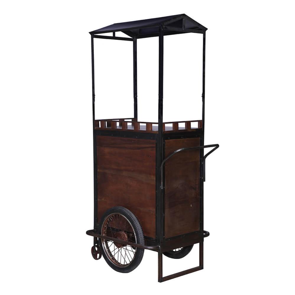 Må vi her præsentere vores festlige barvogn med metaltag og hjul. Denne barvogn har sjove detaljer, herunder charmerende cykelhjul, små dekorative hjul og en fin trækant på bordpladen. Med rigelig opbevaringsplads på hylderne giver barvognen god plads til dine foretrukne drikkevarer og glas. Fremstillet i jern og mørkt træ kombinerer denne vogn stil og brugervenlighed og gør den til et fedt supplement til din hjemmebar eller dit næste event. Hæv din værtsrolle med denne fantastiske barvogn, der udstråler nostalgi og charme.