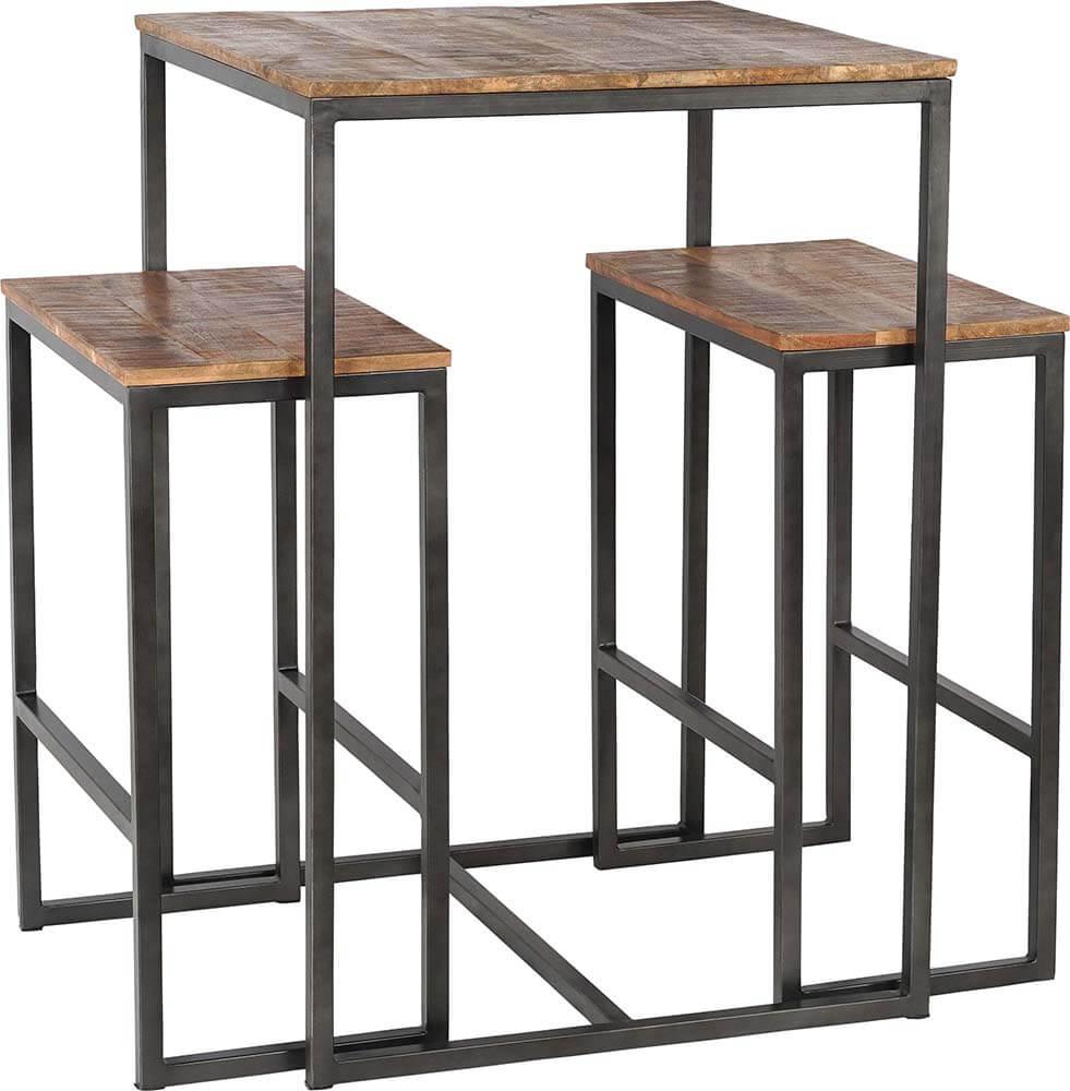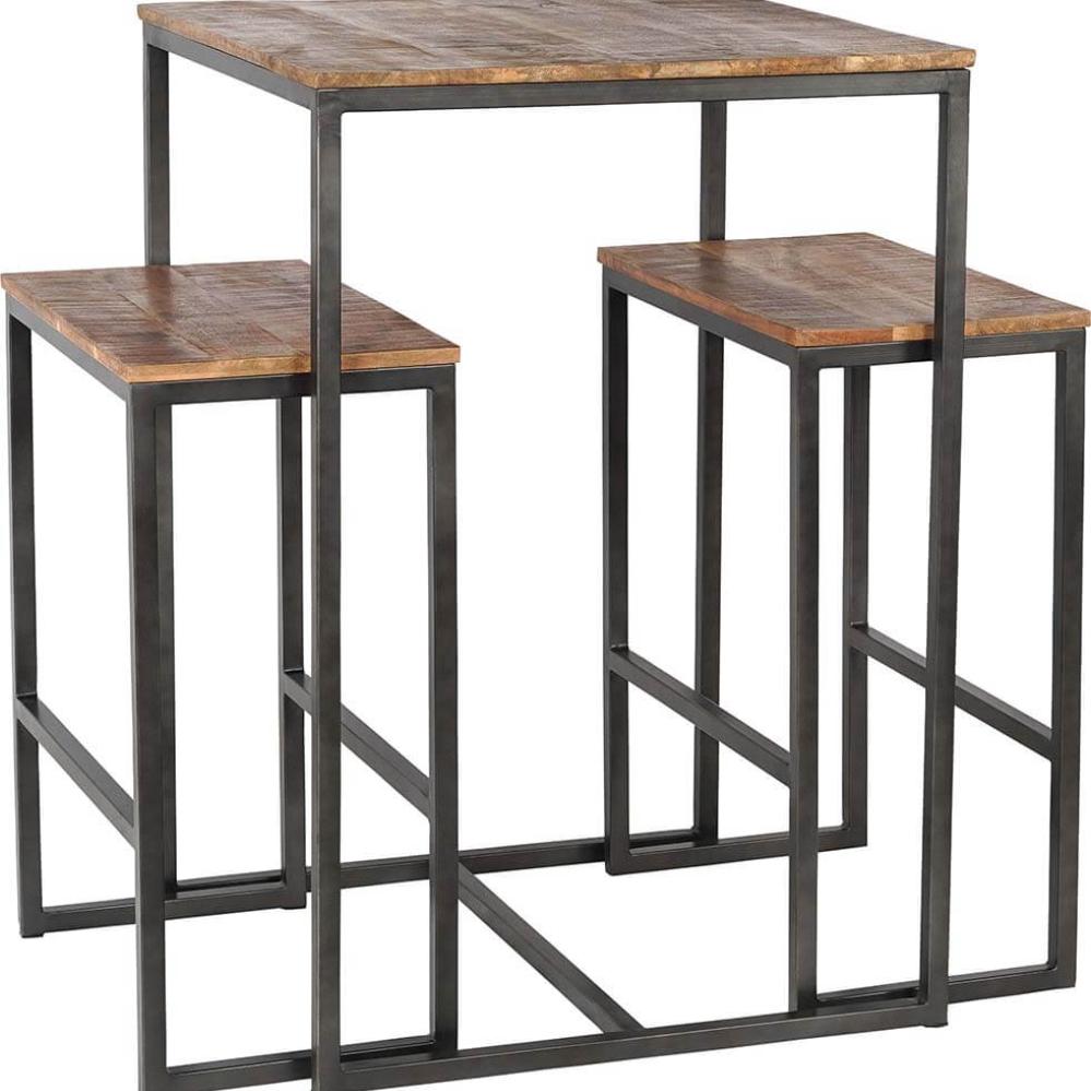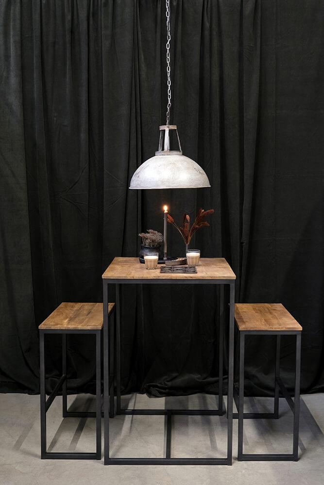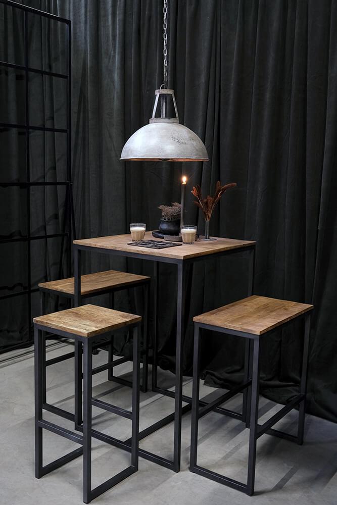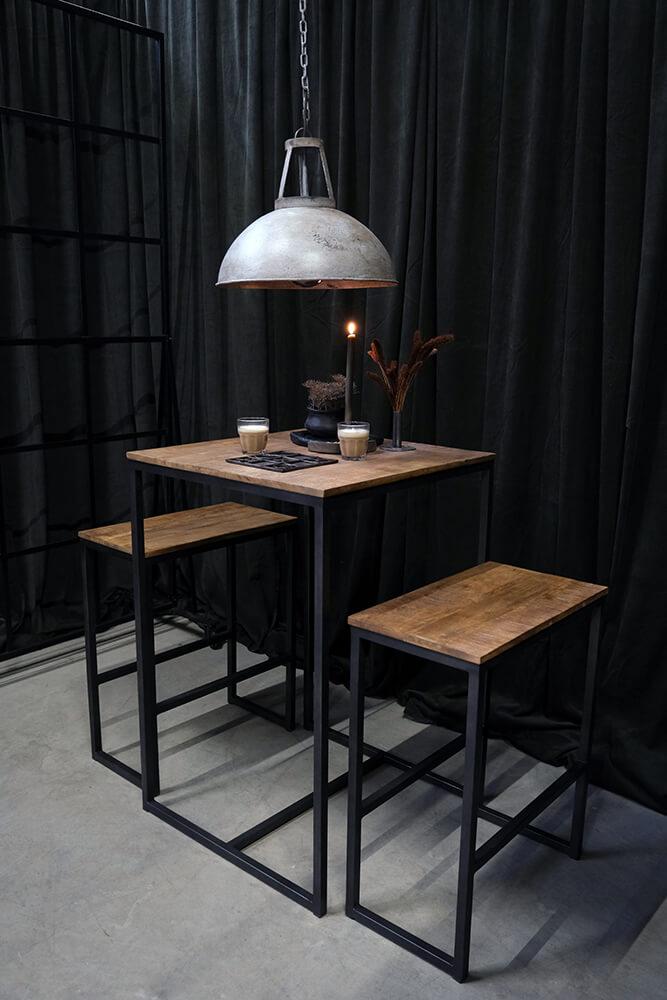 Dette høje bord-bænkesæt kombinerer den rå robusthed af klarlakeret jern med den varme, naturlige tone fra mangotræet, hvilket skaber et rustik, industriel udtrykk. Bordet og de to bænke er designet i et enkelt og funktionelt udtryk, hvor den slanke metalramme understøtter de massive træplanker. Dette sæt er ideelt til små rum, hvor det kan skabe en hyggelig spiseplads med kant. Med sin kompakte størrelse er det oplagt til barområder eller små køkkener, hvor pladsen er begrænset, men stilen stadig skal være i top. Stolene måler H:76 x B:60 x D:34 cm. Sættet kan desuden suppleres med en eller to matchende barstole. Søg efter "Esbjerg barskammel".