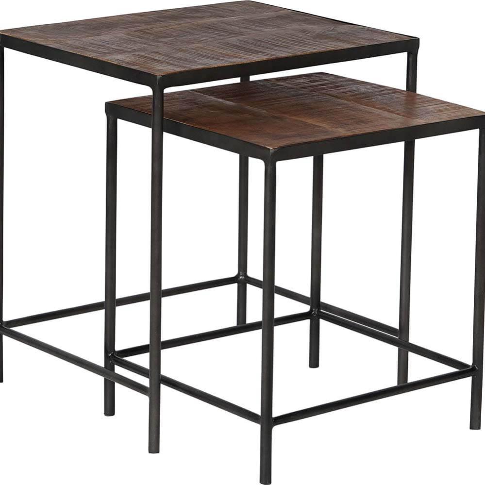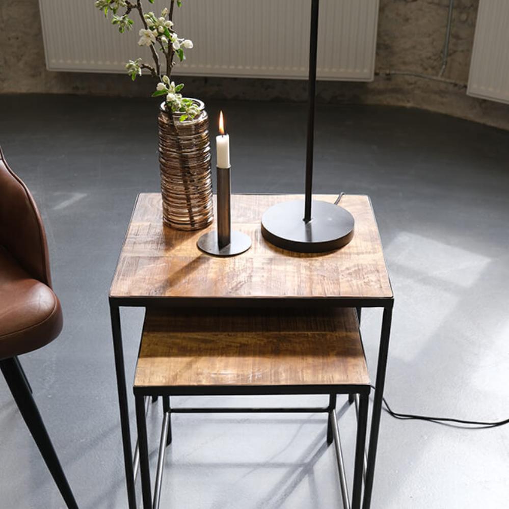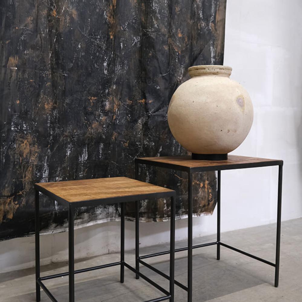 Dette indskudsbord er en minimalistisk duo, der kombinerer rustikt træ med en slank metalramme. Det større bord har en helt enkel firkantet form, som spejles af det mindre bord, der let kan stilles ind under det første. Bordpladerne er lavet af mørkt træ, hvilket skaber en smuk kontrast til de tynde metalben. Perfekt til at spare plads og samtidig tilføje en industriel charme til rummet. Det her sæt er ikke kun praktisk, men også utroligt alsidigt—brug det som sofaborde, sideborde eller til at fremvise dine yndlingsdekorative elementer. Udtrykket er stilrent og diskret, men med en kant af rå æstetik, der taler til moderne og vintage inspirerede indretninger. Stor: H: 54cm x W: 48cm x D: 40cm Lille: H: 46cm x W: 40cm x D: 38cm