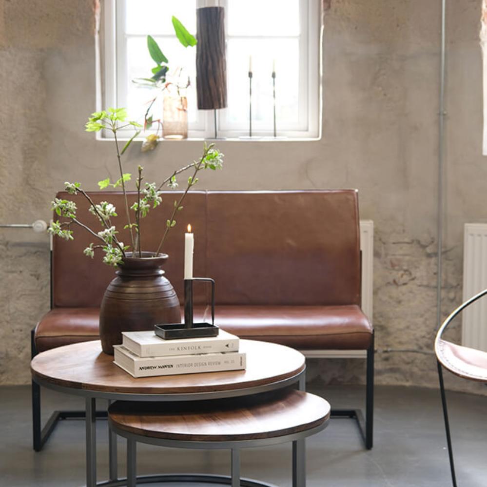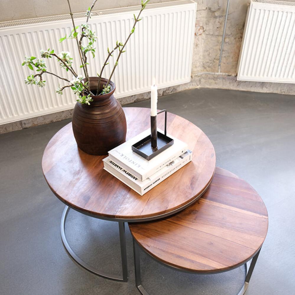 Indskudsborde i rundt design. De runde bordplader er fremstillet i genanvendt træ, og det enkle jernstel er med klar lak. Det mindste af sofabordene kan placeres helt inde under det store af sofabordene eller de kan stilles side om side. Så det giver mange muligheder i indretningen. Stor: H: 48cm x W: 82cm Lille: H: 40cm x W: 62cm