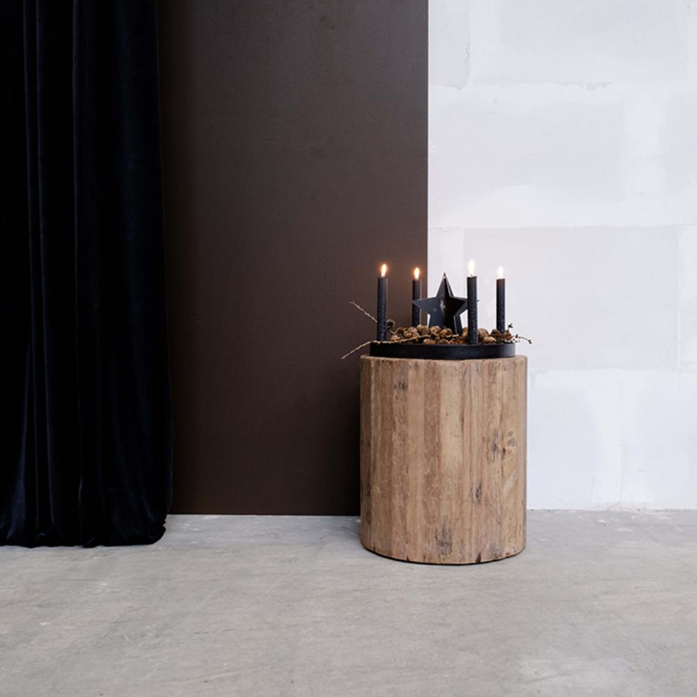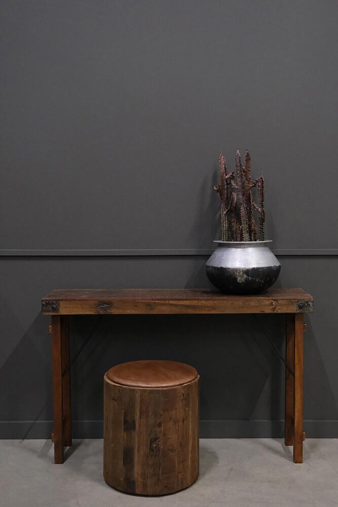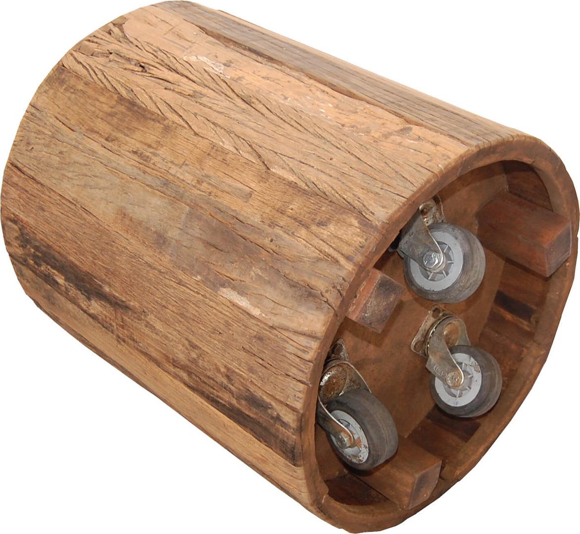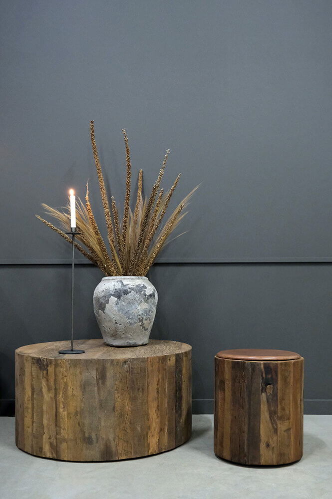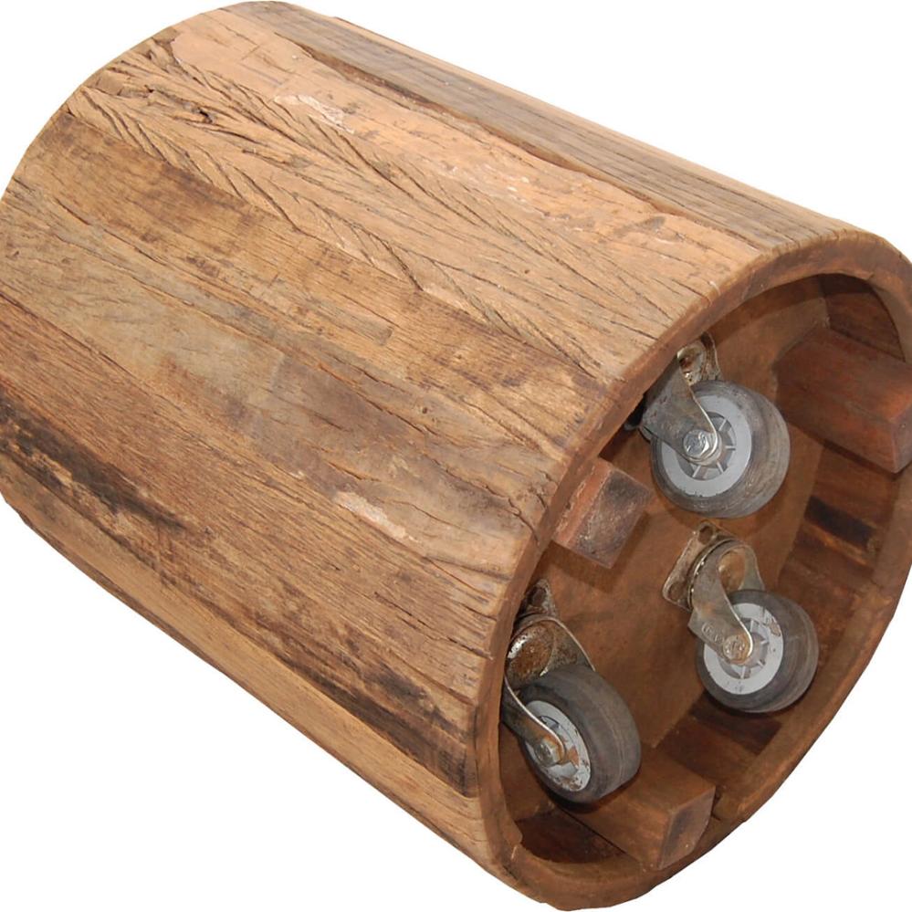 Denne cylinderformede skønhed er en skulptur i sig selv. Den er fremstillet af genanvendt træ og der er påmonteret 3 hjul under den. Skulpturen har flere funktionsmuligheder. Brug den som en skammel, lampebord, sengebord eller sofabord. Du kan bestille en rund sædehynde som passer perfekt i målene, hvis du ønsker at bruge den som skammel. I shoppen skal du søge på varenr. M1407 - Rund læderhynde
