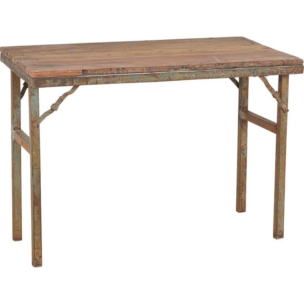 Charmerende gammelt konsolbord med en rustik træbordplade og jernben. Dette skønne gamle bord er både praktisk, funktionel og hyggeligt i enhver indretning. Konsolbordet vil tilføre en varme og autenticitet til den mere klassiske nordiske indretning. Konsolbordet kan klappes sammen.