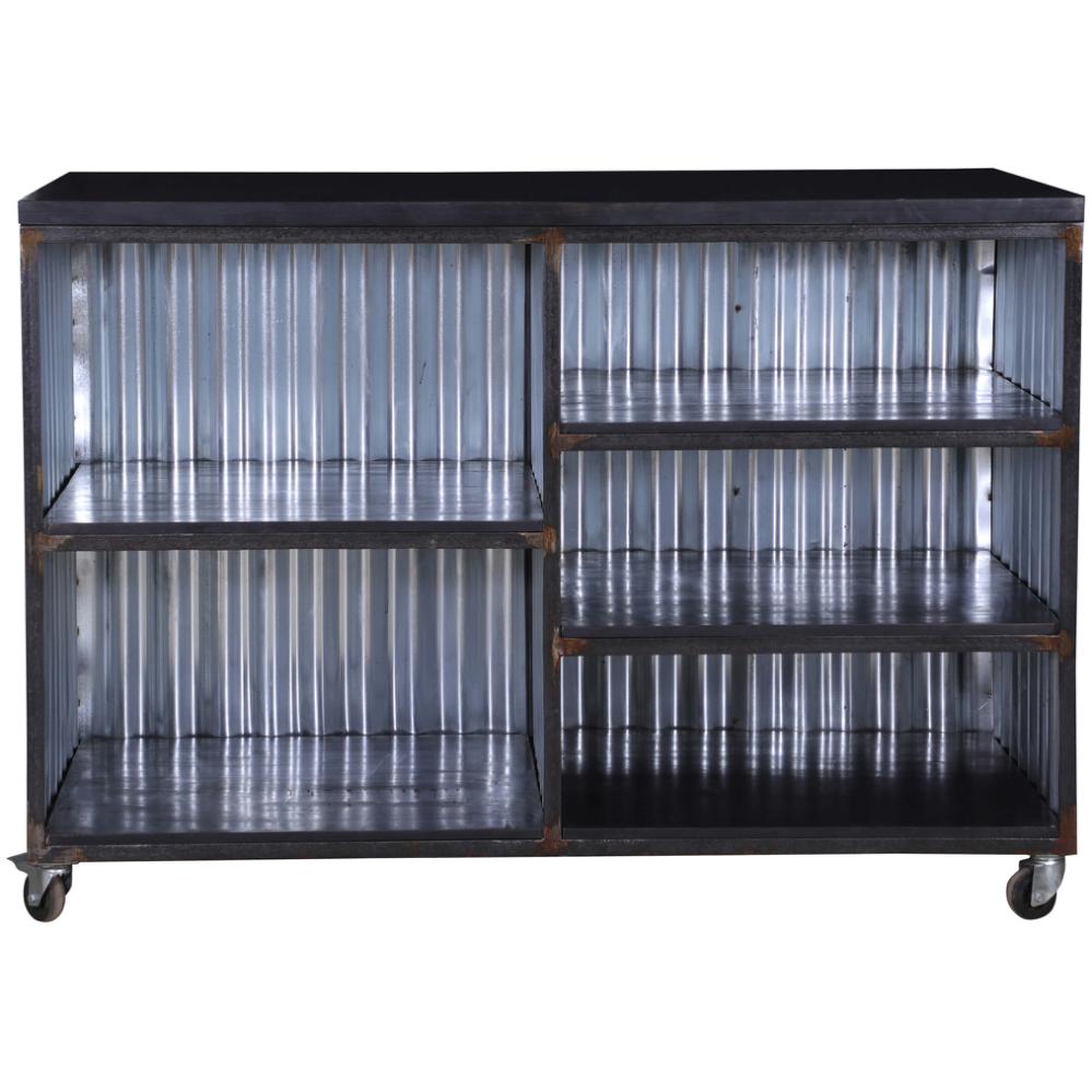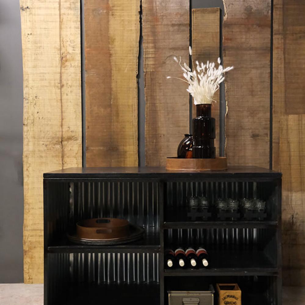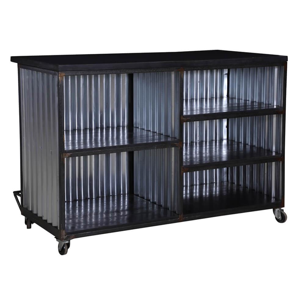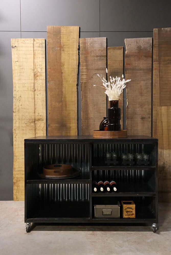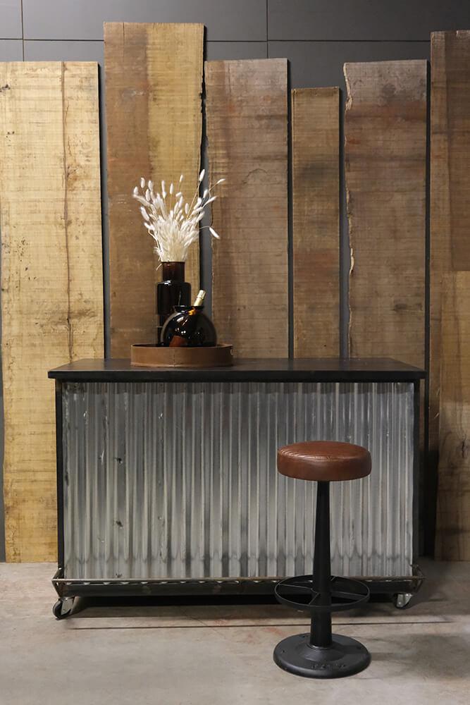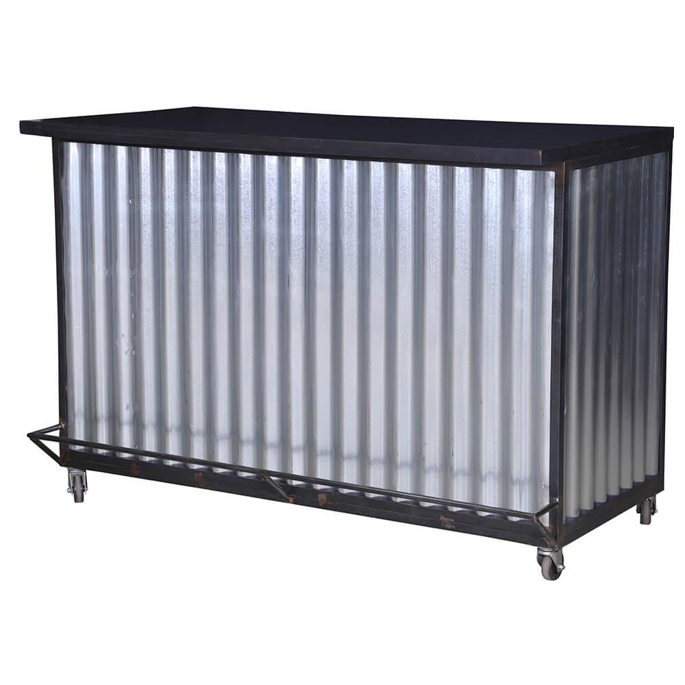 Charmerende mobil bar på hjul. Vores mobile bar er ikke blot et praktisk sted at servere dine yndlingsdrikkevarer, den er også den perfekte tilføjelse til enhver fest eller begivenhed. Den er beklædt med bølgeplader, der tilføjer et rustikt og unikt præg. Baren har flere hylder til opbevaring, så du har masser af plads til at organisere dit yndlingsbarudstyr, flasker og glas, så du kan servere drinks og cocktails med stil og lethed. Det bedste af det hele er, at vores mobile bar er udstyret med fire hjul, så den nemt kan flyttes rundt, hvor end festen er.