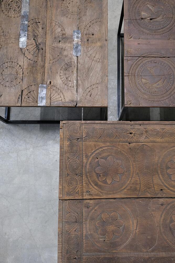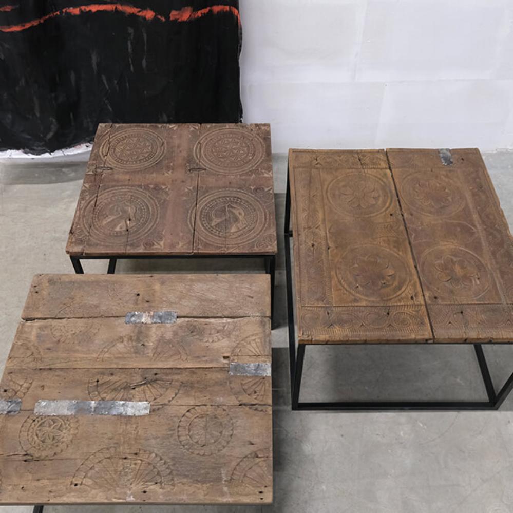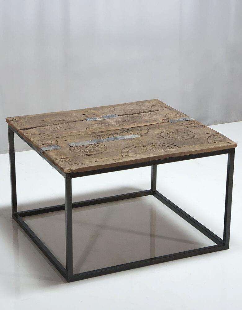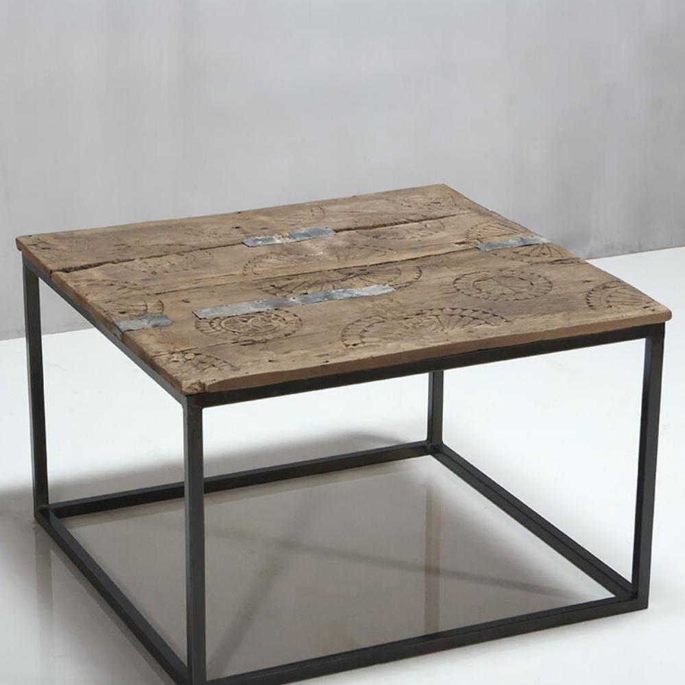 Dette sofabord er en blanding af rustik charme og moderne enkelhed. Bordpladen er skåret til af en gammel dør, der bærer spor af sin historie gennem smukke udskæringer og autentisk patina. De indlagte jernstrimler dækker større revner i træet, og tilføjer samtidigt et strejf af industrielt stemning og understreger bordets rå look. Stellet er lavet af sortlakeret jern, hvilket skaber en stærk og minimalistisk base, der fremhæver bordpladens detaljer. Sofabordet er perfekt som et statement-møbel i stuen, hvor det vil bidrage med masser af karakter, eller som bord i loungemiljøet i din restaurant eller på dit kontor. Forestil dig de samtaler et sådan bord kan starte. Her får du et sofabord, der kombinerer funktionalitet med historie og sjæl. Bemærk at alle sofabordene er forskellige i udskæringerne og reparationer, og at størrelsen kan variere en smule.