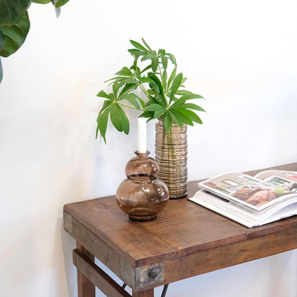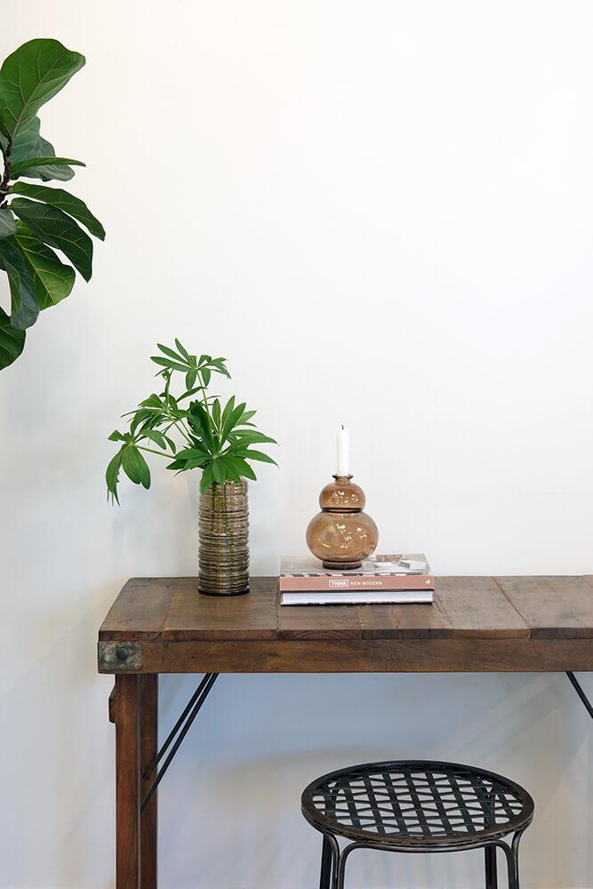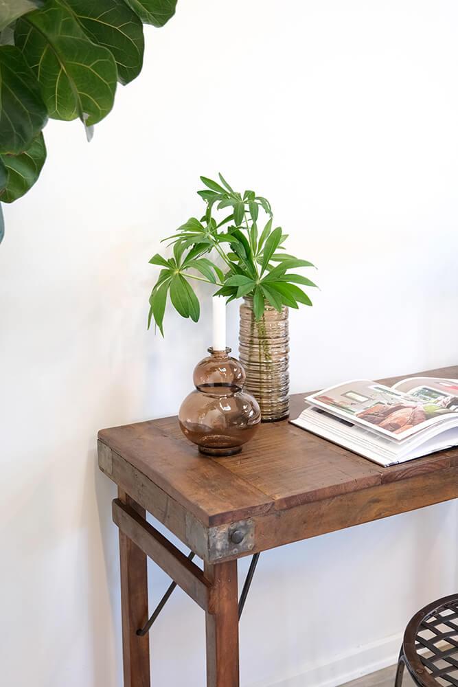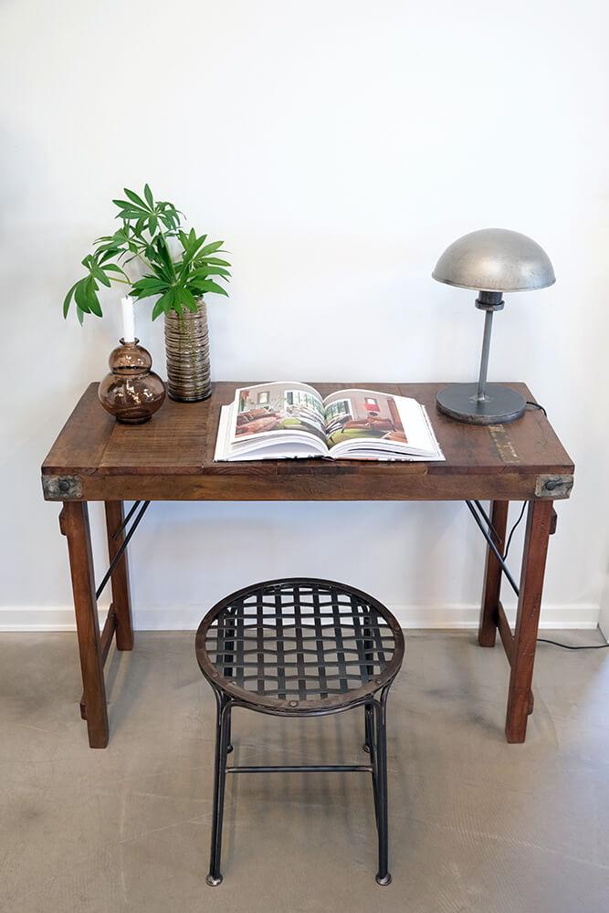 Et rustikt og anderledes lille konsolbord fremstillet af genanvendt træ. Bordet er med mærker og ridser, og der kan være jernstrimler montoreret på bordpladen for at dække større revner i træet. Alt dette er kun en ekstra charme til sådan et smukt bord der emmer af genbrug. Her får du et bord, der er både rustikt og moderne, og som vil brige noget unikt og iøjefaldende til din indretning.