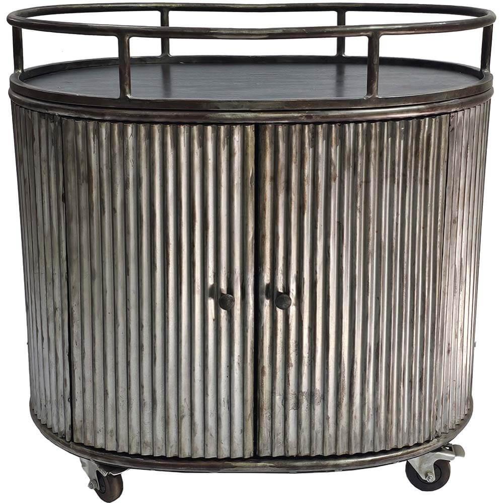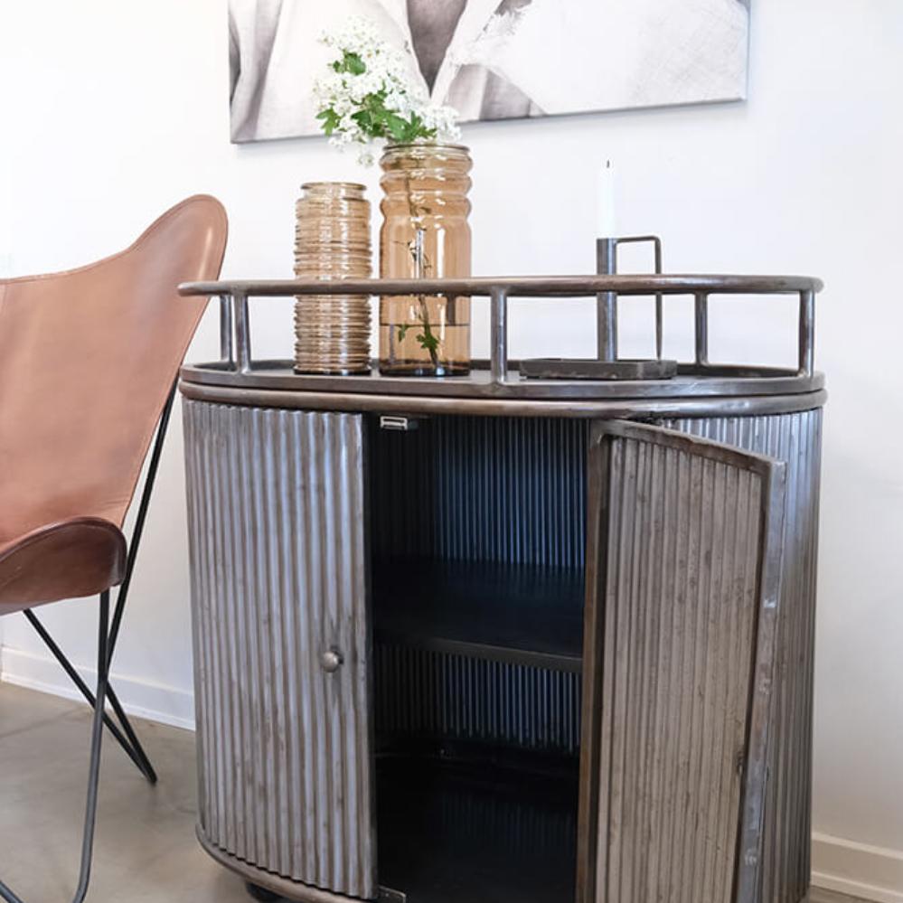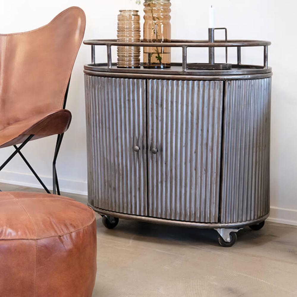 Denne praktiske og rå barvogn er lavet af bølget metal med en rustik finish, der tilfører kant og karakter til ethvert rum. Barvognens ovale form giver den et cool udtryk, mens de fire robuste hjul gør den let at flytte rundt – perfekt til servering eller som en dekorativ opbevaringsløsning. Den har en bordplade, der kan bruges til at fremvise glas og flasker. Bag skabslågerne er der rummelige hylder til ekstra opbevaring, og denne barvogn kombinerer funktionalitet og design. Den indbyggede kant omkring toppen sikrer, at dine genstande står sikkert. En ideel løsning til restauranter, caféer eller hjemmebaren, hvor fleksibilitet og stil er i fokus. Klar til at rulle ind i din indretning!