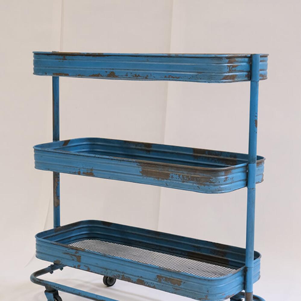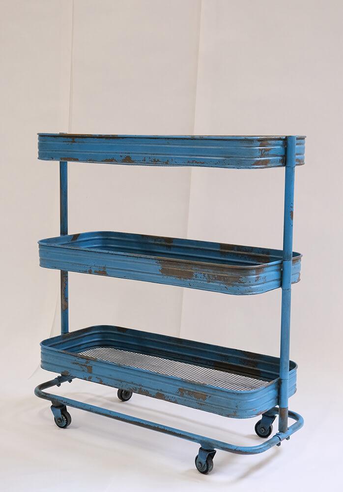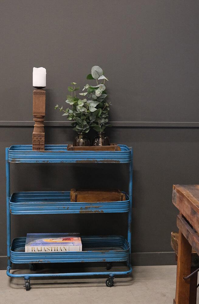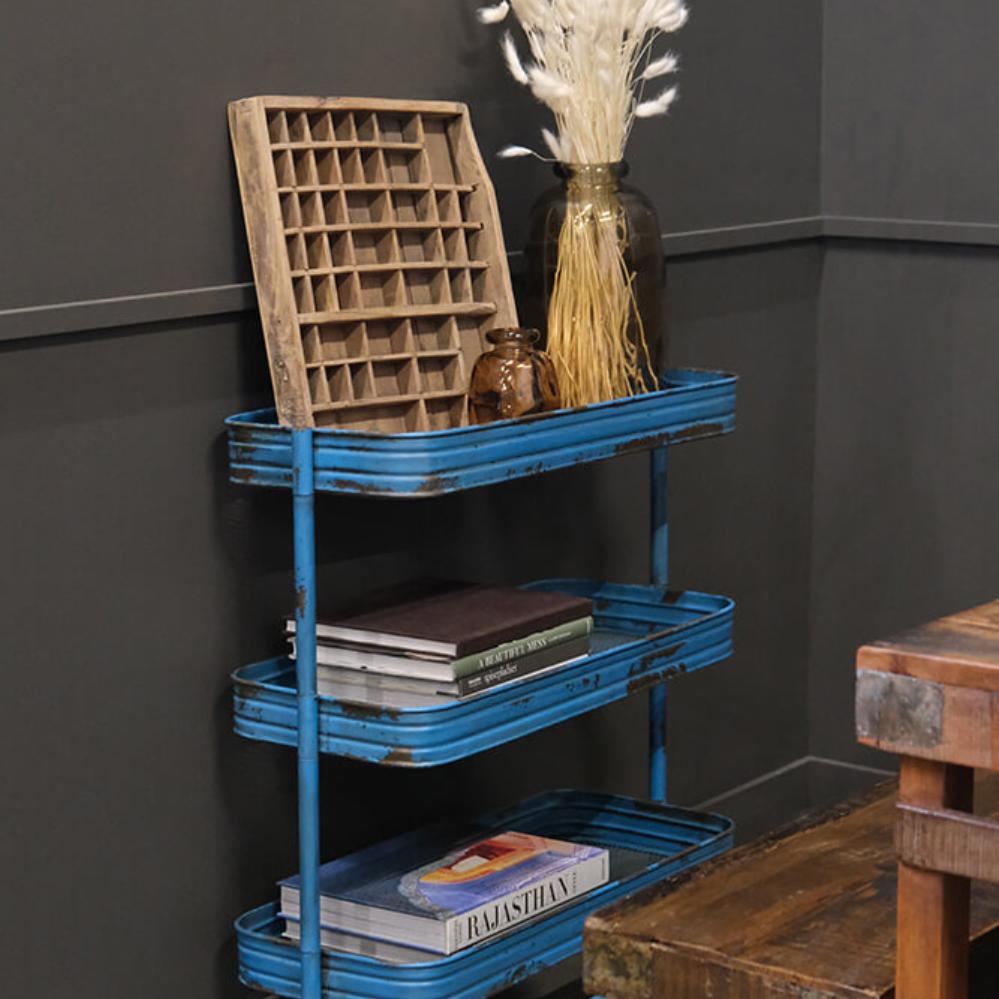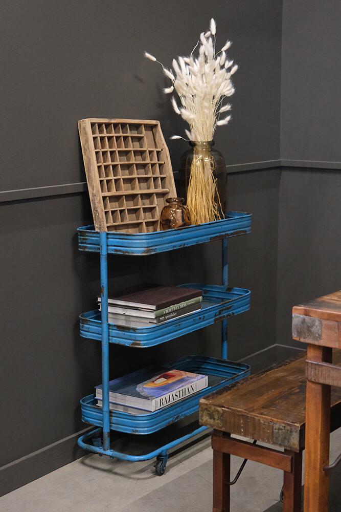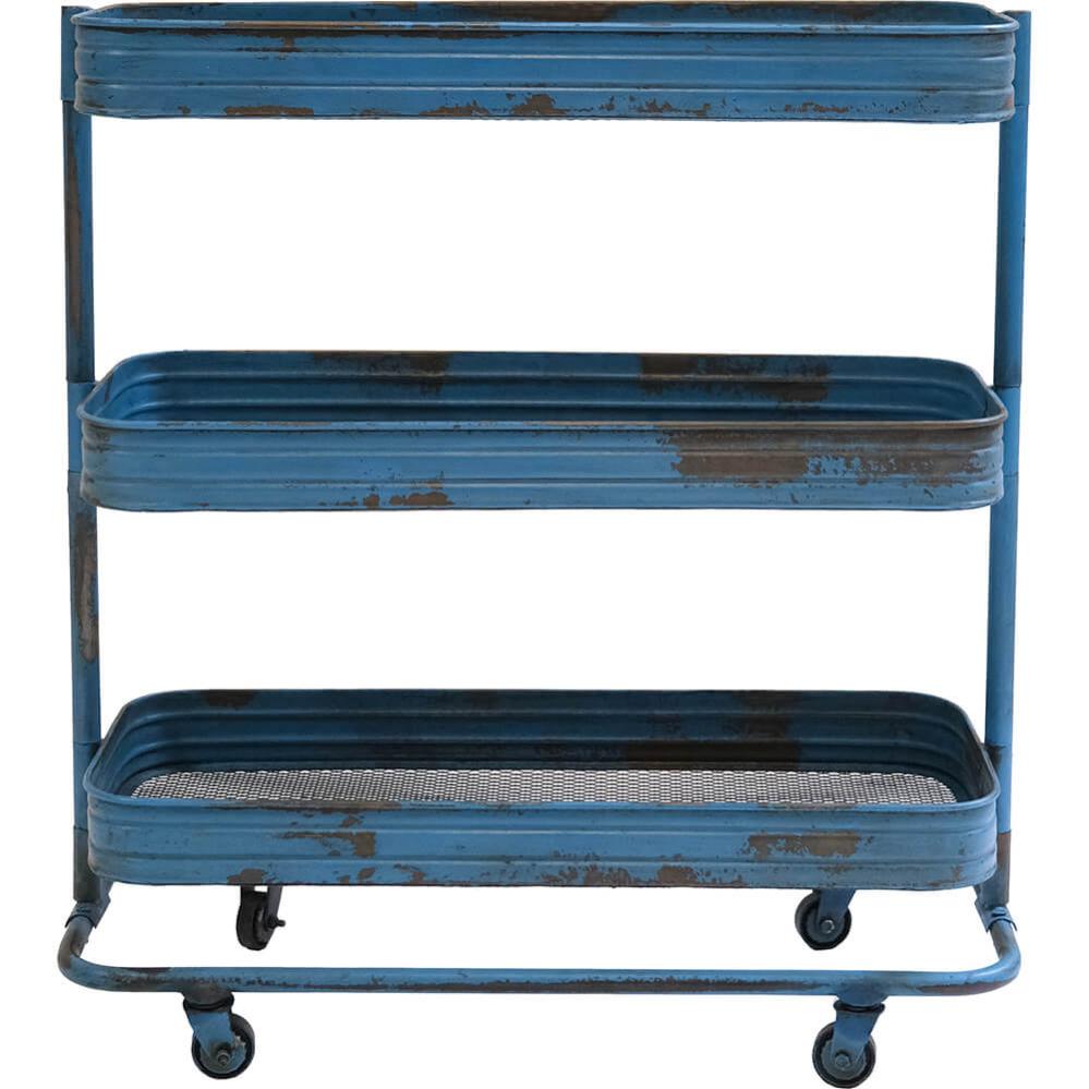 Dette rå og industrielle rullebord er både praktisk og stilfuldt med sin patinerede blå finish og tre rummelige bakker. Hver bakke har en bund af trådnet, som giver et let og luftigt udtryk samtidig med, at det tilføjer et råt, vintage look. Med en hyldeafstand på ca. 35 cm mellem den øverste og midterste bakke og ca. 29 cm mellem den nederste og midterste bakke, får du masser af opbevaringsplads. Bemærk at bordet er udstyret med dekohjul. Perfekt til caféer, barer eller som et fleksibelt opbevaringsmøbel i hjemmet. Leveres usamlet.
