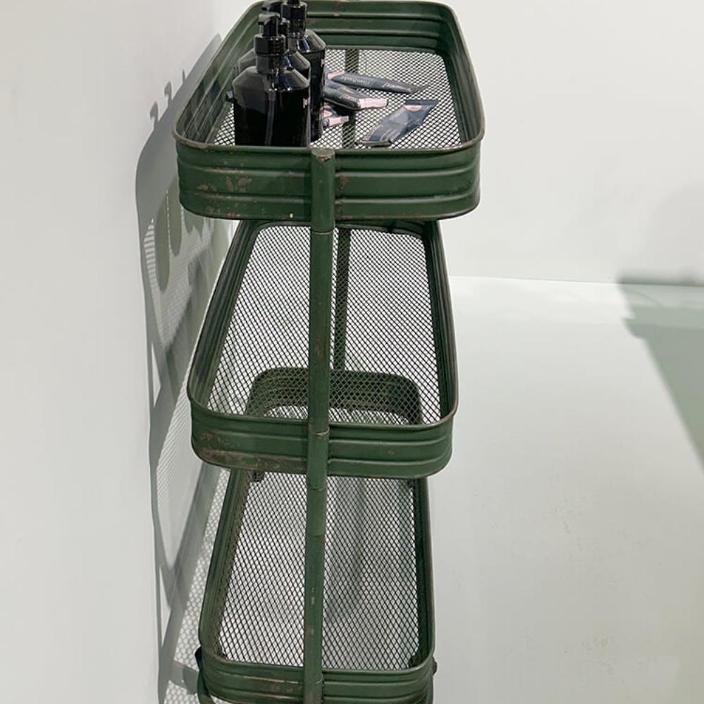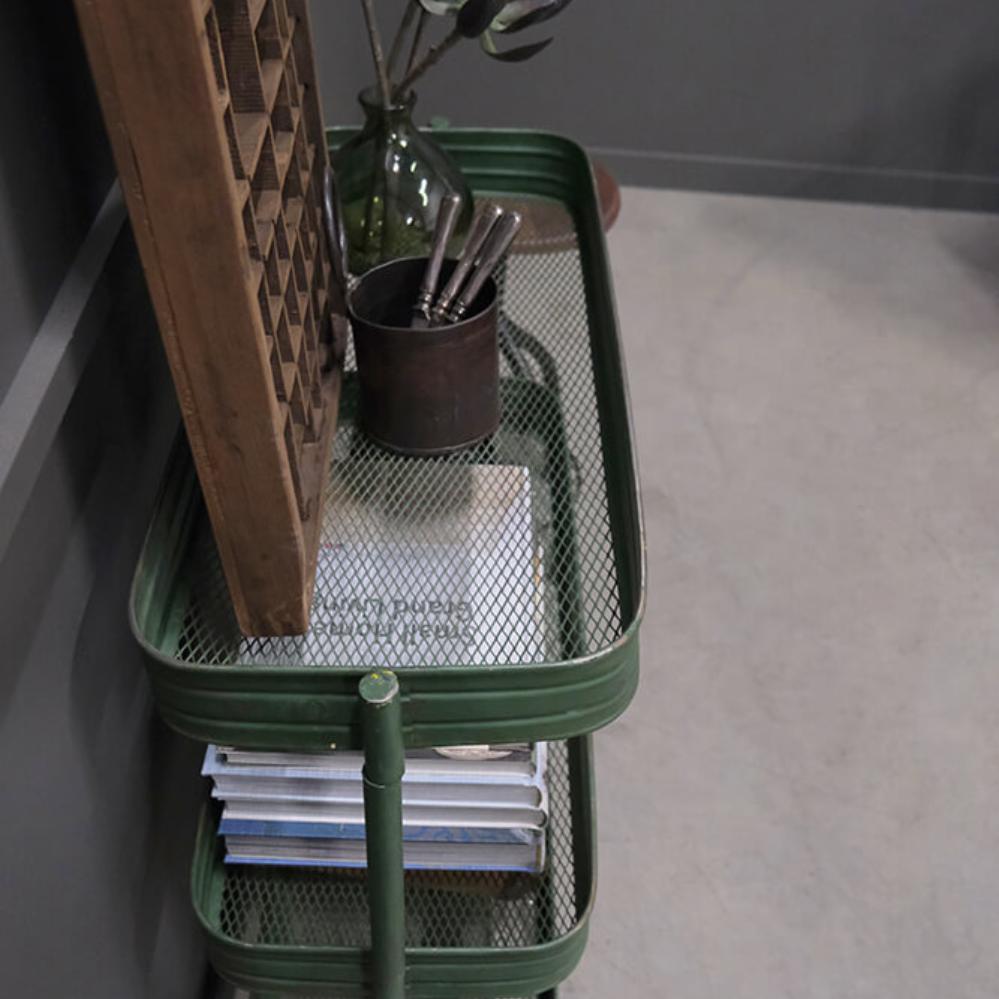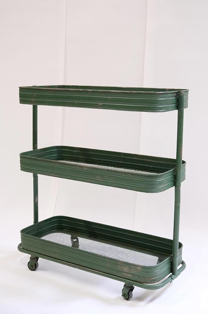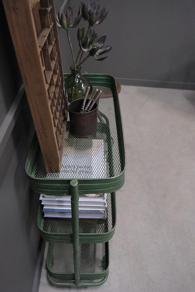 Denne reol på hjul er et "must have". Charmerende og original i designet med det let patinerede og industielle look. Opbevaringsmøblet har 3 bakker med trådnet i bunden. Brug reolen på dekohjul i køkkenet til køkkenredskaber, på kontoret til skrivebordstilbehør, på badeværelset til håndklæder og toiletpapir, i sommerhuset eller kolonihavehuset til div. opbevaring. Rullebordet leveres usamlet. Mål mellem midt/top hylde ca. 35 cm. Mål mellem bund/midt hylde ca. 29 cm.