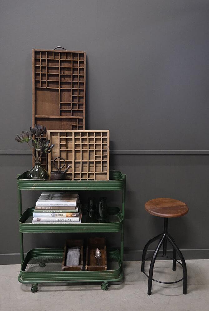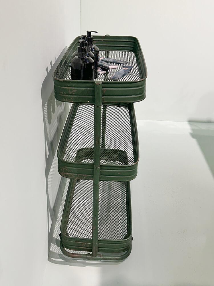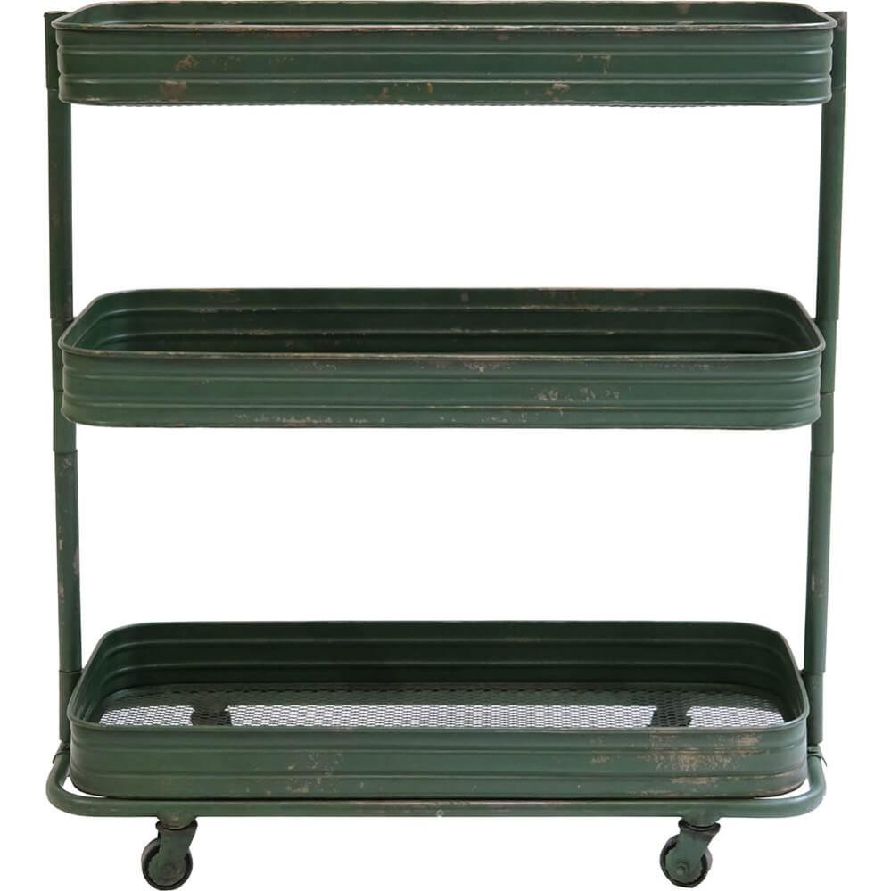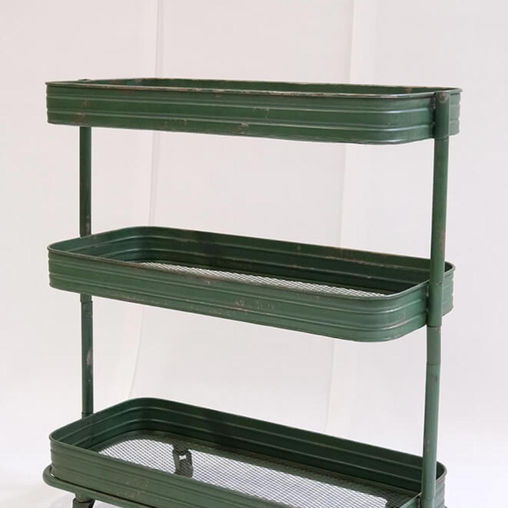 Denne reol på hjul er et "must have". Charmerende og original i designet med det let patinerede og industielle look. Opbevaringsmøblet har 3 bakker med trådnet i bunden. Brug reolen på dekohjul i køkkenet til køkkenredskaber, på kontoret til skrivebordstilbehør, på badeværelset til håndklæder og toiletpapir, i sommerhuset eller kolonihavehuset til div. opbevaring. Rullebordet leveres usamlet. Mål mellem midt/top hylde ca. 35 cm. Mål mellem bund/midt hylde ca. 29 cm.