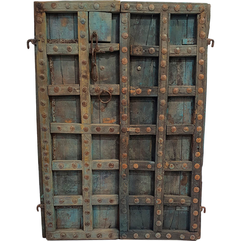 Denne gamle trædør er et markant og autentisk stykke håndværk. Døren er opbygget af massive træfelter, samlet og forstærket med mange originale jernnagler. Træets overflade er præget af tidens gang og viser en smuk, naturlig patina med afdæmpede nuancer af blågrøn, brun og grå, der vidner om mange års brug og slid. De originale jernbeslag, ringhåndtag og låsemekanisme tilfører døren karakter og fortæller historien om dens tidligere liv. Små revner, ujævnheder og spor efter tidligere reparationer er bevaret og giver døren personlighed og dybde. I dag egner døren sig perfekt som et dekorativt element i indretningen. Den kan bruges som vægdekoration, skydedør, rumdeler eller som en dramatisk baggrund i et rum, hvor man ønsker at tilføre varme, historie og autenticitet. En dør for dig, der værdsætter genbrug, unikke materialer og møbler med sjæl og fortælling.