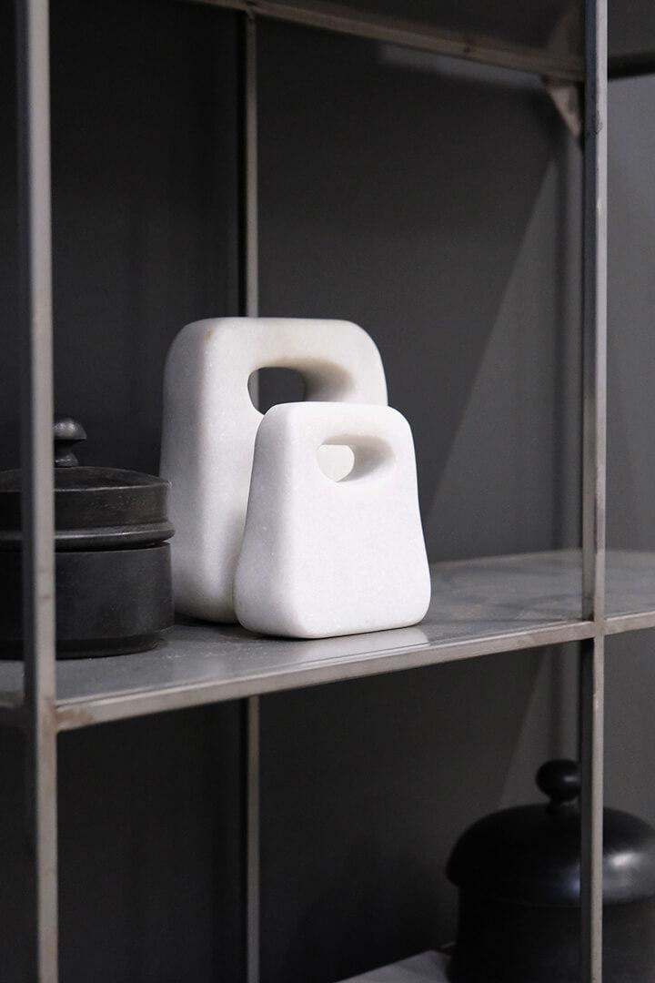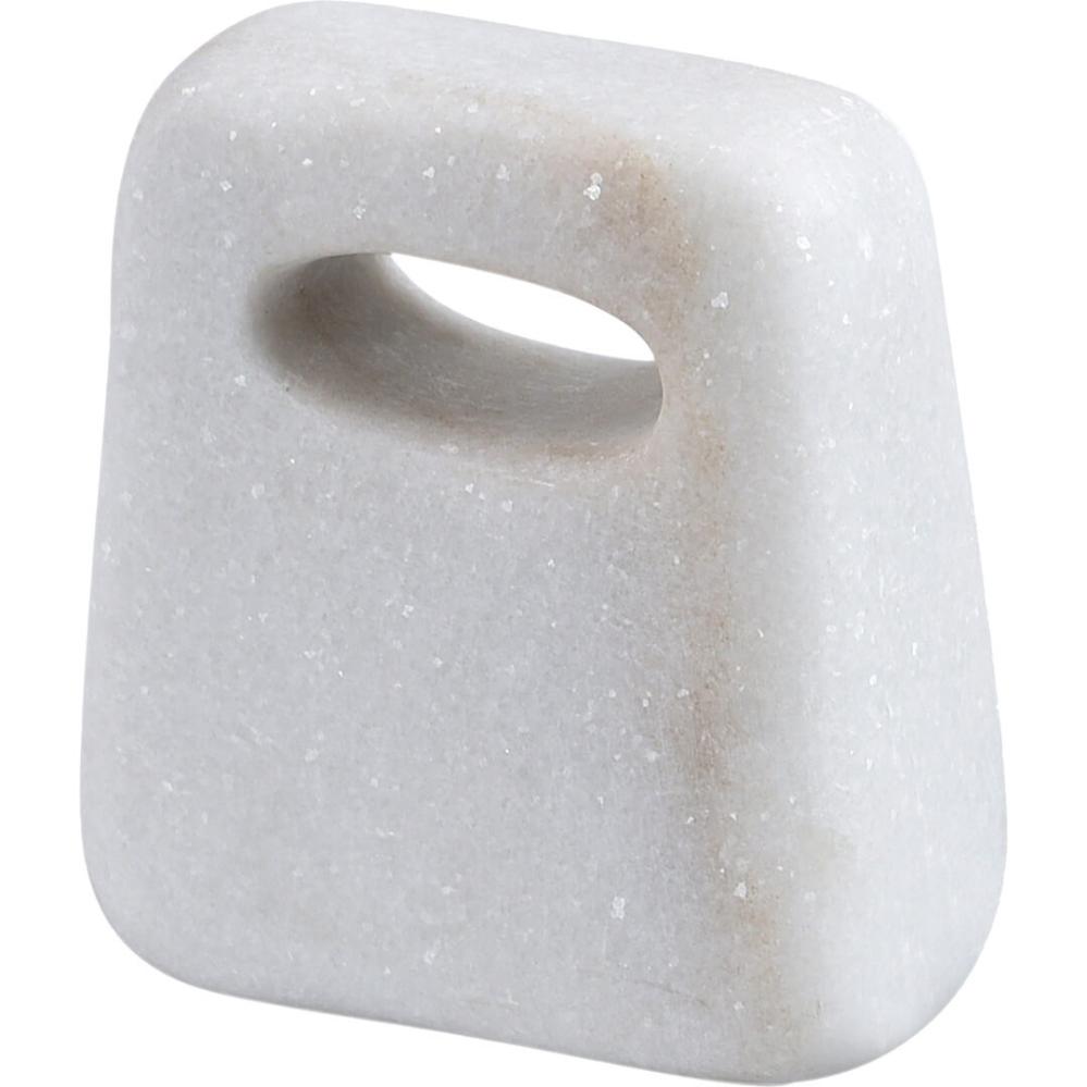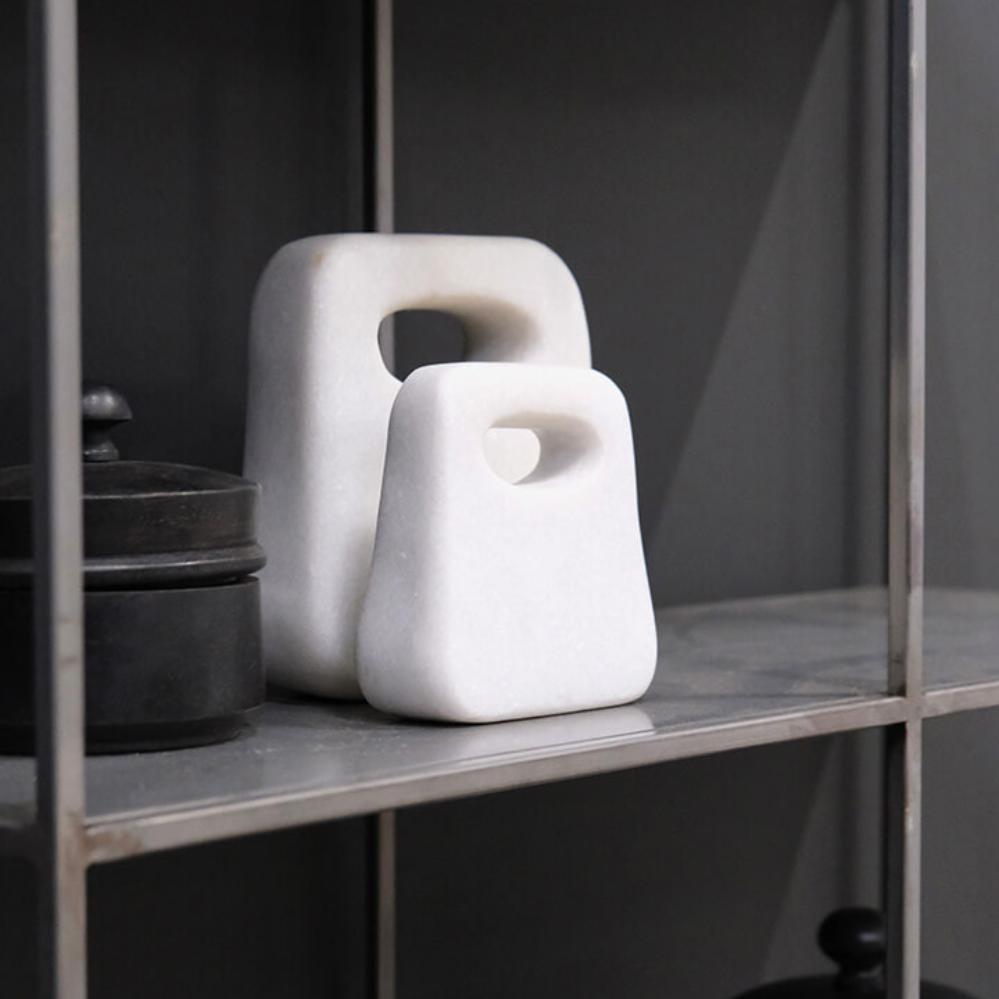 Skøn skulptur i hvidt marmor med et enkelt hul øverst, der giver dette produkt et moderne og skulpturelt udtryk. Marmor er et naturmateriale, hvilket betyder, at hver skulptur er helt unik med sin egen farve og struktur. Det enkle formsprog gør figuren til en stilfuld dekoration, der passer ind i både klassiske og moderne indretninger. Den kan stå alene som et æstetisk statement, indgå i et stilleben med andre dekorationer eller anvendes praktisk som bogstøtte. Skulpturen findes også i en større variant, så du kan skabe et harmonisk sæt, der giver endnu mere karakter til din indretning.