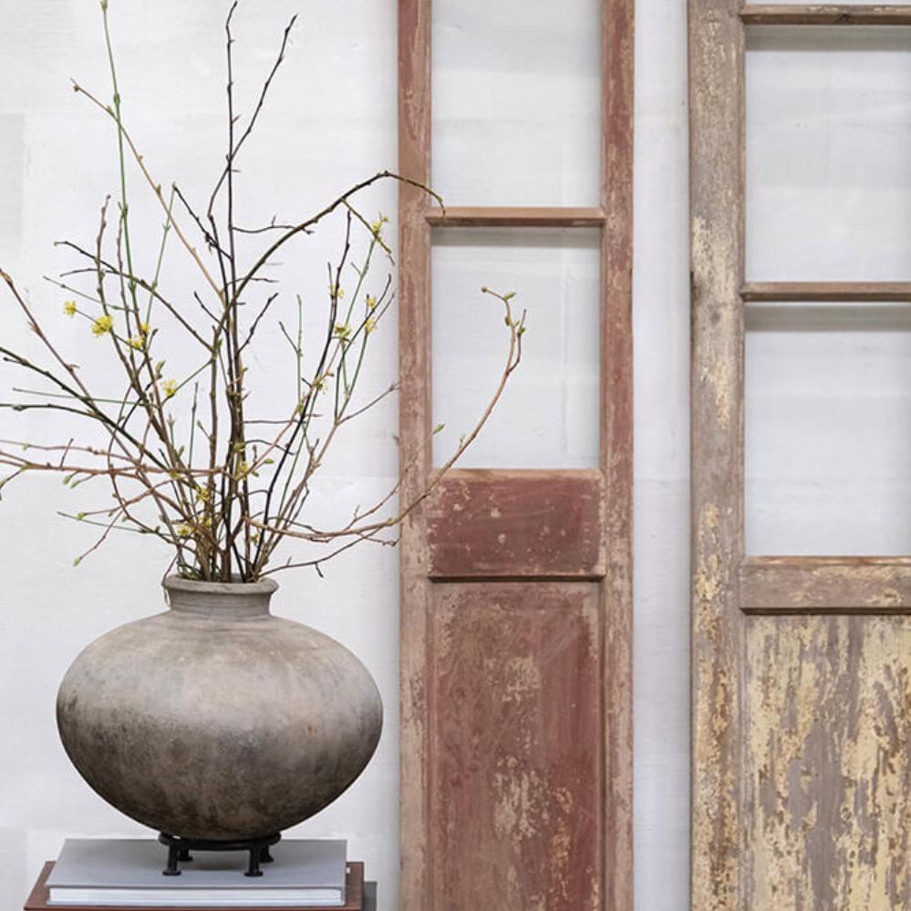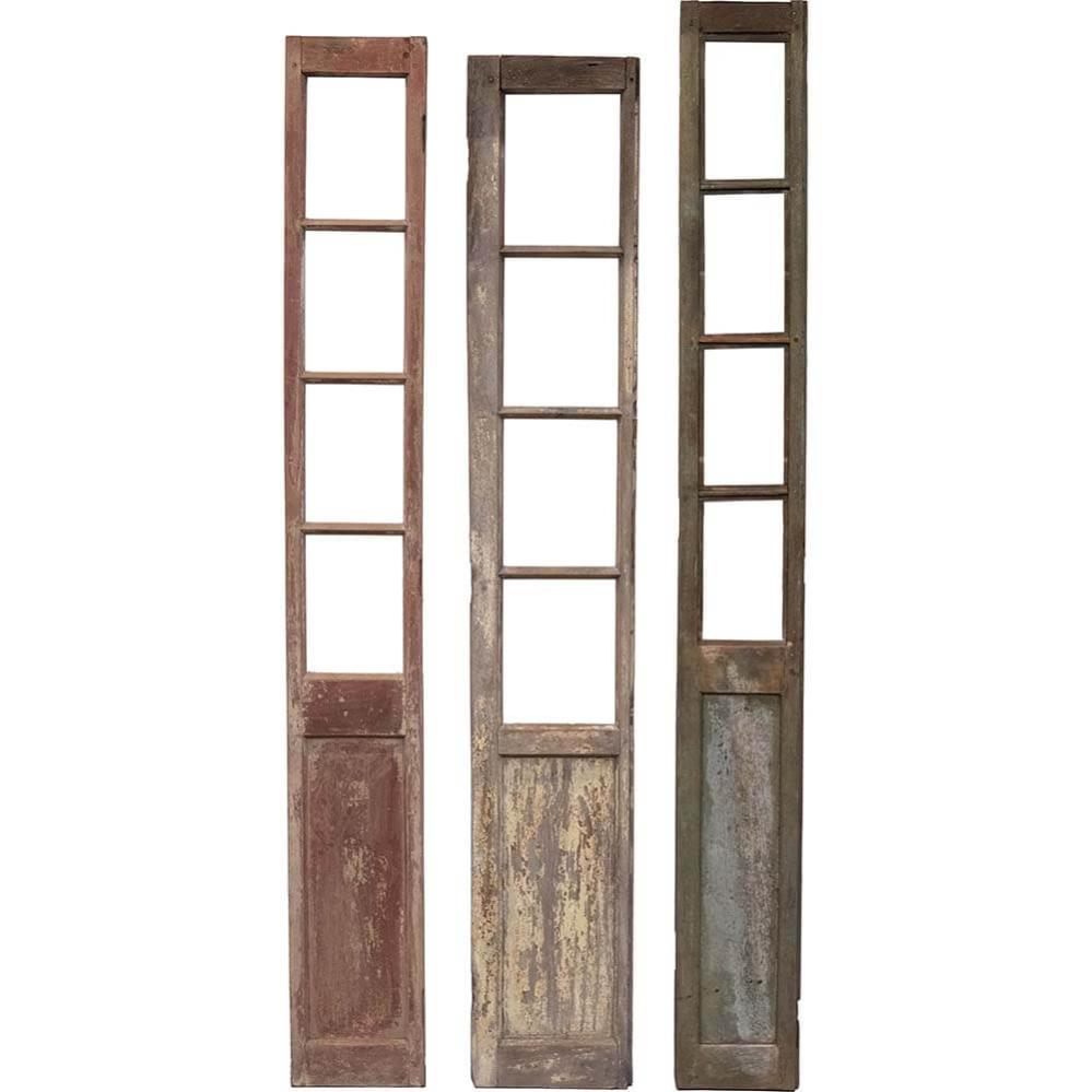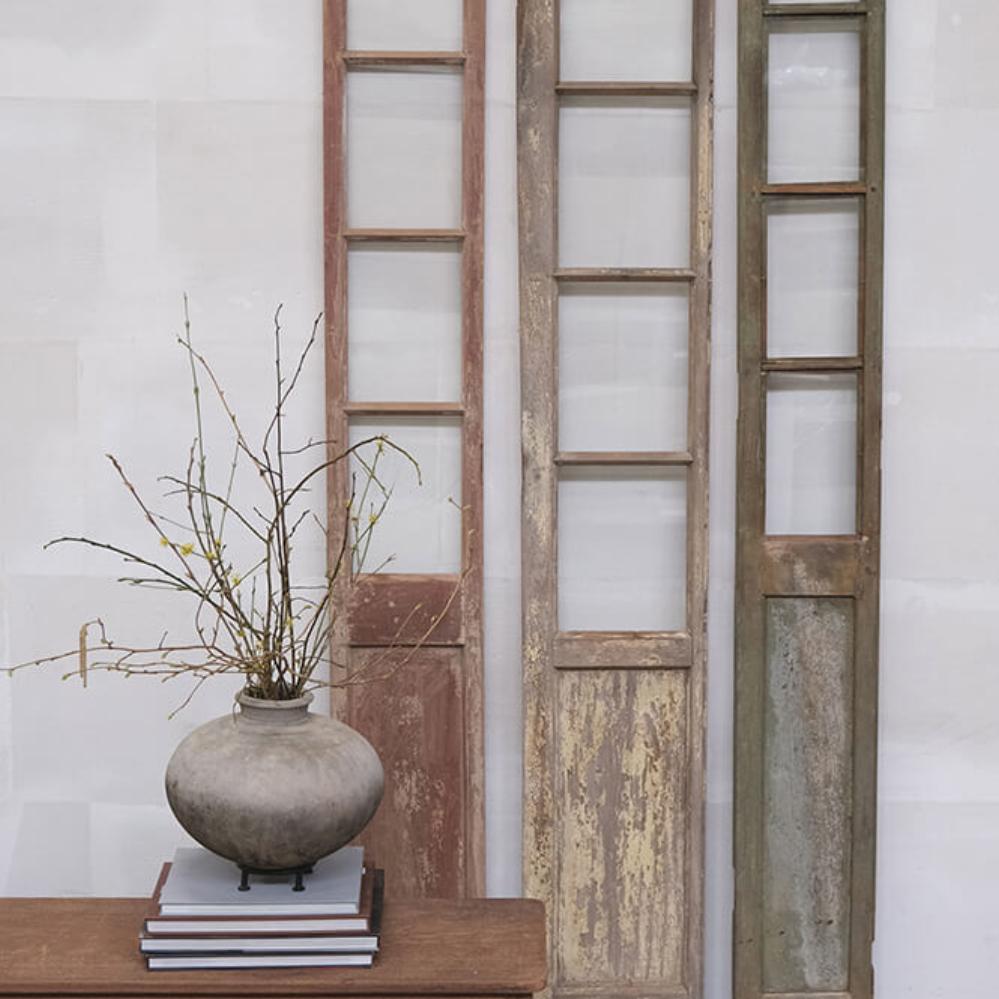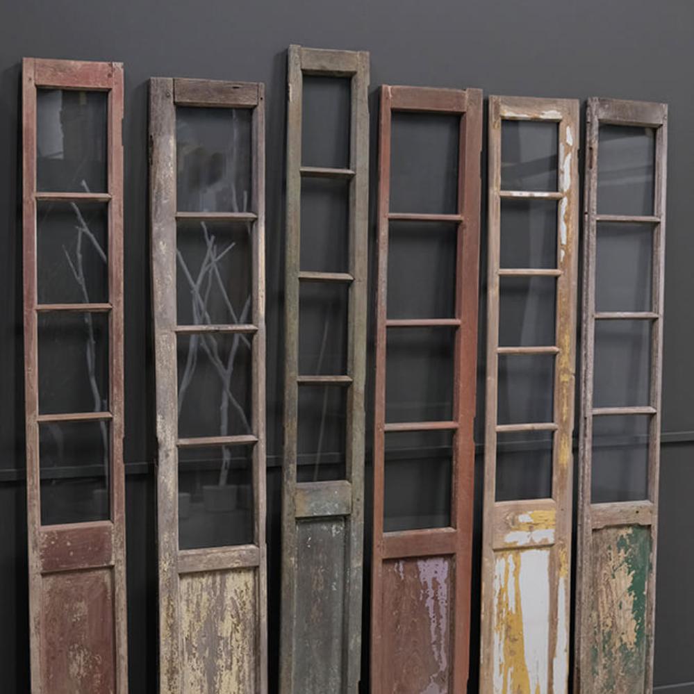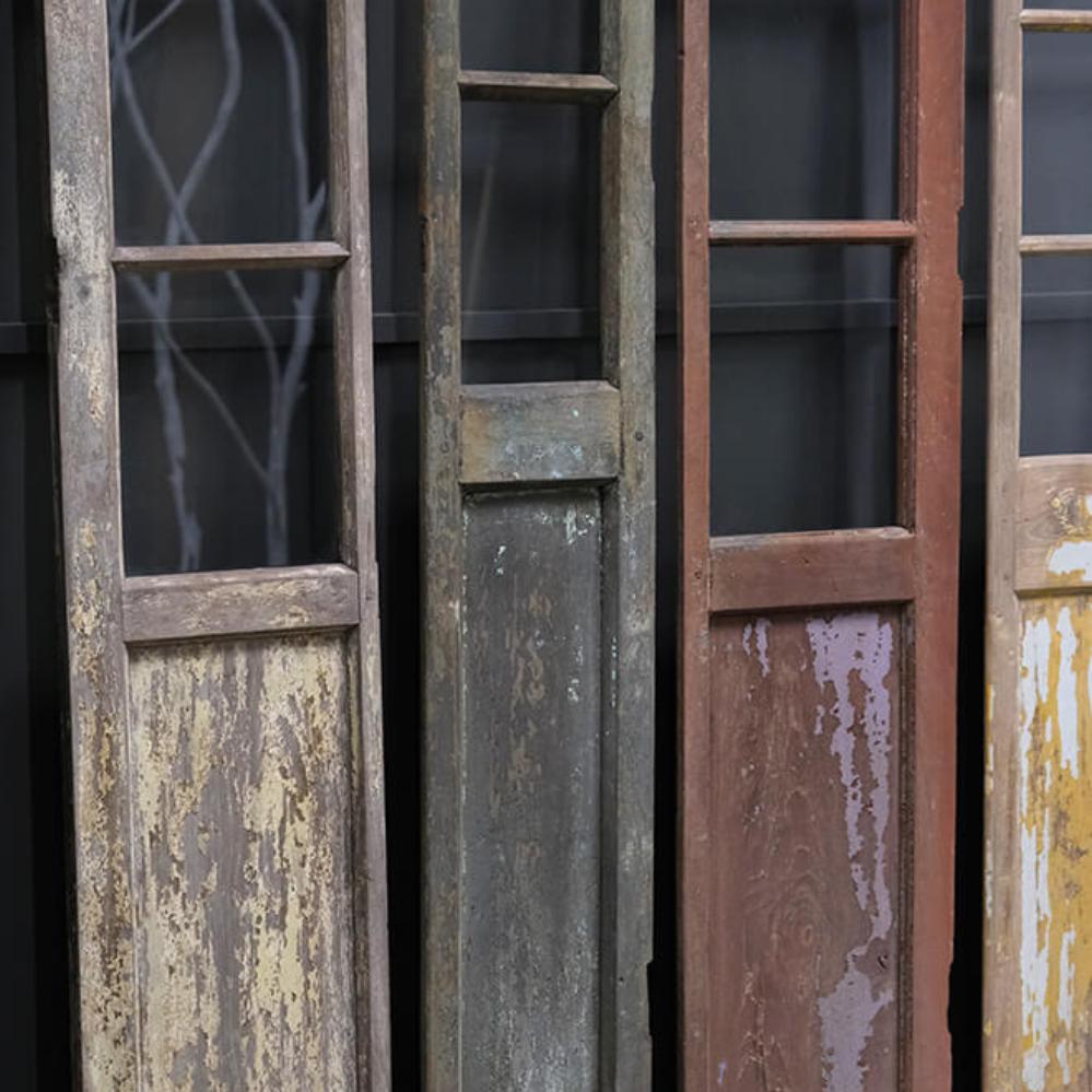 Disse charmerende dørpartier med glasruder bærer på en historie, der kan mærkes i deres slidte overflade og patinerede maling. De slanke rammer og de små glasfelter skaber et let udtryk, mens træets rå struktur og den afskallede maling tilfører en rustik og autentisk stemning. Dørpartierne er perfekte som dekorative elementer i din indretning, hvad enten du ønsker at bruge dem som blikfang i en butik, restaurant eller som et statement i hjemmet. De kan også indgå som en kreativ løsning i et genbrugsprojekt – mulighederne er mange med deres tidløse charme og historie. Bring et stykke gammelt håndværk ind i dit rum, og lad disse dørpartier fortælle deres egen historie.