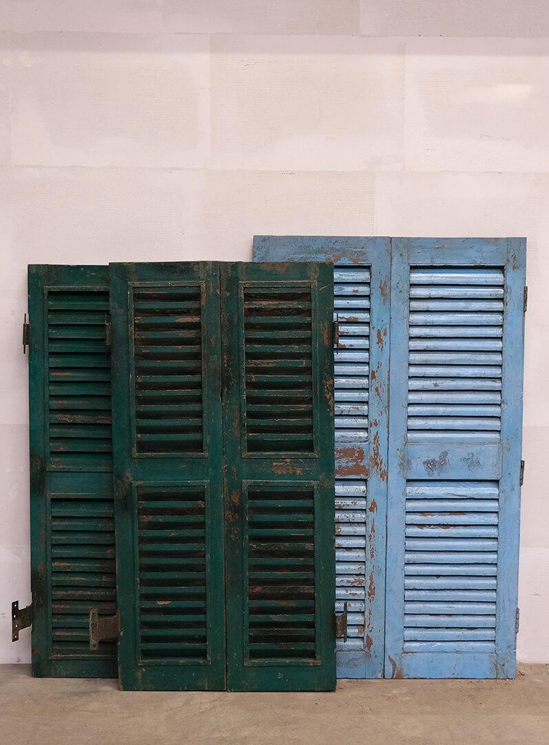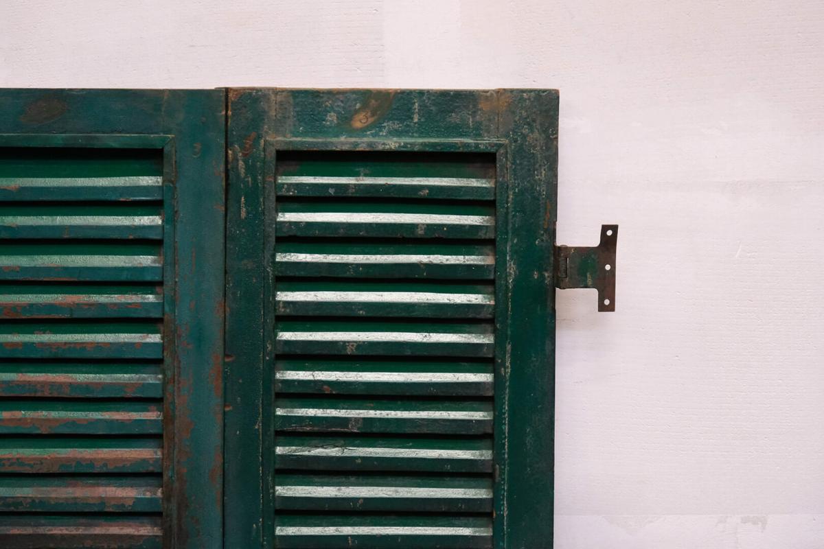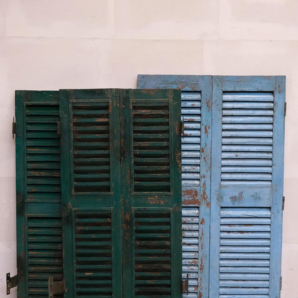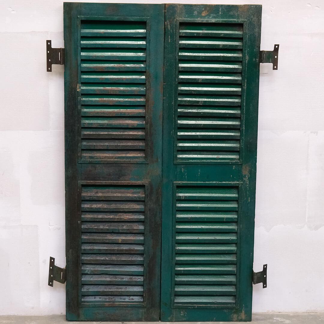 Skønne gamle vinduesskodder med lameller. Brug de smukke patinerede vinduesskodder til en anderledes og unik vægdekoration i din butik eller din restaturant. Vær opmærksom på at der må forventes stor variation i farver og størrelse