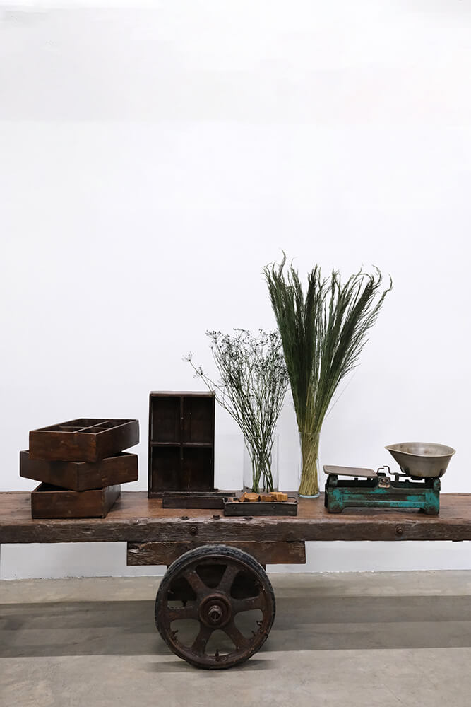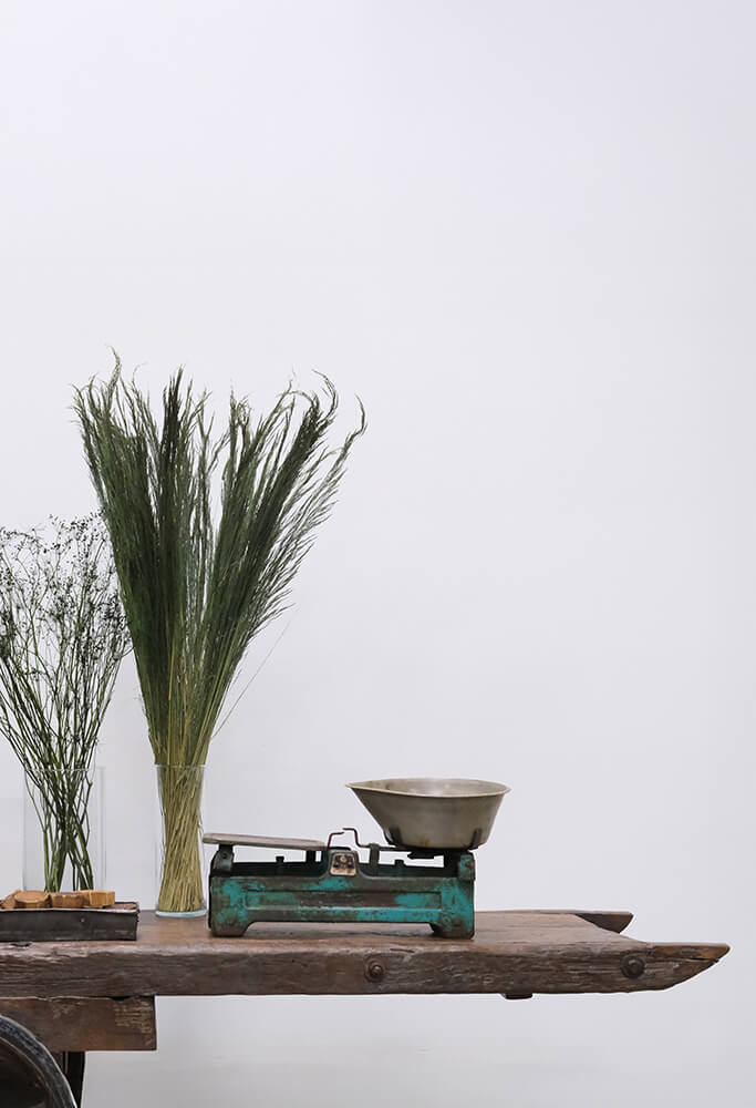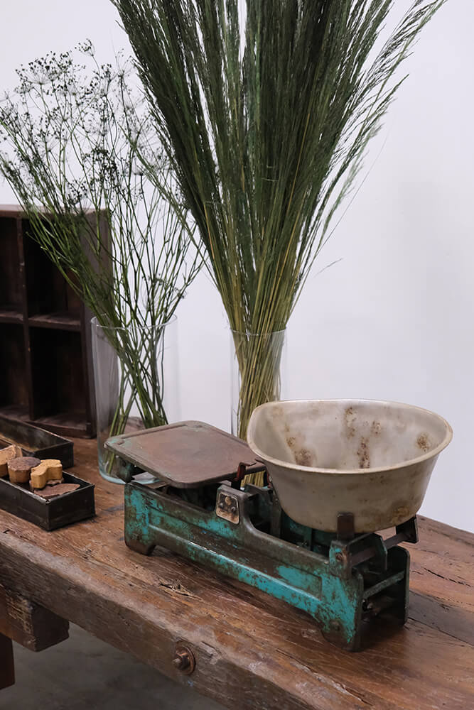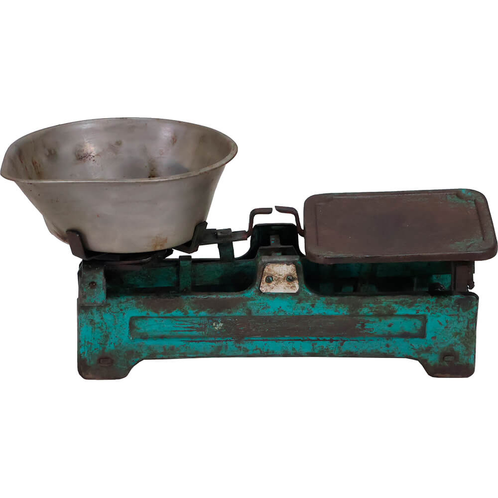 Denne dekorative, gamle bordvægt bringer retrostemning til rummet. Den smukt patinerede skål og blå jernbase gør denne vægt til en interessant dekoration, der komplimenterer en vintage eller industriel indretningsstil.