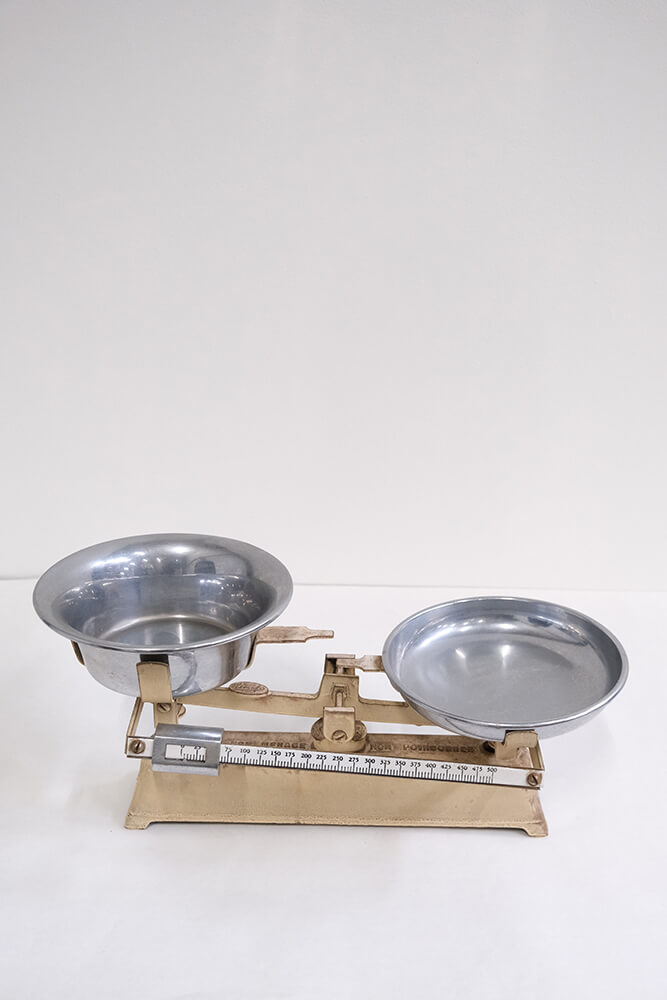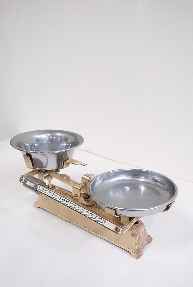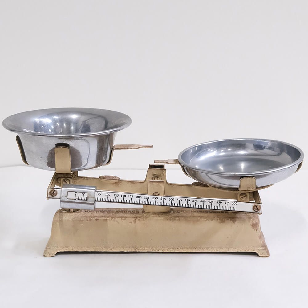 Smuk gammel balancevægt i metal med to aftagelige skåle i jern. Den beige base og de blanke skåle giver vægten et tidløst udtryk, som passer perfekt som dekoration i køkkenet, på en hylde eller i et butiksmiljø. Et autentisk vintagefund med både funktion og æstetik.