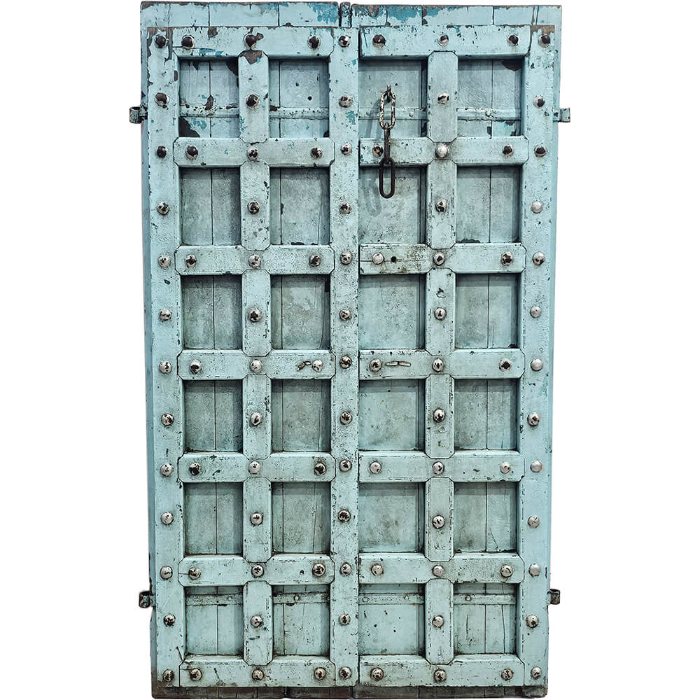 Denne gamle trædør oser af historie og karakter med sin unikke patinering og solide konstruktion. Den turkise overflade vidner om tidens gang, hvor lag af maling og slid skaber en fantastisk dybde og tekstur. De synlige nitter og de dekorative beslag understreger det rå og industrielle look. Døren er perfekt som et stemningsfuldt element i en butik, restaurant eller i hjemmet. Måske som vægdekoration eller en unik skillevæg. Den er et must-have for dig, der elsker autentiske materialer med masser af sjæl og historie.
