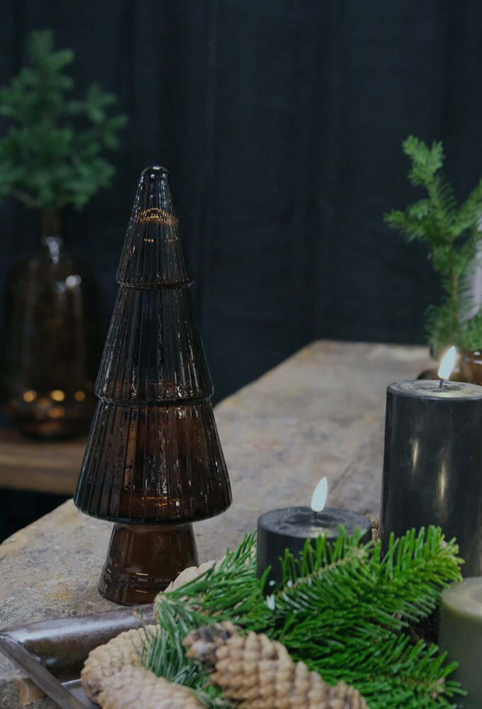 Den dybe, brune farve giver dette juletræ i genanvendt glas et varmt og jordnært udtryk. Den riflede overflade bryder lyset på fineste vis og skaber en hyggelig stemning i hjemmet. Brug det i samspil med andre mørke nuancer eller naturmaterialer og skab en rolig og personlig juledekoration, der ikke larmer, men gør indtryk.