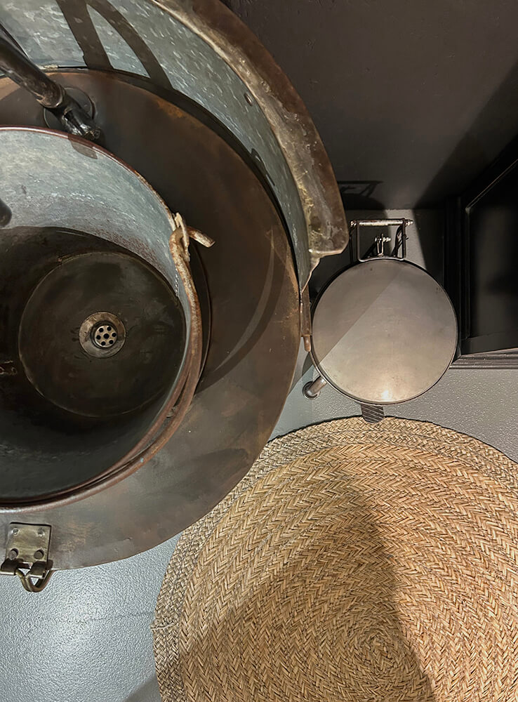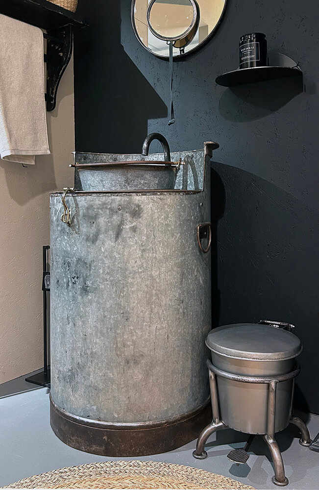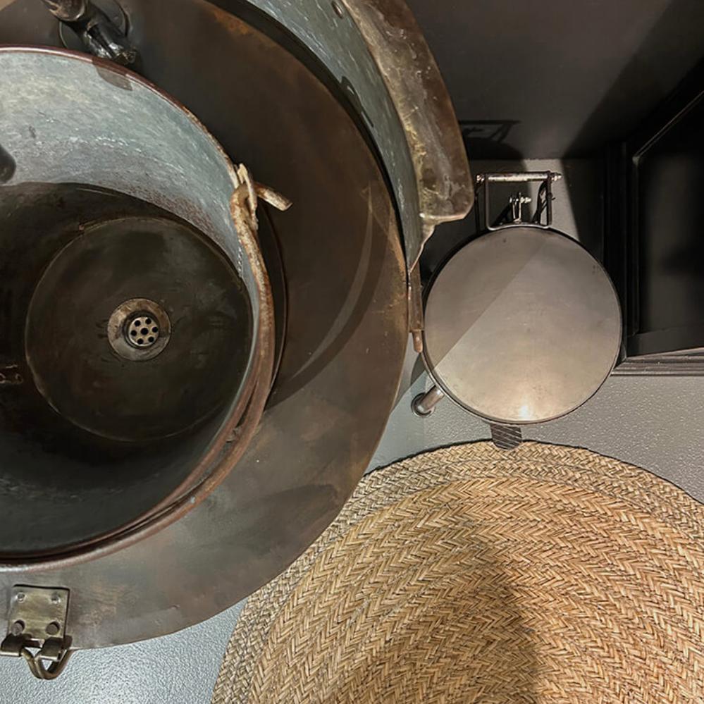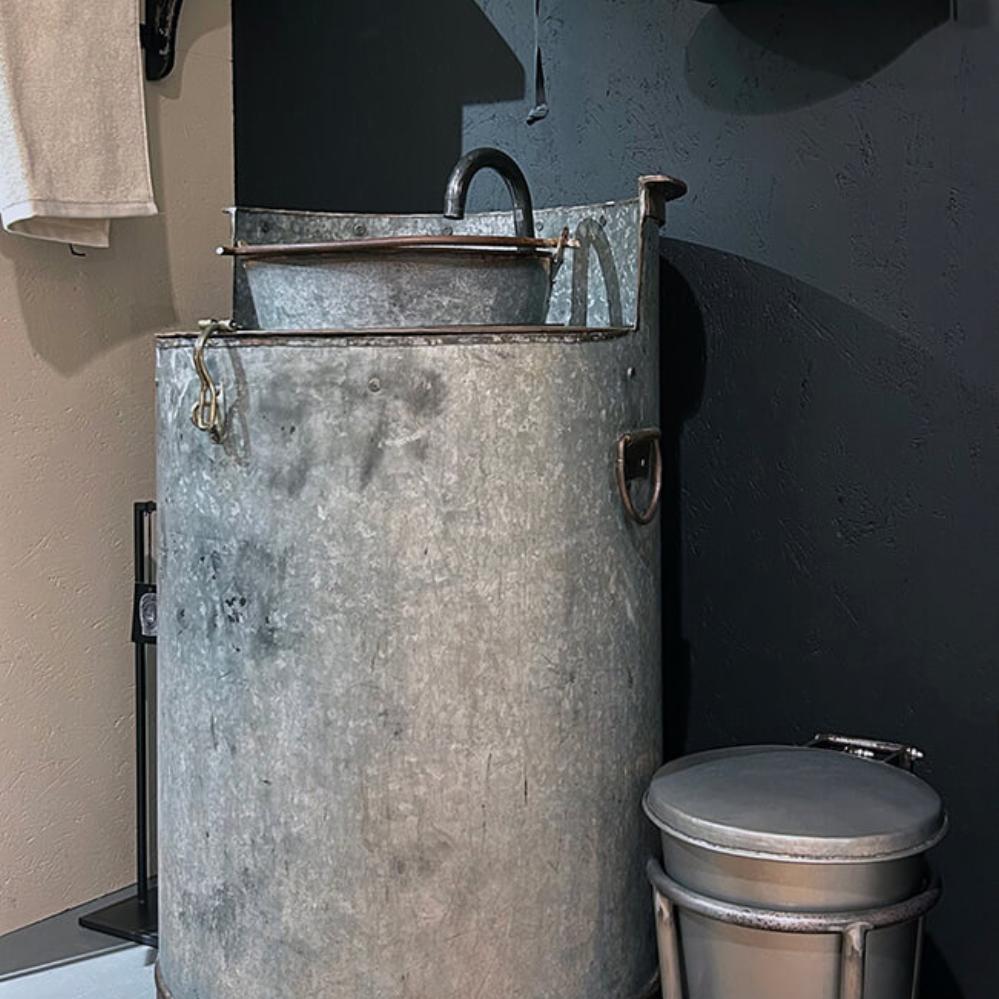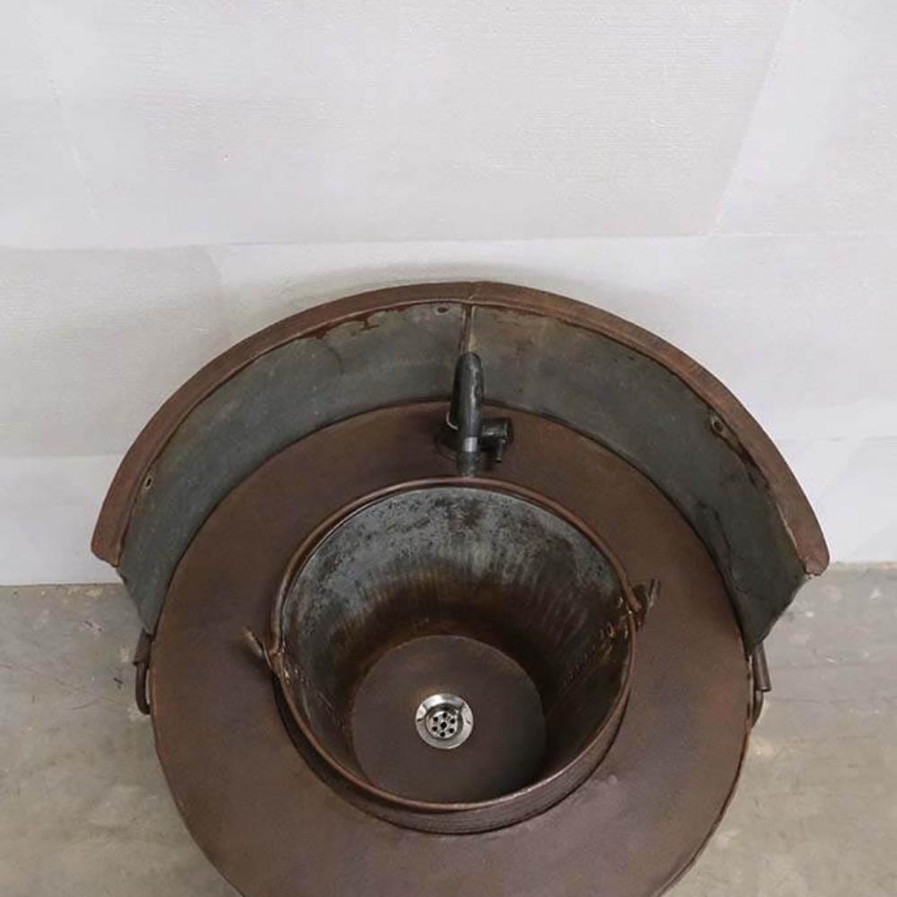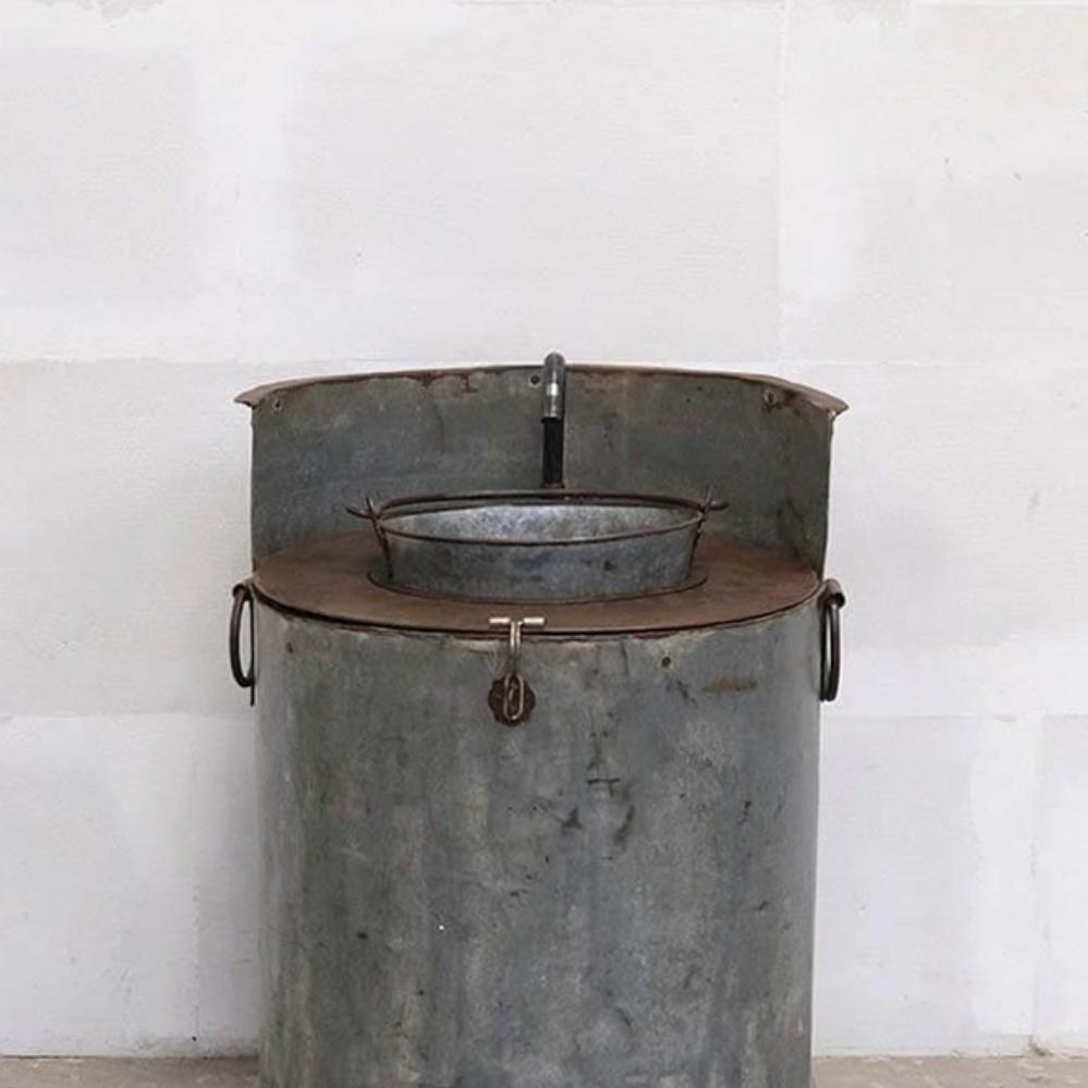 Skøn patineret håndvask integreret i en stor gammel jerntønde, hvilket giver den et råt look. Selve vasken er en gammel zinkspand med en afløbssi i bunden. Vasken er til udendørs brug, da vandet løber direkte ud. Spanden kan tages op og tømmes for affald. Vandslange medfølger for tilslutning til vand.