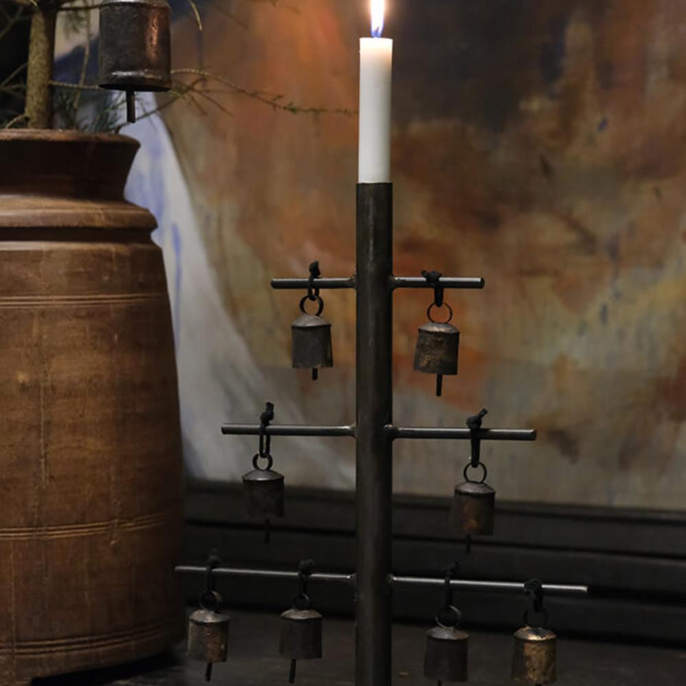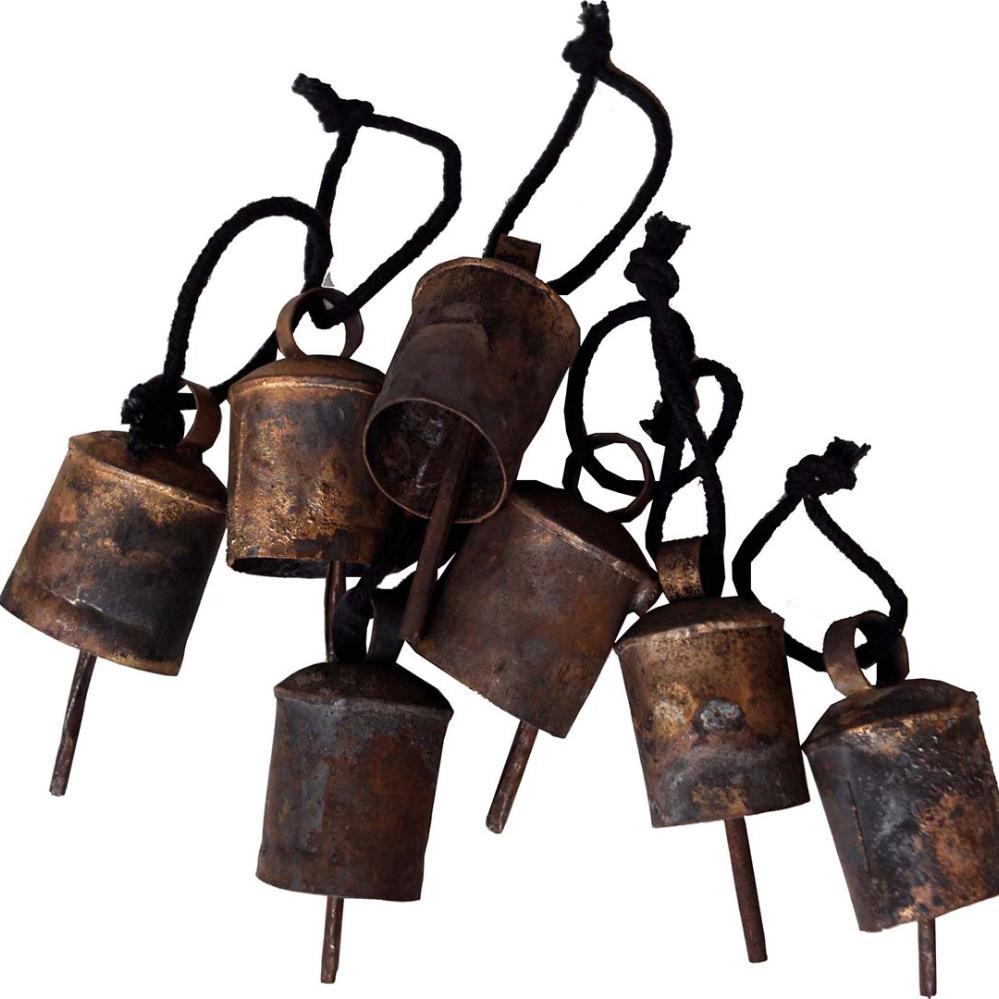 Rustikke gamle små klokker i jern og med sort jute snor. Klokkerne bruges i Indien til at hænge på gedernes halsbånd. Vi har blot tilført en lille sort jute snor, og derved får klokken mulighed for en anden anvendelsesmulighed i din indretning. Til jul er de skønne små klokker dekorative til juletræet eller til en vase med fyrgrene.