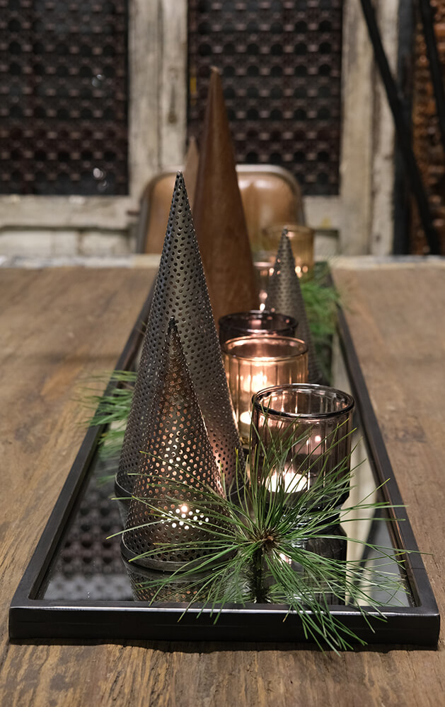 Så fint juletræ i perforeret jern med tilhørende skål til fyrfadslys. Lad lyset glitre ud gennem hullerne i jernet og bring julehyggen ind i dit hjem. Du kan også vende juletræet og bruge det som et råt kræmmerhus. Skålen er stor nok til både de små og store fyrfadslys. Passer perfekt med det lidt større juletræ (M16610).