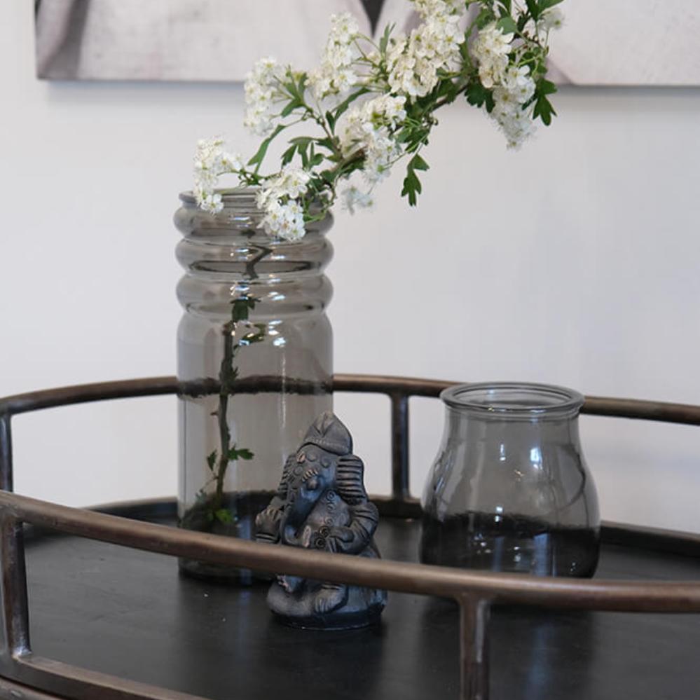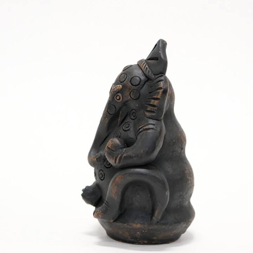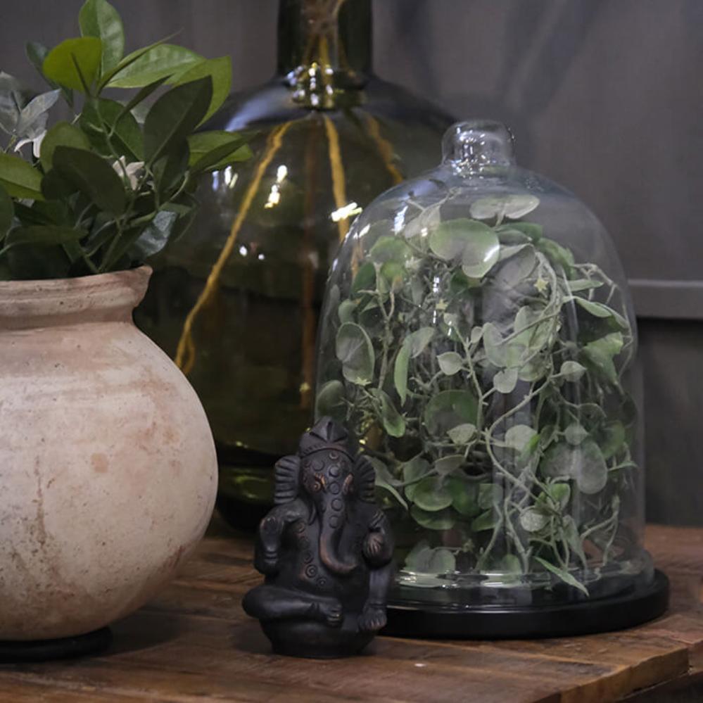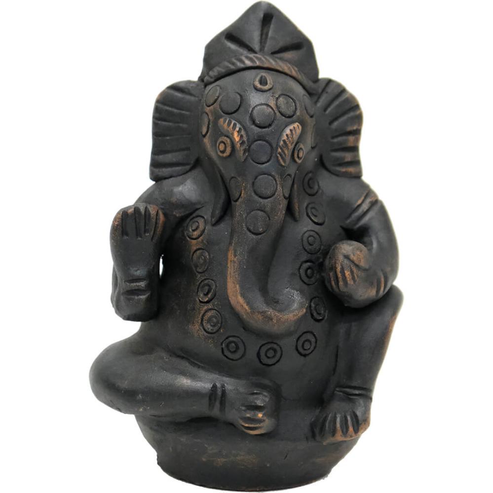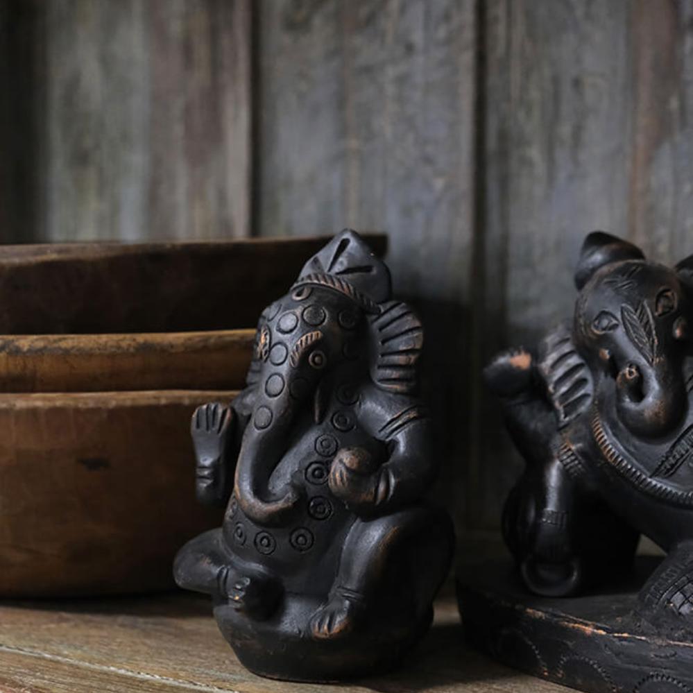 Smuk Ganesha figur i ler, der forestiller den elskede gud med elefanthovedet i en klassisk, siddende positur. Ganesha er kendt som guden for visdom, intelligens, held og skæbne, og som ”den der fjerner alle hindringer”. Med sin løftede hånd velsigner han sine tilbedere og spreder en følelse af tryghed og beskyttelse. De fine detaljer i leret giver figuren et autentisk og levende udtryk, der gør den oplagt både som dekorativt element i hjemmet eller som en stemningsskabende detalje i en café eller butik. Den mørke overflade med let patineret finish giver figuren et roligt og tidløst udtryk, som passer ind i mange forskellige stilarter.
