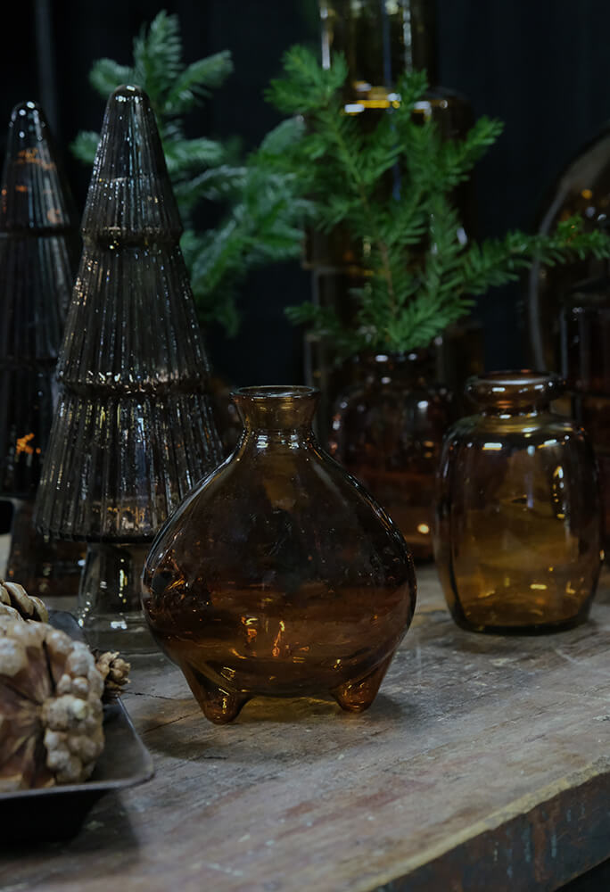 En enkelt og smuk vase med balloneffekt i mørkt ravfarvet genanvendt glas. Vasen er 18 cm høj, og derfor er den særligt god til håndplukkede små blomster fra haven eller små dekorative grene. Du kan nemt kombinere disse vaser i par eller have dem stående på bordet sammen med andet enkelt og dekorativt nips. Denne lille glasvase er en perfekt gave til en, du holder af, eller simpelthen som gave til dig selv. Vasen er lavet af genanvendt glas, og der kan derfor forekomme små bobler og mindre ujævnheder i glasset.