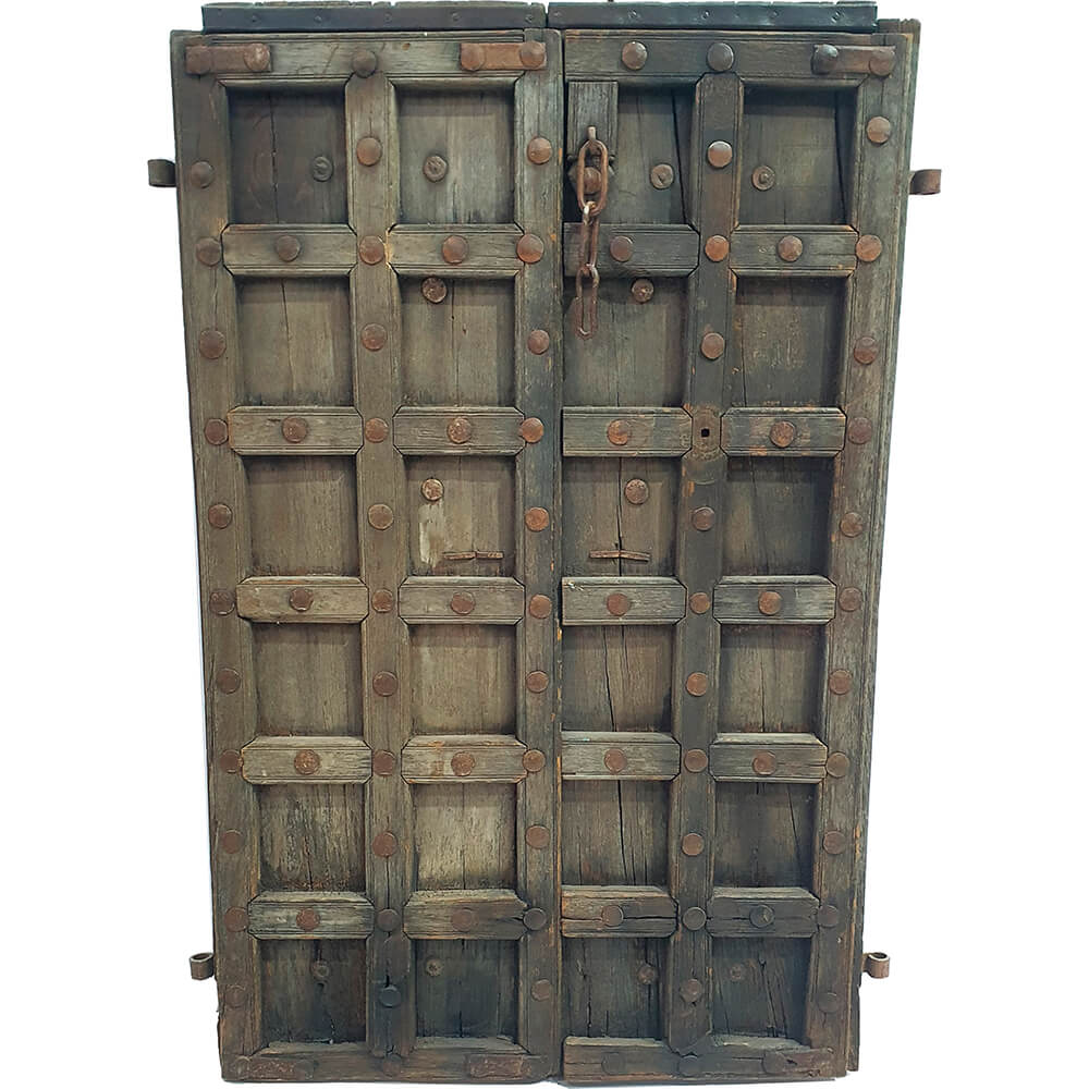 Denne gamle trædør er et imponerende stykke håndværk med et markant, robust udtryk. Døren er opbygget i kraftige træplanker med en tydelig feltdeling, hvor de mange runde trædyvler og jernnagler skaber et dekorativt og næsten grafisk mønster. Konstruktionen vidner om en tid, hvor døren skulle være både solid og holdbar. Overfladen har en smuk, naturlig patina med slid, revner og farvevariationer, som kun opstår gennem mange års brug. De originale metaldetaljer – herunder den rustikke ring og låsebeslag – understreger dørenes autentiske karakter og giver et råt, historisk præg. Døren egner sig perfekt som et markant statement i indretningen, enten som vægdekoration, skydedør, rumdeler eller kreativt genbrug i et moderne hjem. Et unikt fund til dig, der sætter pris på materialer med sjæl, historie og masser af karakter.