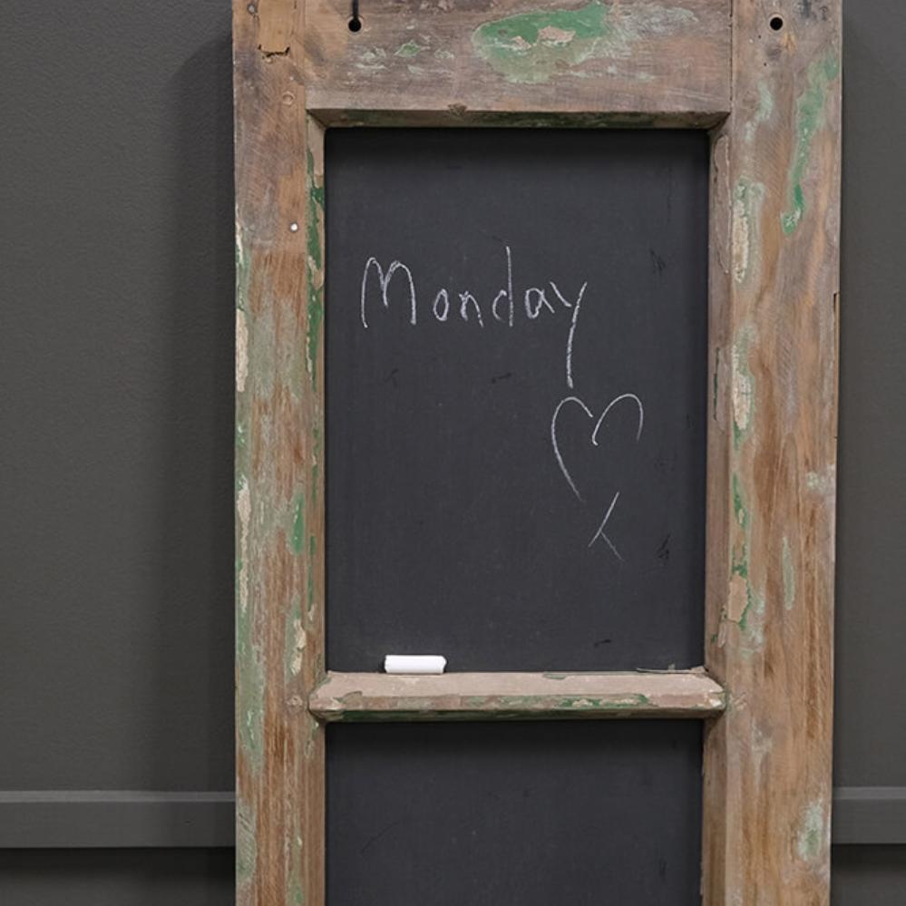 Denne fine tavle er lavet af en gammel vinduesramme, som har fået nyt liv. Den rå træramme med spor af patina og tidligere maling giver tavlen et charmerende, vintage udtryk, der tilføjer sjæl til ethvert rum. De fire separate tavlefelter giver dig rig mulighed for at skrive noter, lave lister eller til små beskeder - perfekt til caféer, butikker eller hjemmet, hvor den kan bruges både praktisk og dekorativt. Med sit smalle, vertikale design passer tavlen nemt ind på væggen, uden at den optager for meget plads. Det er genbrug med stil og en måde at tilføre din indretning noget helt særligt.