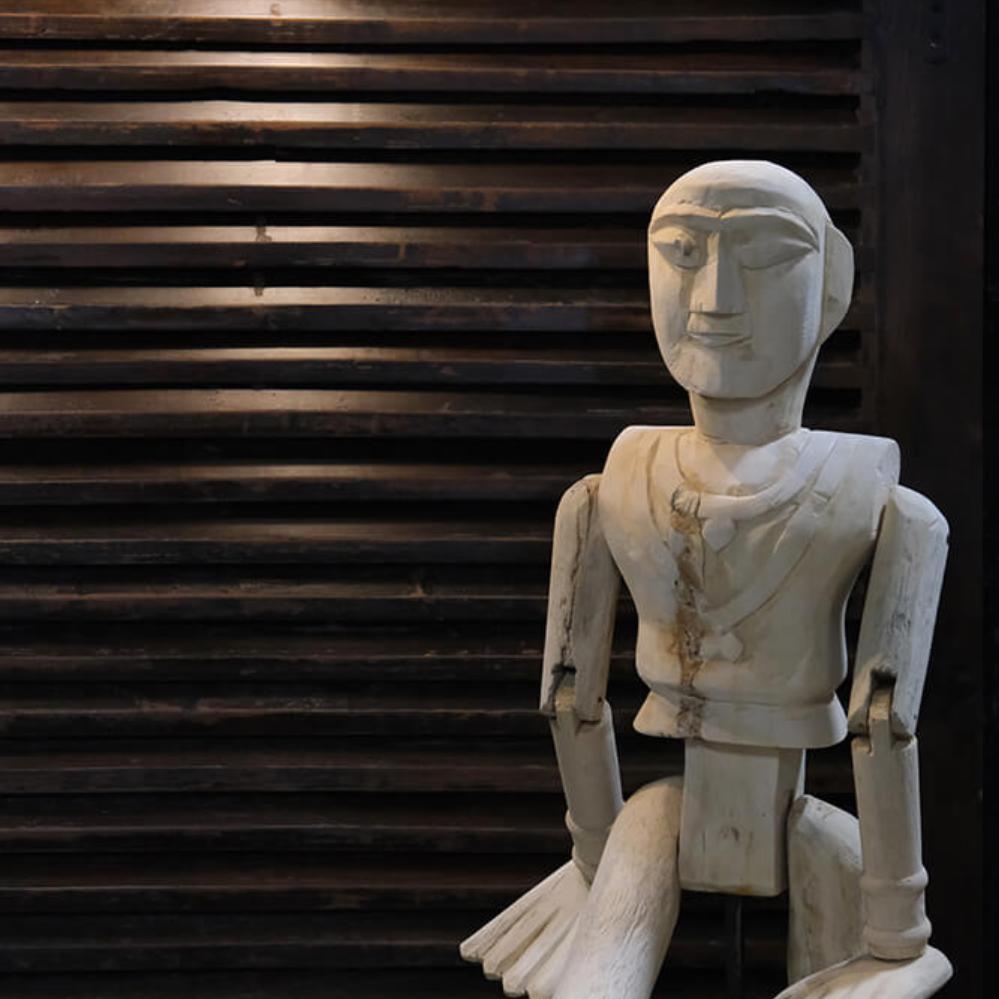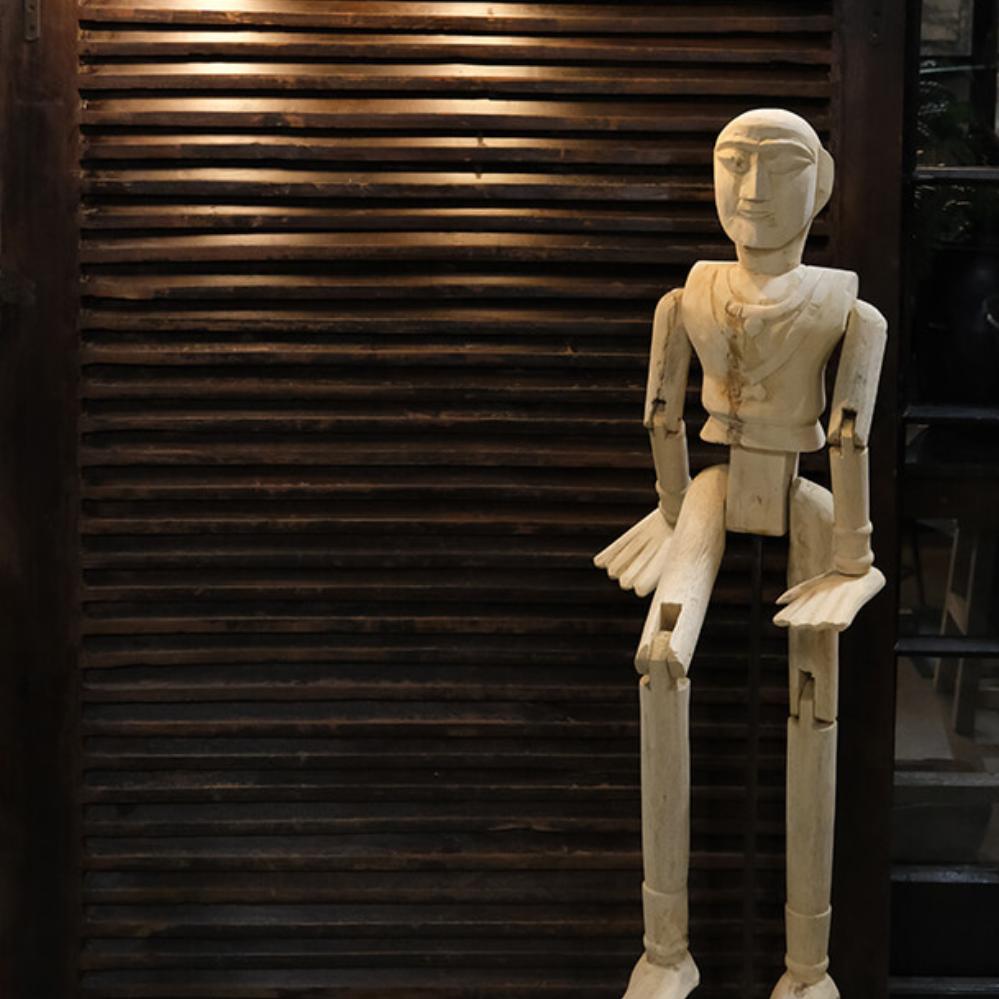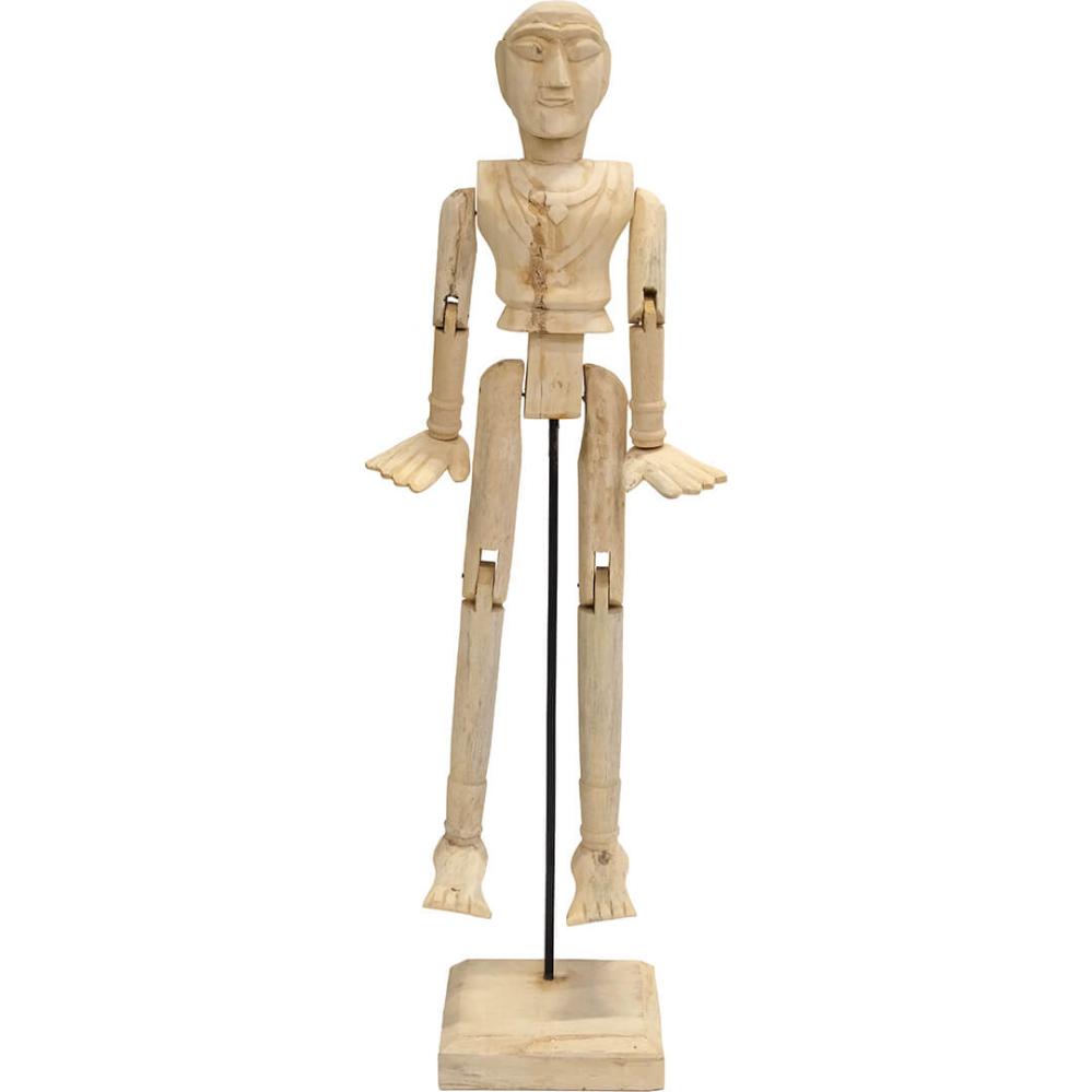 Sjov træfigur med fleksible led. Figuren har mange fine detaljer i form af beskæringer og strukturen i træet. Figurens højde på 140 cm vil helt sikkert vække opsigt og du kan eksempelvis få den til at hilse ved at indstille på de fleksible led. Figuren er fastgjort til en træklods ved hjælp af en metalstang.