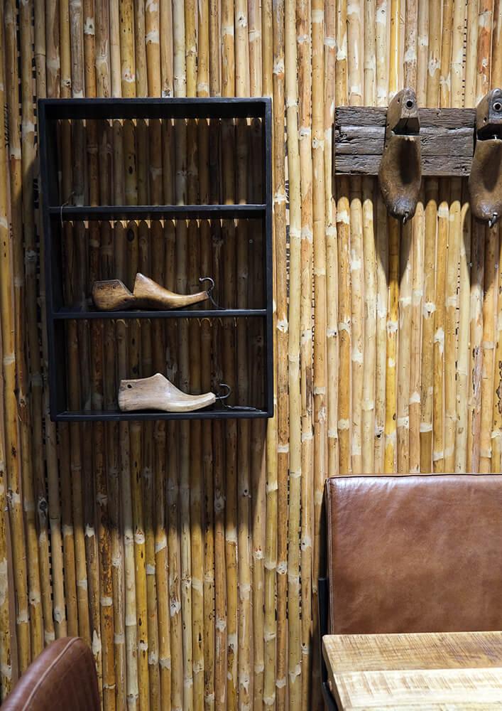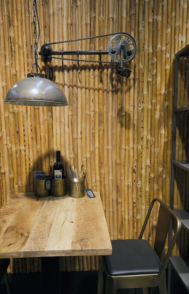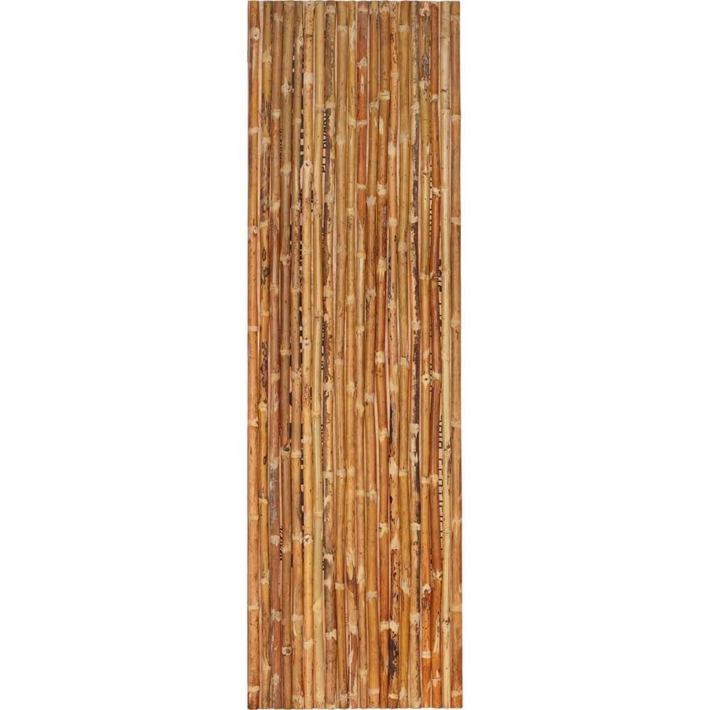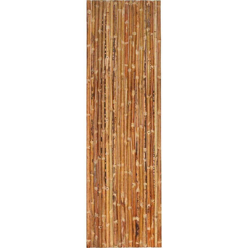 Denne vægplade er beklædt med naturlige bambusrør, som giver et tropisk og rustikt udseende. Bambusrørene er halveret og monteret tæt sammen og skaber en naturlig tekstur med en varm og organisk farvetone. Pladens overflade er ujævn på grund af bambusrørenes naturlige variation, hvilket tilføjer en autentisk charme. Denne vægplade vil være helt ideel som dekorativt element i et rum, der ønsker en forbindelse til naturen eller et mere eksotisk udtryk. Det kunne fungere godt som bagvæg, bygges som en rumdeler eller et stilfuldt panel både i hjemmet, i butikken eller i restauranten.