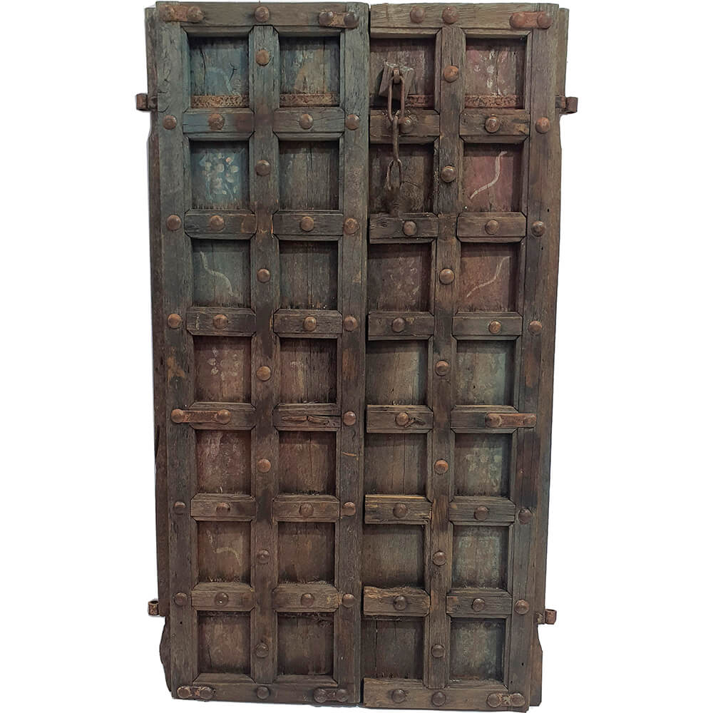 Denne gamle trædør er fuld af karakter og skønne detaljer. Den er opbygget af kraftige træfelter med mange originale jernnagler, som giver døren et solidt og autentisk udtryk. Overfladen bærer en smuk patina med spor af tid, slid og afdæmpede farvenuancer, der gør hver enkelt detalje levende. Den originale lås og jernbeslag understreger dørens historie og gør den oplagt som dekorativt element i indretningen enten som vægdekoration, rumdeler eller et markant blikfang.