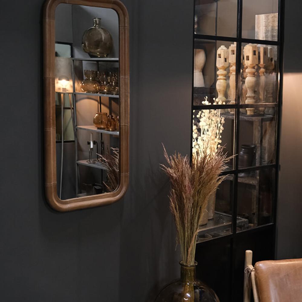Dette spejl er indrammet i råt læder, der tilfører en charme i ethvert rum. Den bløde, afrundede ramme i lys brun læder giver spejlet et tidløst og klassisk udtryk, mens synlige syninger tilføjer et strejf af kant. Perfekt som både funktionelt spejl og dekorativt element, skaber det en luksuriøs atmosfære i alt fra entreen til soveværelset. Læderrammen gør spejlet robust og stilfuldt, hvilket gør det ideelt til at komplementere en moderne eller rustik indretning.
