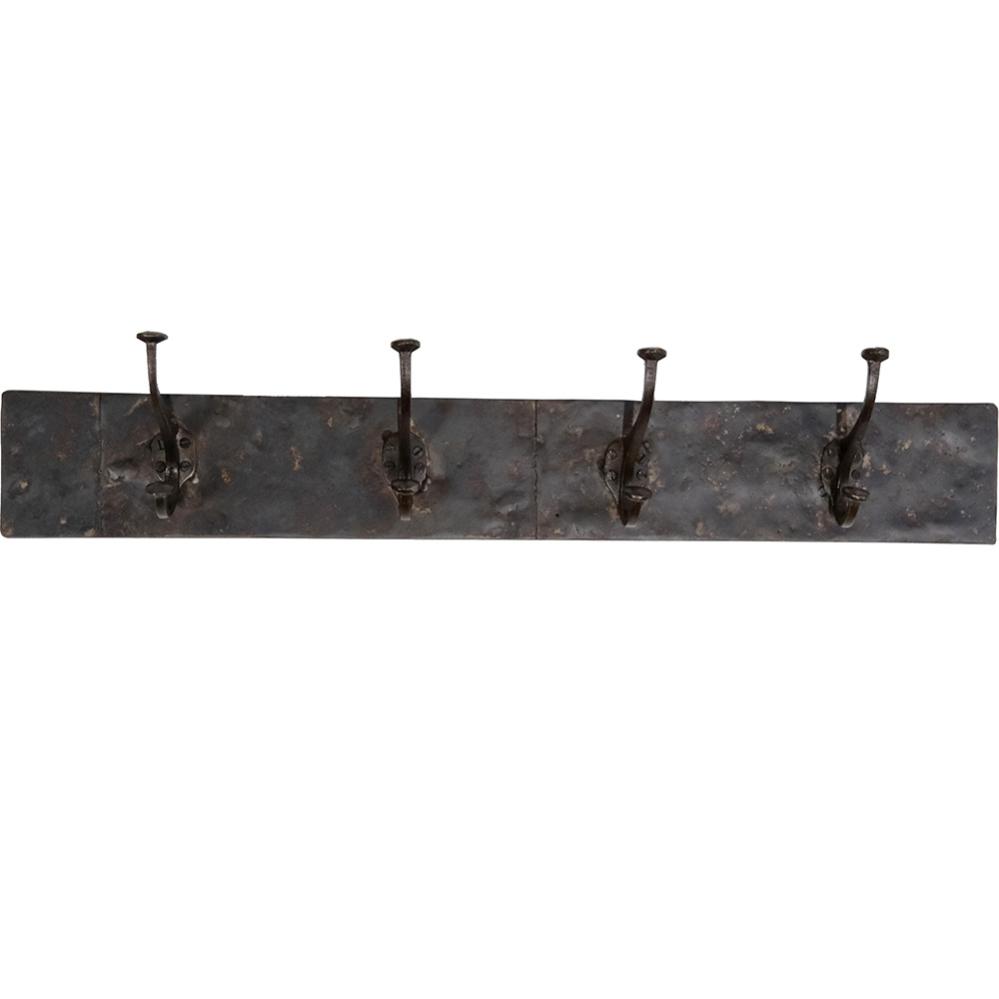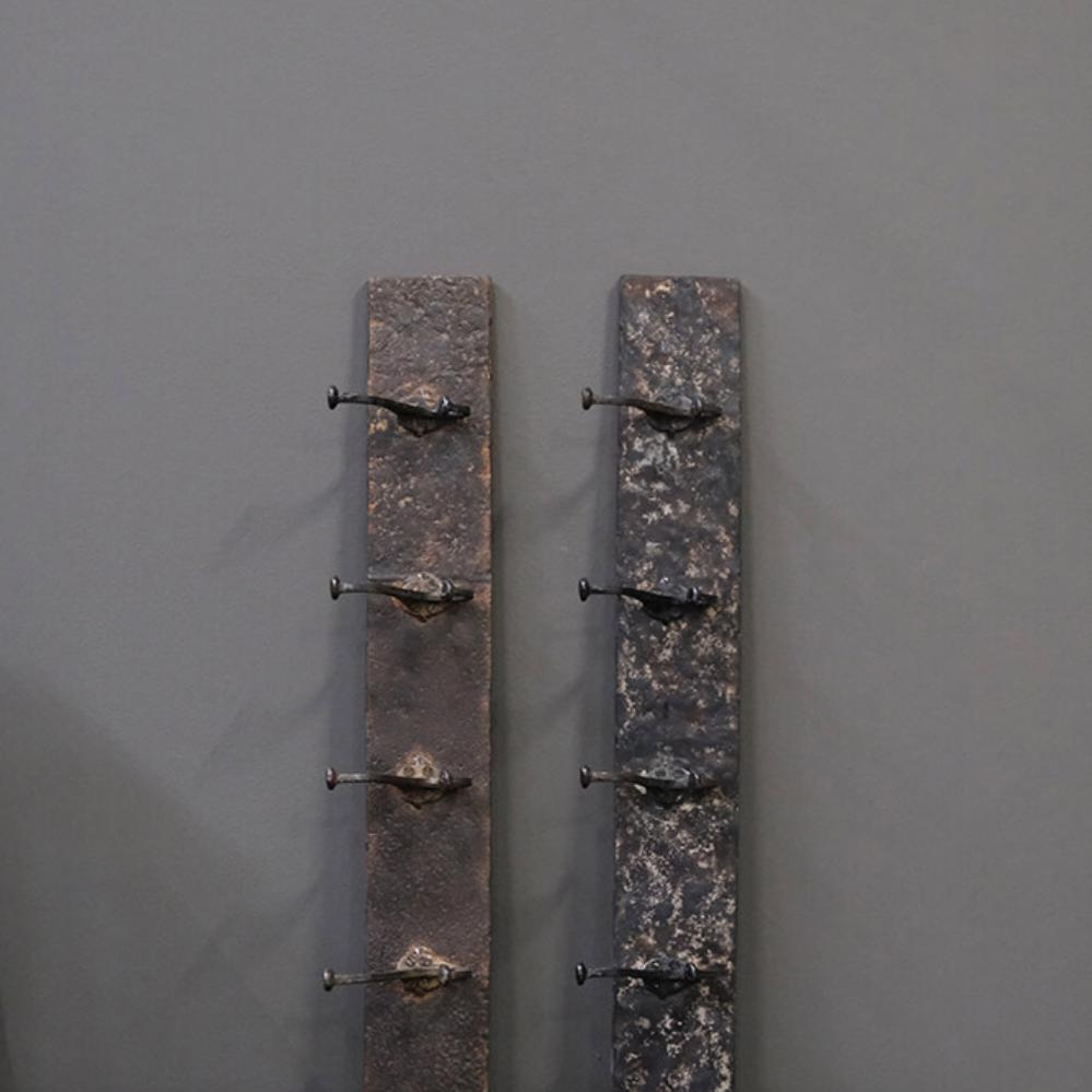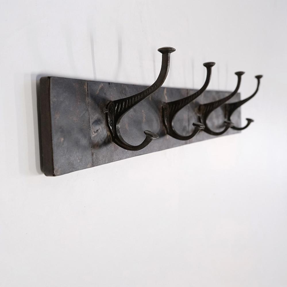 Ella knagerække med 4 knager i jern – en rå og upcycled løsning til din væg. Bagpladen på denne knagerække er skabt af genbrugte køreplader, som tidligere har tjent i Indiens industriområder. Denne karakteristiske baggrund bærer præg af sin industrielle fortid, med spor af cement og lignende materialer, der tilføjer autenticitet og historie til hvert eksemplar. Med dens fire knager giver den en praktisk mulighed for at organisering, samtidig med at den fortæller en historie. Lad Ella knagerækken være det funktionelle og maskuline indslag, der skiller sig ud i din indretning.