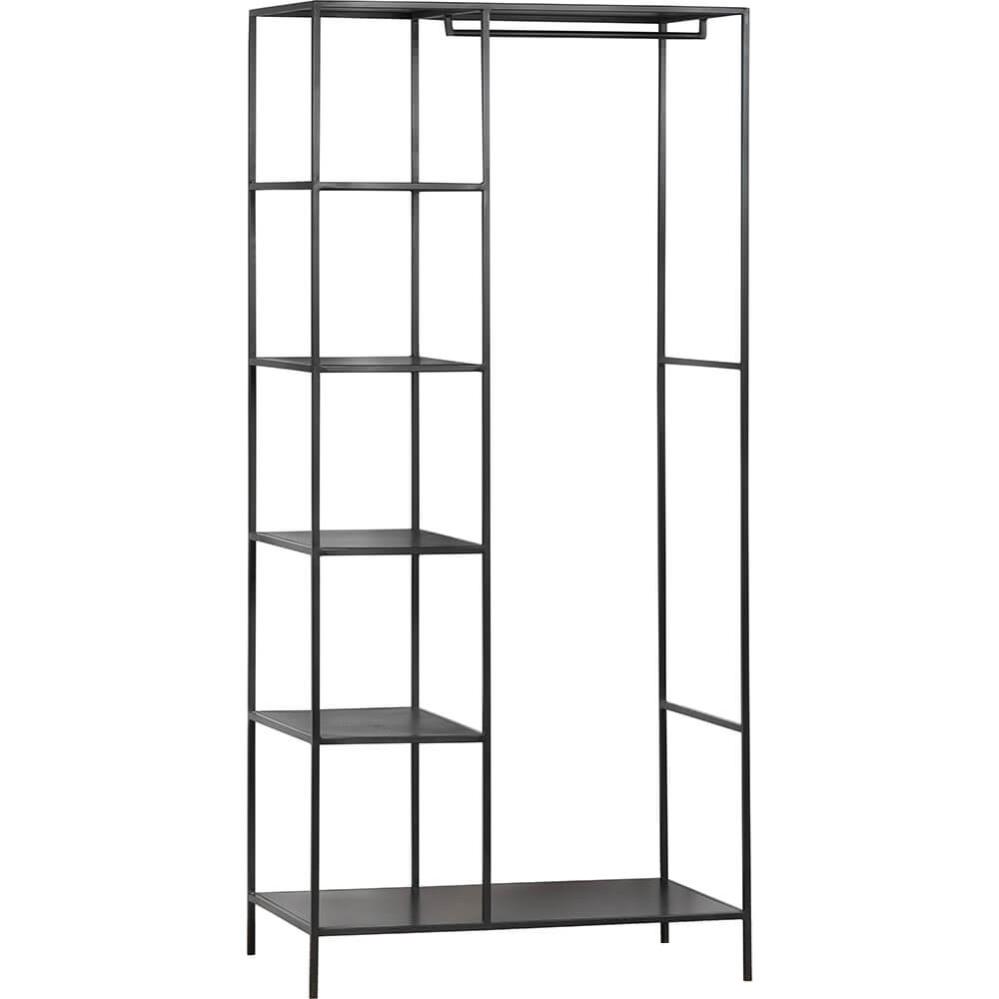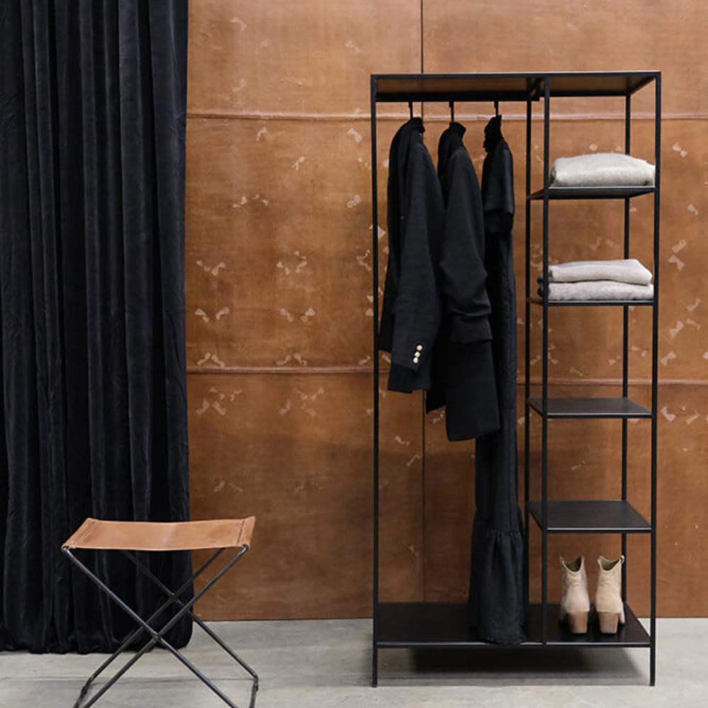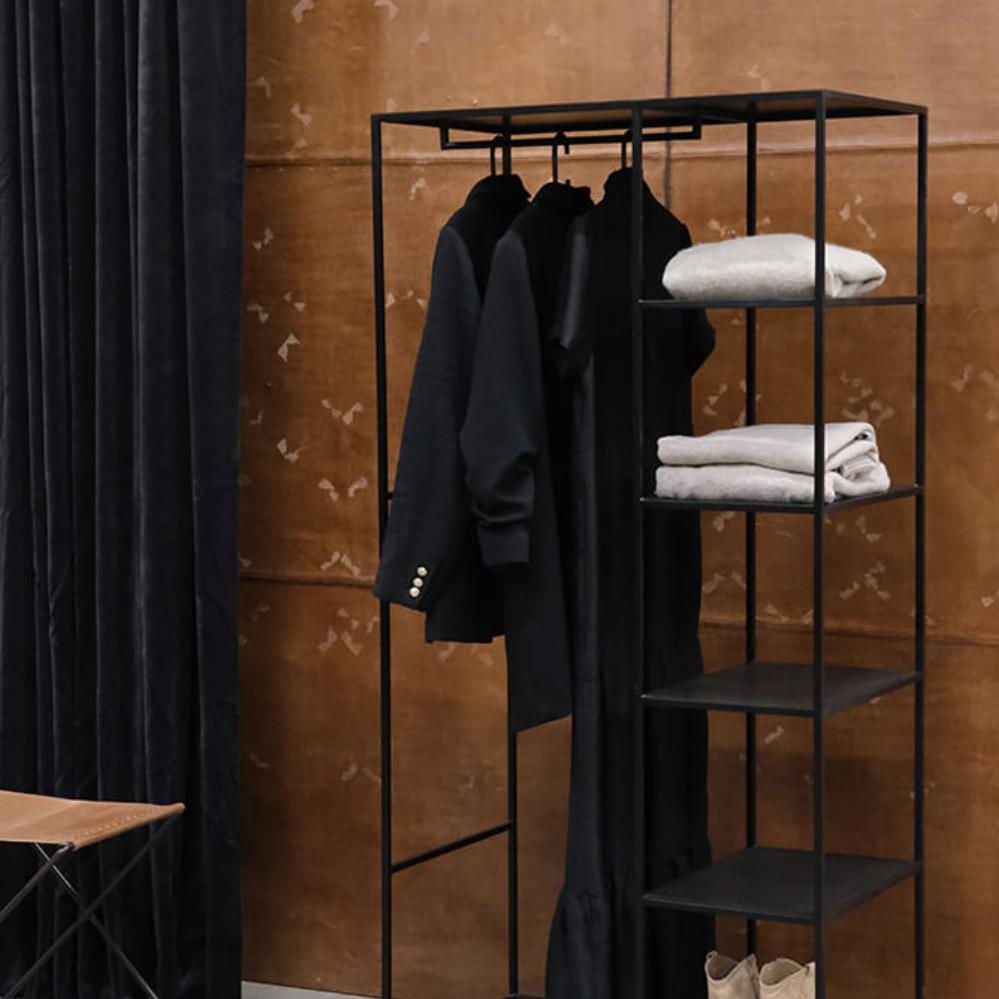 Dette garderobestativ i jern er den perfekte løsning til opbevaring og præsentation af tøj og accessories. Med 5 hylder og en praktisk bøjle til ophængning af tøj, giver det dig masser af opbevaringsmuligheder. Pladen på toppen kan også bruges som en ekstra hylde til f.eks. store krukker eller vaser. Det tidløse og stilrene design passer ind i enhver indretningsstil og vil tilføre elegance både i en butik, showroom eller i et hjem. Lad dette garderobestativ i jern hjælpe dig med at organisere og præsentere dine produkter på en yderst imponerende måde. Afstanden mellem hylderne er 29 cm.