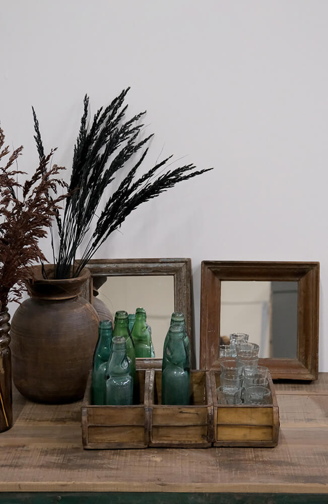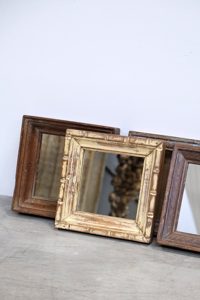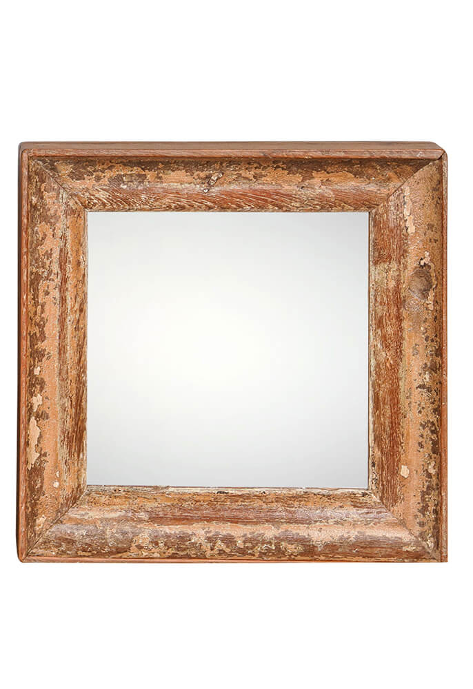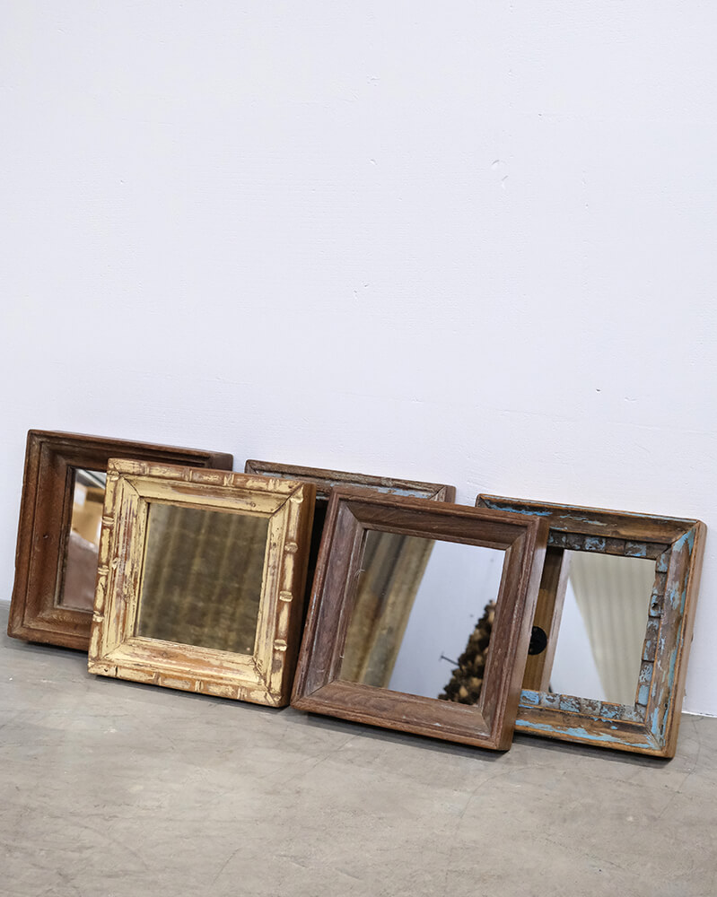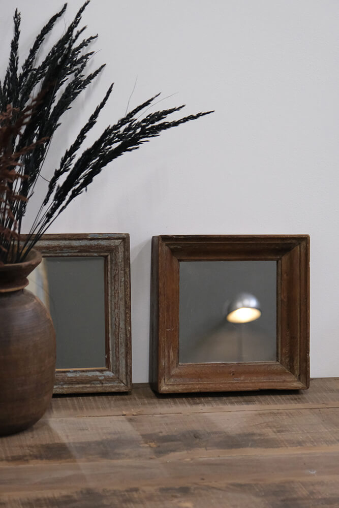 Dekorativt spejl med genanvendt træramme, hvor tidens spor sætter sit præg på udtrykket. Den slidte overflade og varme træfarve tilfører charme og personlighed til indretningen. Et spejl, der både reflekterer lys og fortæller historie. Perfekt til at skabe varme og karakter i butikken, restauranten eller i dit hjem.