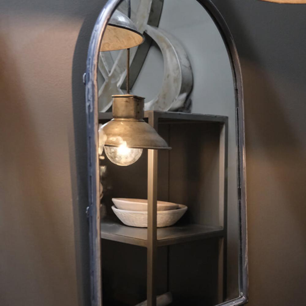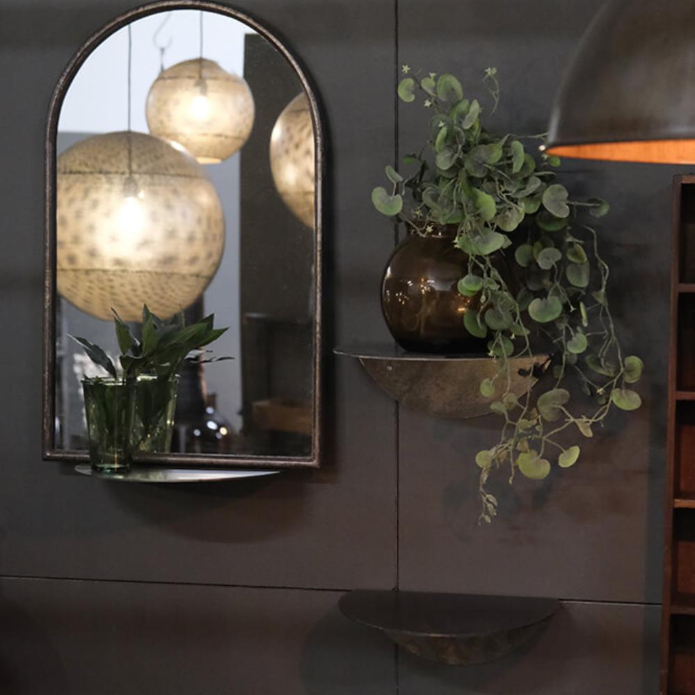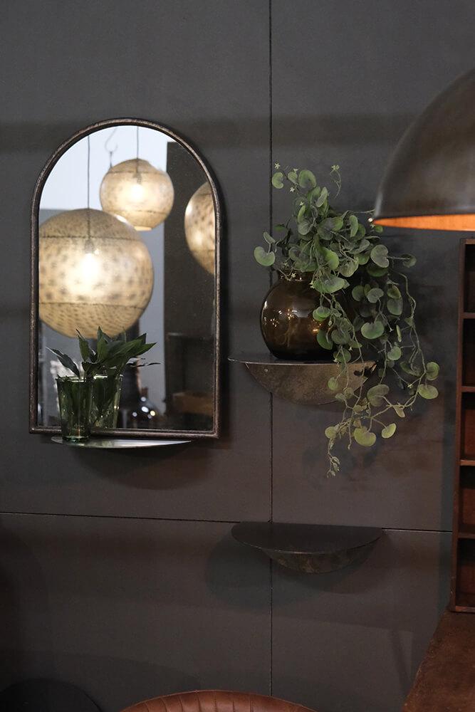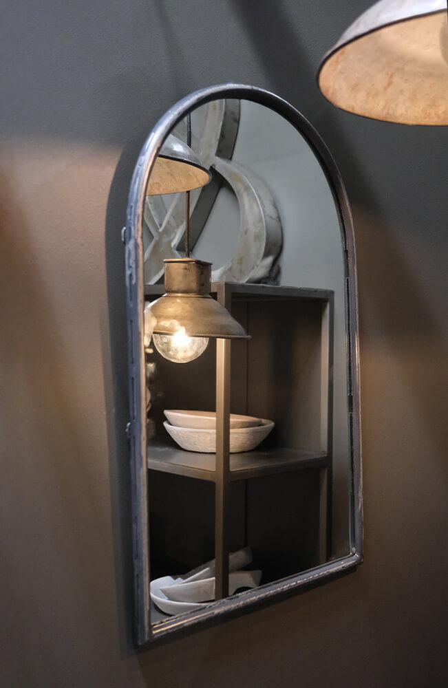 Spejl med klarlakeret jernramme og en buet top. Er du på jagt efter et maskulint spejl, vil dette spejl med den rå jernramme give din indretning et cool og enkelt udtryk. Brug f.eks. spejlet i et mindre rum, hvor du kan udnytte at spejlet vil skabe en illusion af mere plads.