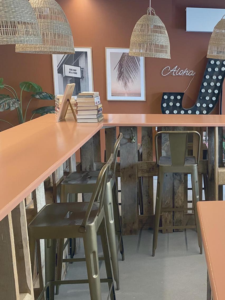 I ”The Study Club”, som studierummet meget passende hedder, var det Bibis ønske at skabe et rum, med plads til mange studerende, som samtidig gav god mulighed for gruppearbejde. ”Jeg tænkte længe over, hvordan jeg kunne knække koden og få skabt et socialt studierum. En dag faldt jeg heldigvis over et foto fra en bar i New York, hvor man havde stillet barborde op i en hestesko med barstole på begge sider. Det var helt genialt, og jeg tænkte straks, at det kunne jeg bruge i mit studierum. Her kan man som studerende nemt sidde mange i studiemiljøet og komme hinanden ved, i stedet for at sidde alene og optage et helt bord. Med barstolene i antikmessing fra Trademark Living, er der plads til mange og jeg synes også de passer perfekt i stilen.”