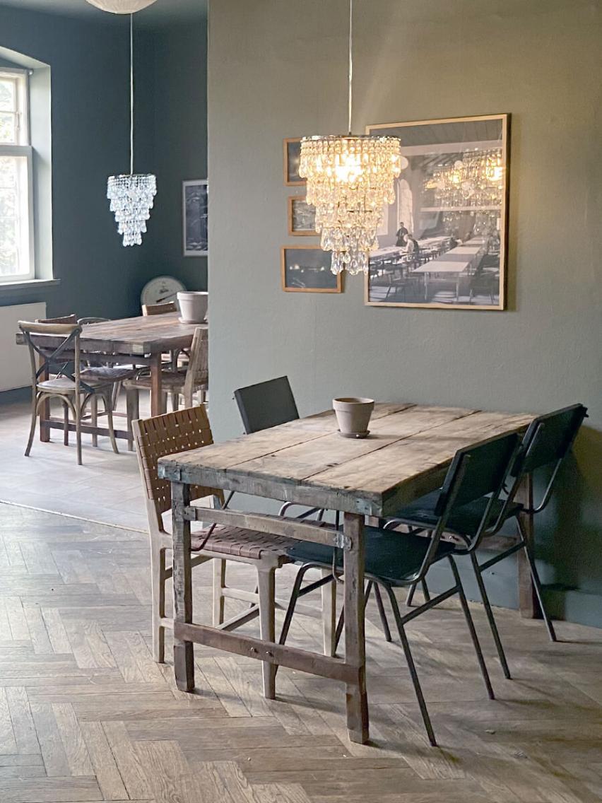 ”Jeg har indrettet lokalerne med henblik på sociale aktiviteter for de lokale, og jeg har ønsket, at bæredygtighed og hjemlig stemning skulle være nogle af nøgleordene. Et af mine første valg var derfor de rustikke borde i genbrugstræ fra Trademark Living, tilsat en blanding af stole i forskellige materialer,” fortæller Bibi. ”Jeg har arbejdet med, at de forskellige rum har hver deres udstråling og indbyder til at kunne samles om lige præcis det, man har lyst til. Om det er at mødes over madlavning, en bogklub, en familiefest, et brætspil eller “bare” at læne sig tilbage i en blød sofa og samtale om alt eller intet. Et rummeligt, hyggeligt samlepunkt udenfor hjemmet, hvor man samtidig kan få et indblik i Inspektørboligens historie via plakaterne på væggene og de historiefortællende genstande fra det gamle fængsel, jeg har integreret som dekoration i alle rum.”