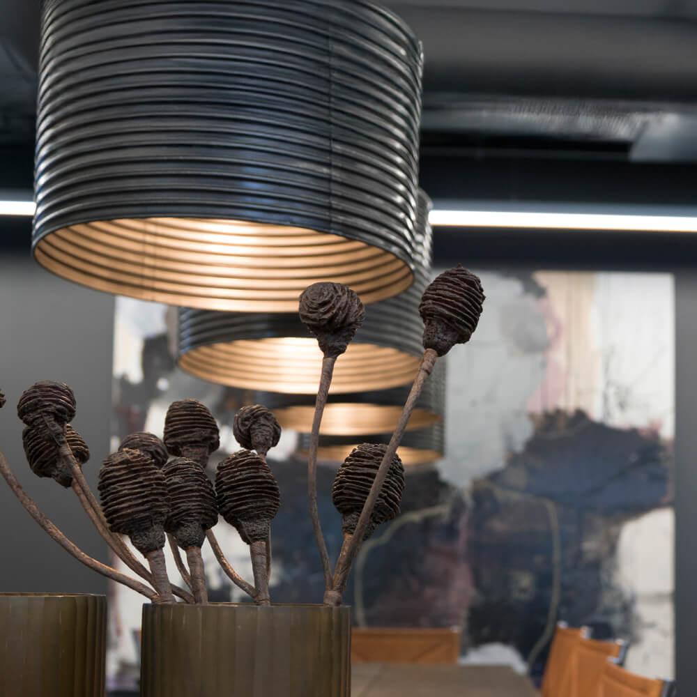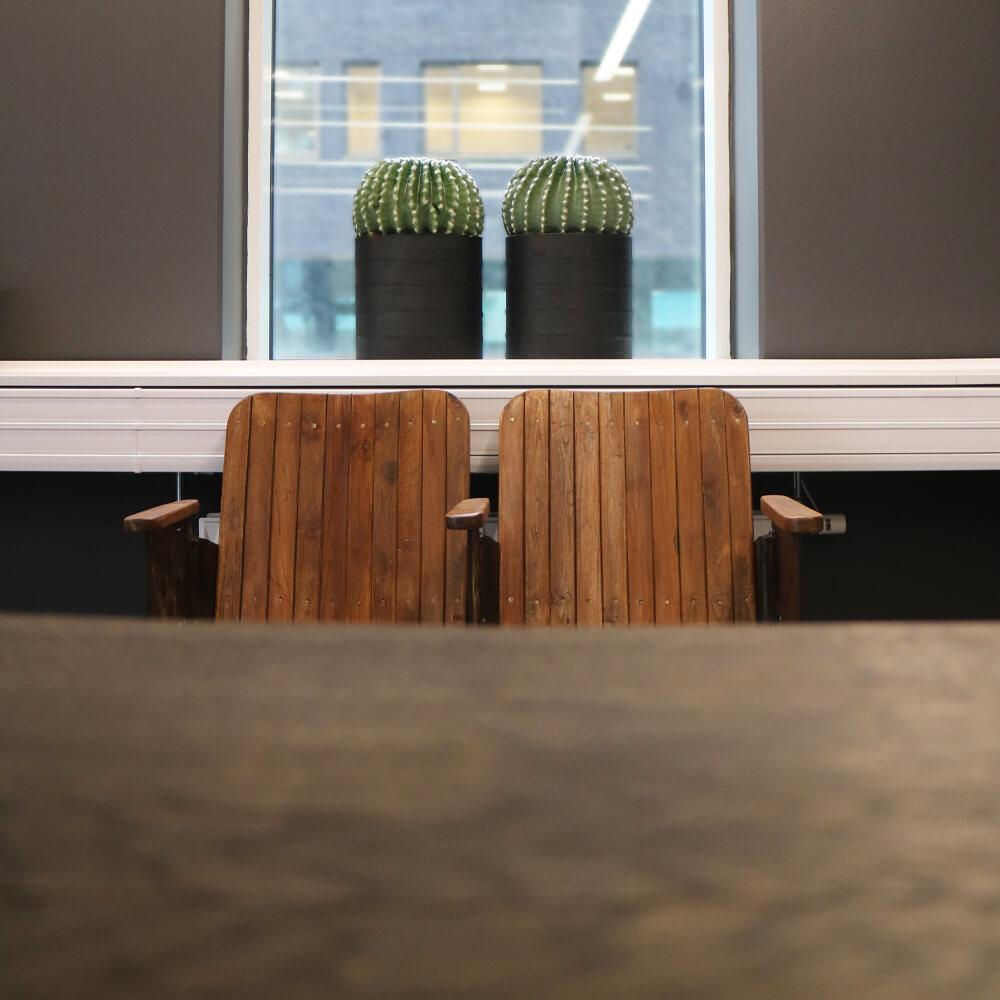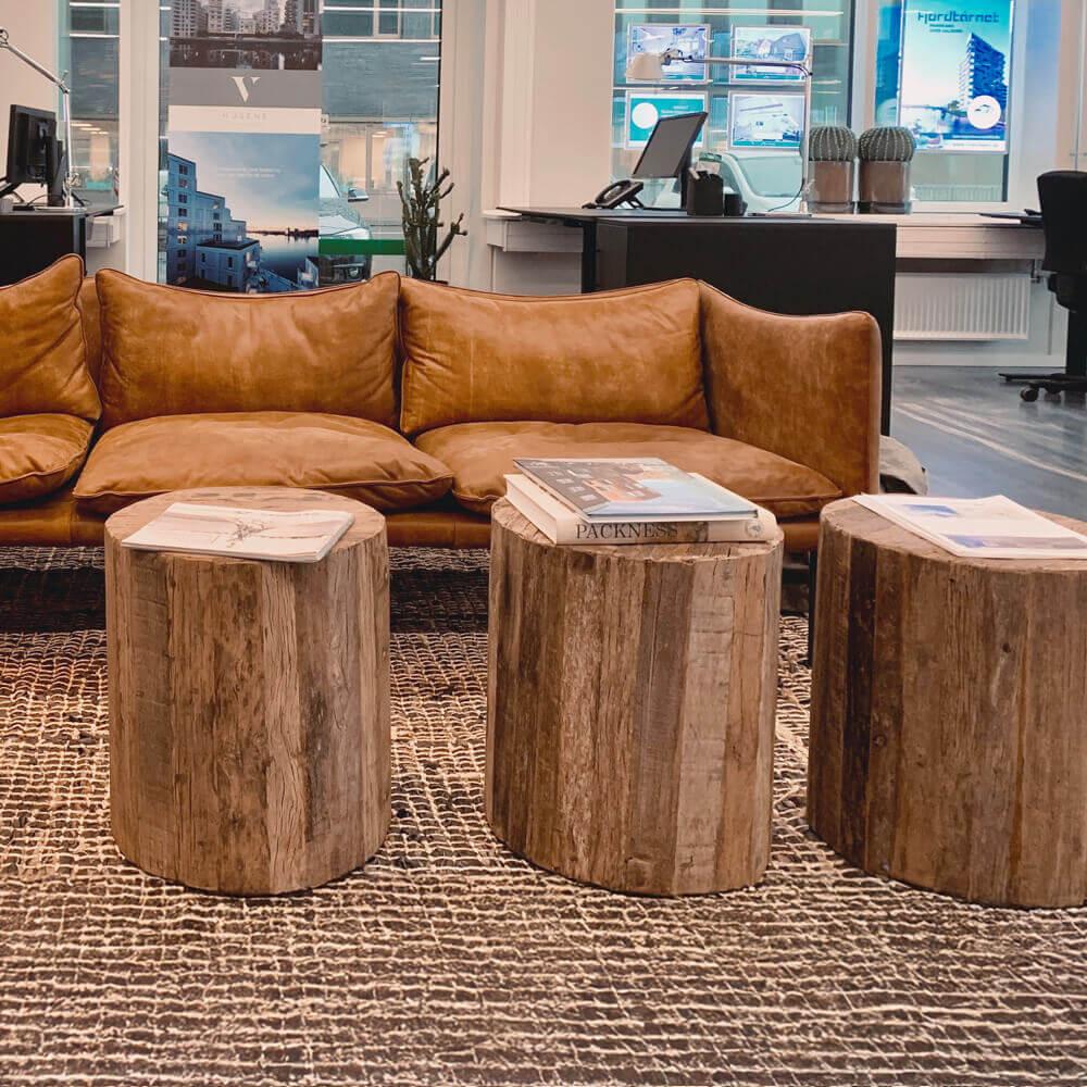 »Vi er glade for det rå interiør fra Trademark Living, der har skabt et meget hyggeligt og unikt ejendomsmæglerkontor« siger Jette Gudiksen. »Og det giver en god fornemmelse at vide, at vi har indrettet med genbrugsmøbler og interiør i genbrugsmaterialer. På den måde er vi med til at spare på ressourcerne her på jorden.«