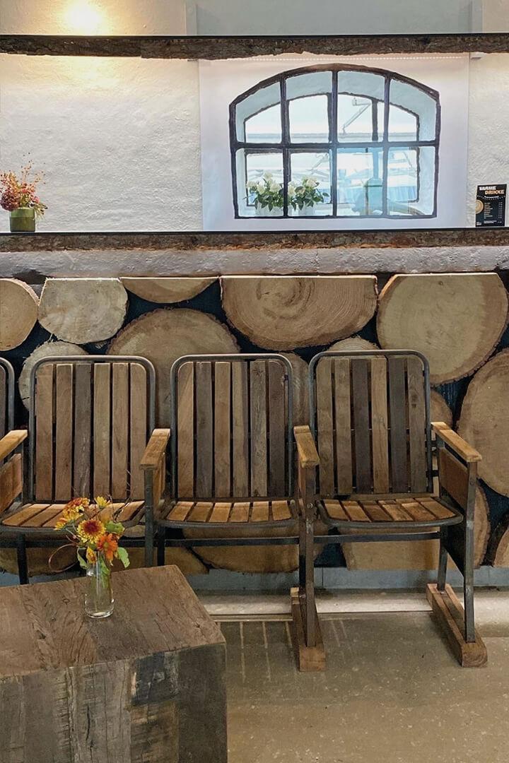 I den ene ende af den gamle staldbygning nedlægges en gammel port til fordel for et stort panoramavindue ud til minigolfbanerne. Her planlægger Klaus og Sandie et loungeområde, hvor gæsterne kan sidde og hygge med en kop kaffe. For at skabe nogle mindre rum i det store lokale, vælger de at stille new york skillevægge op mellem bordene ned langs hele den ene side af det store lokale. Det giver mere privatliv og hygge til gæsterne.