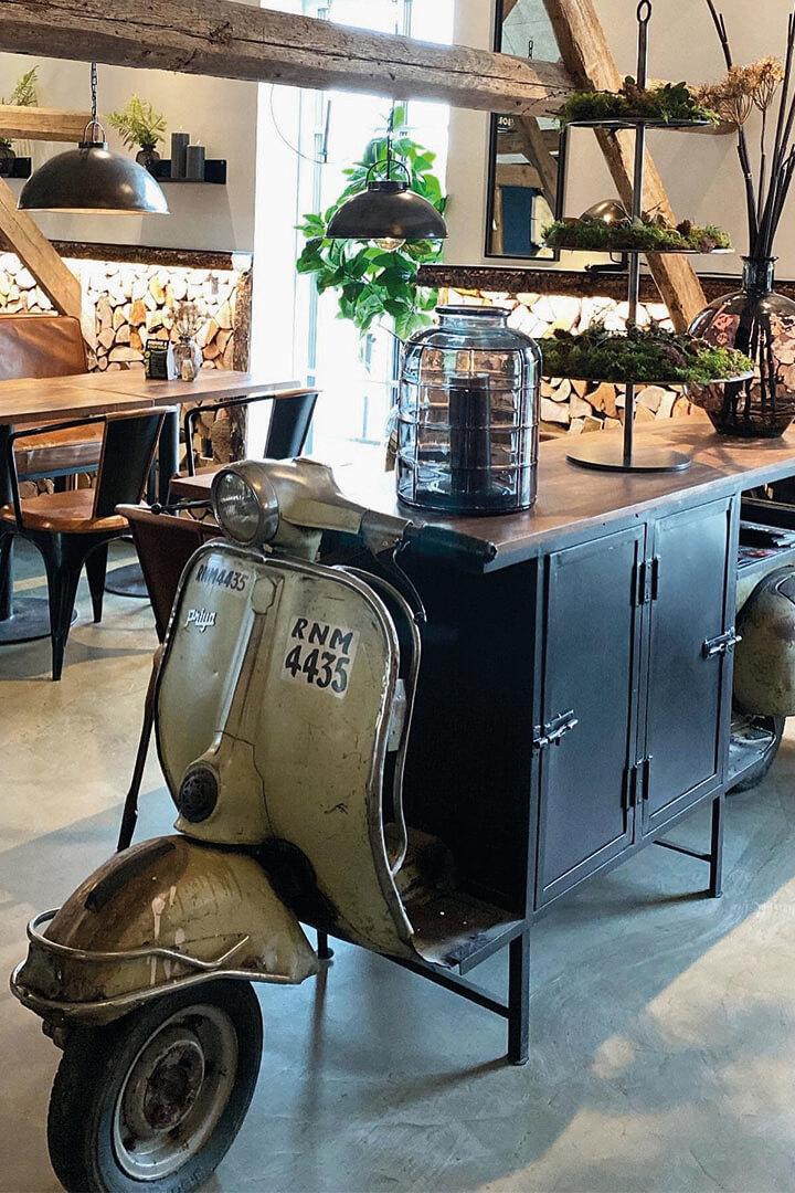 Skab blikfang med en kombination af sjove upcyclede møbler, eksklusive og rå møbler i læder og jern, blandet med møbler i genbrugstræ
